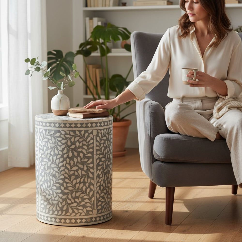 Bring refined artistry and soothing elegance into your home with this handcrafted Bone Inlay Boho Side Table. Its soft grey tones and intricate floral pattern create a calming, nature-inspired statement that blends effortlessly into modern, bohemian, minimalist, and contemporary interiors. Perfect for cozy reading corners, stylish living rooms, or serene bedrooms, this piece adds both beauty and function—ideal for your coffee mug, décor accents, books, or plants. Designed to elevate any space with a touch of luxury and global craftsmanship.