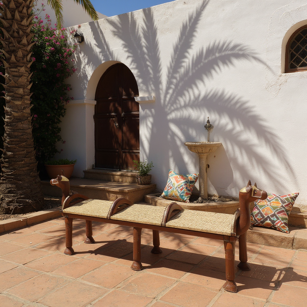 Bring a touch of Indian heritage and artistic charm to your home with this beautifully handcrafted animal-shaped seating bench. Featuring sculpted animal head details, woven natural seating, and elegant brass accents, this bench creates a warm cultural statement in courtyards, living rooms, patios, and entryways. Perfect for relaxed seating, décor styling, or adding a unique ethnic touch to modern and boho-inspired spaces.
