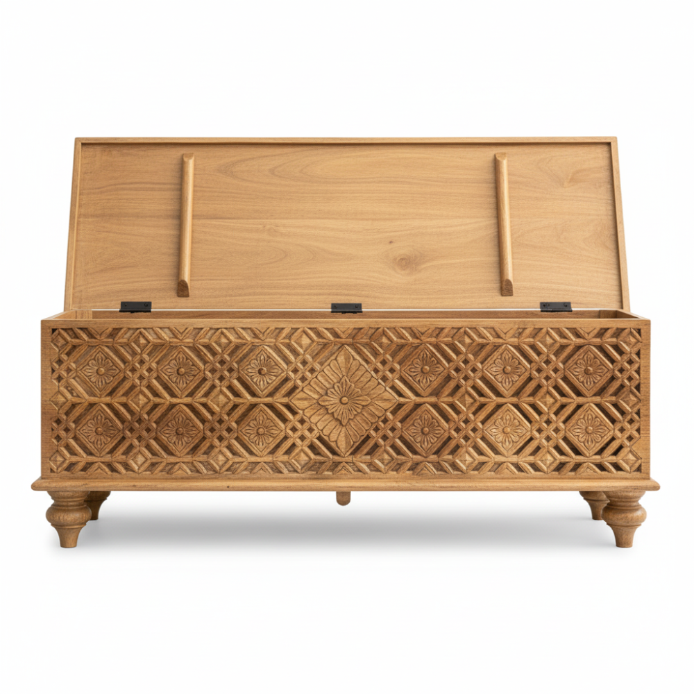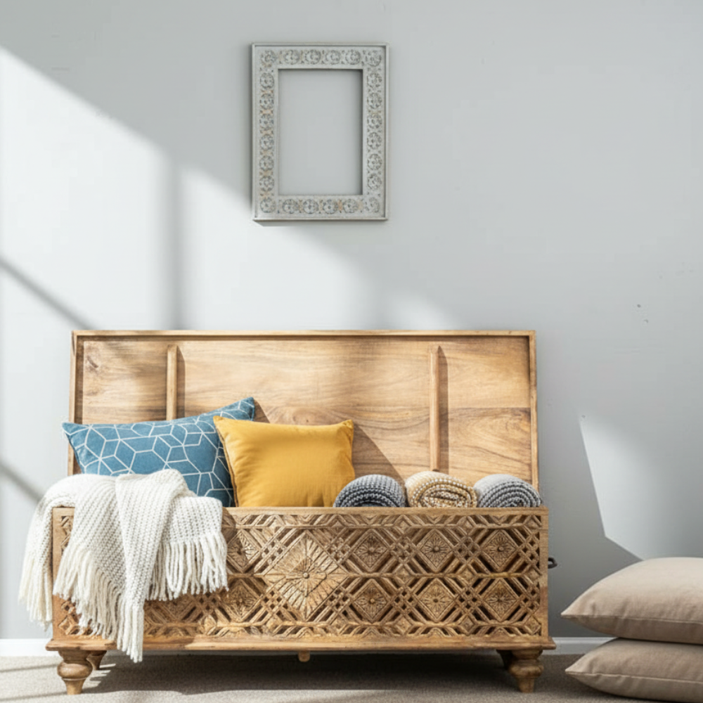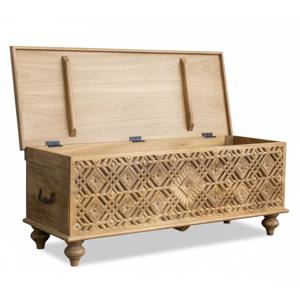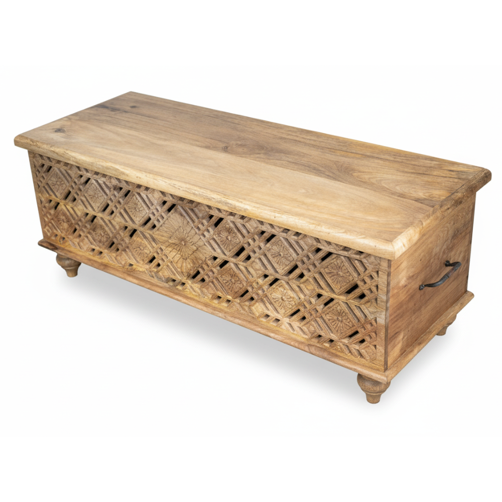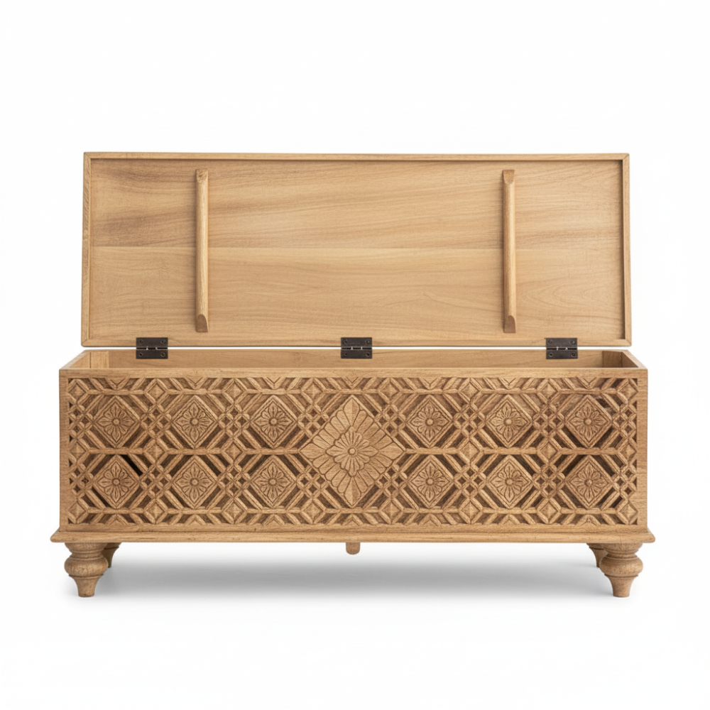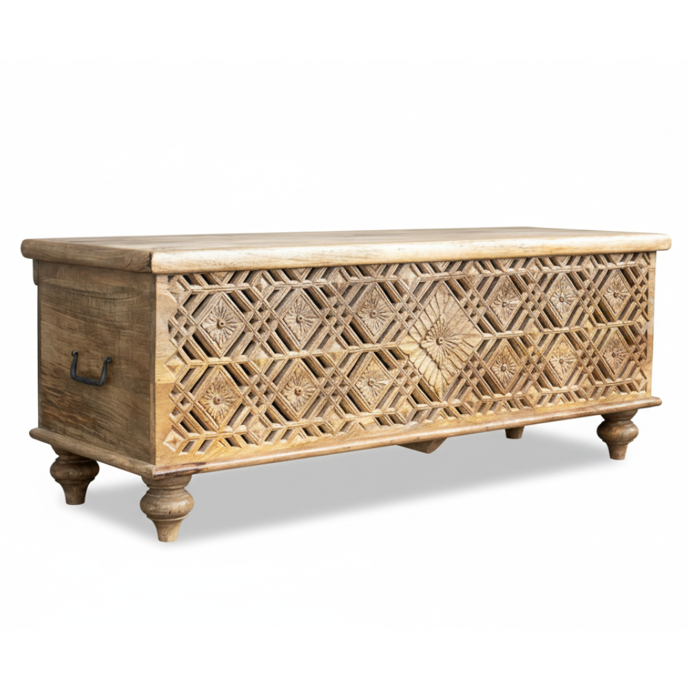 Infuse your home with timeless artisan craftsmanship through this Hand-Carved Natural Wooden Blanket Chest by Viratra Art Decor. Expertly handcrafted from solid mango wood, this beautiful trunk features intricate geometric carvings across the front panel — showcasing a perfect blend of traditional Indian artistry and modern boho charm.