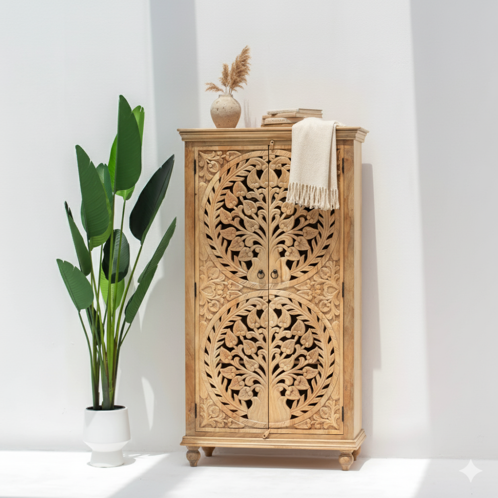 Bring timeless Indian craftsmanship into your home with this exquisite Hand-Carved Wooden Cabinet by Viratra Art Decor. Crafted from solid mango wood, this cabinet features intricately carved “Tree of Life” motifs on its double doors — a symbol of growth, strength, and harmony. The natural wood finish highlights the fine detailing, making it a stunning statement piece for any interior style — from bohemian to modern rustic.