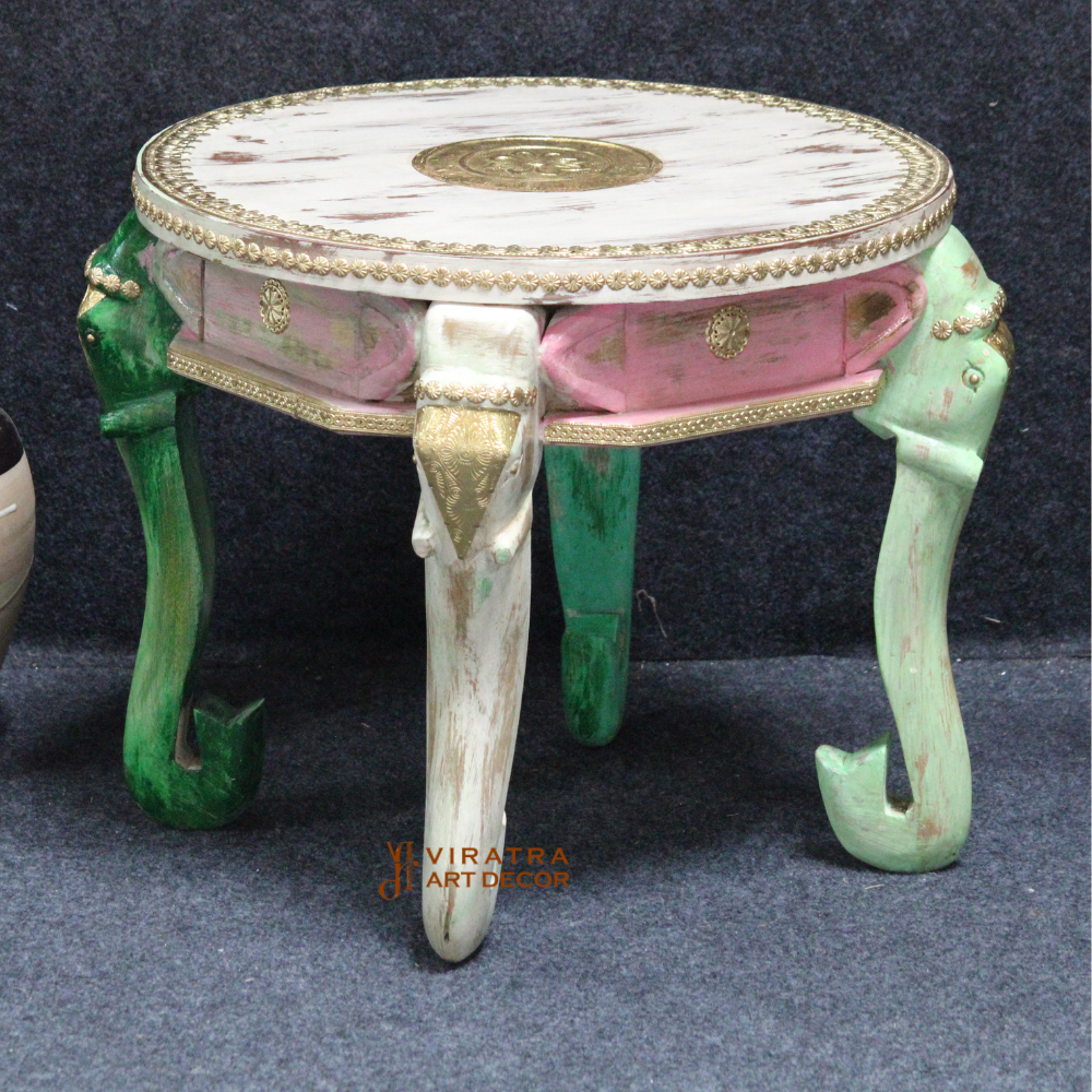 Features a round tabletop with exquisite elephant designs