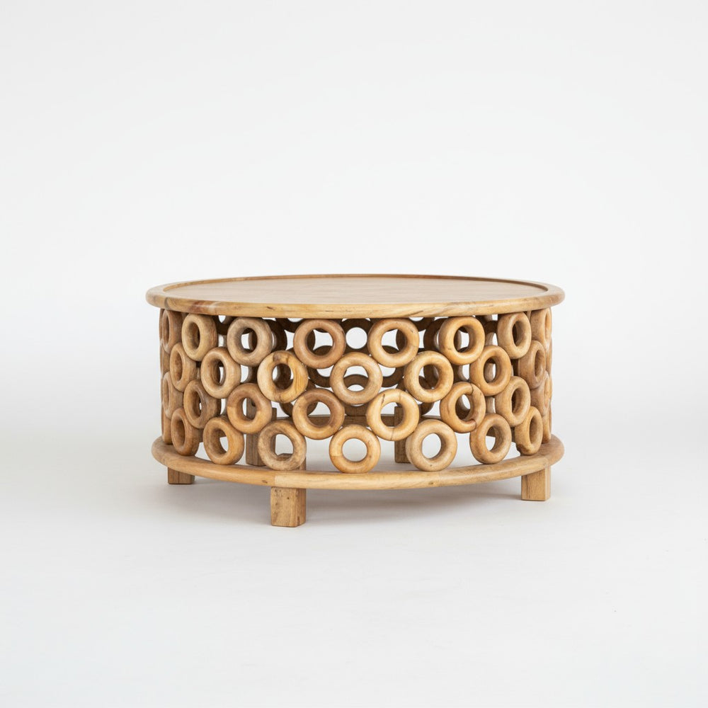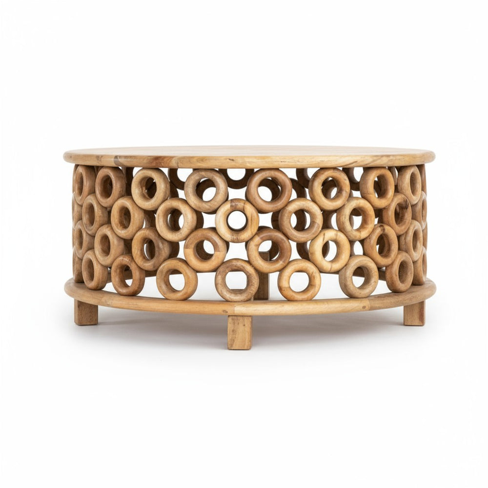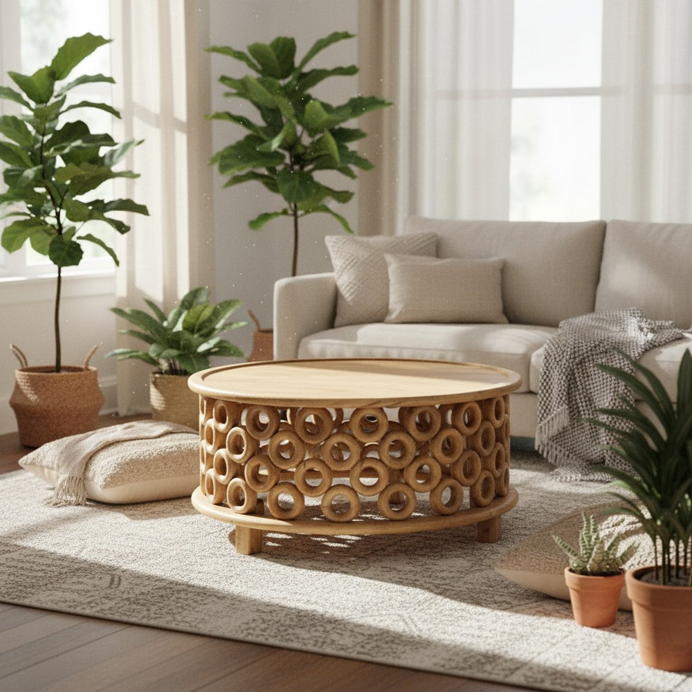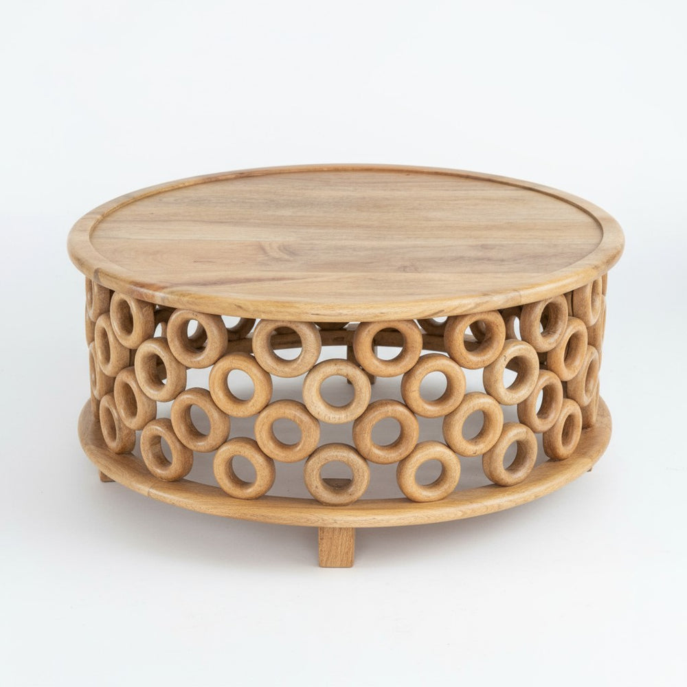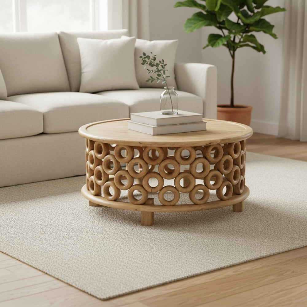 Bring an artistic touch to your living space with this stunning handcrafted coffee table from Viratra Art Decor. Made from solid mango wood, this round drum-style table features a distinctive circular ring carving design around the frame, giving it a bold yet elegant look. The natural finish enhances the wood’s grain and texture, making each piece unique. Perfect for bohemian, rustic, or contemporary interiors, this table adds character and craftsmanship to any setting.