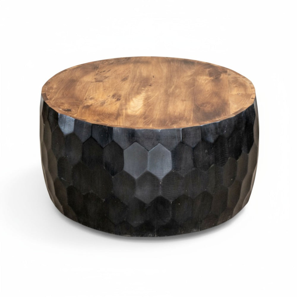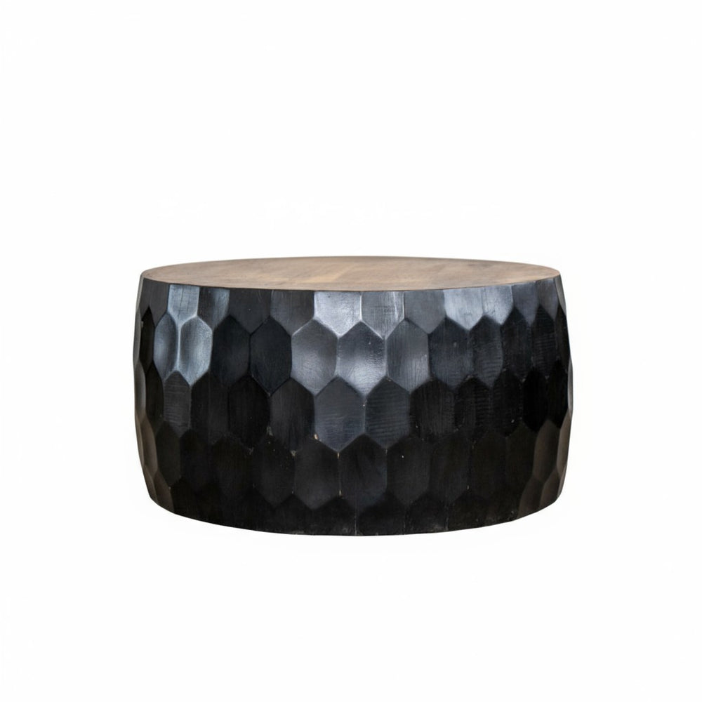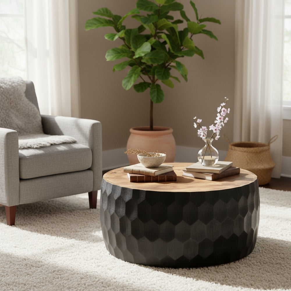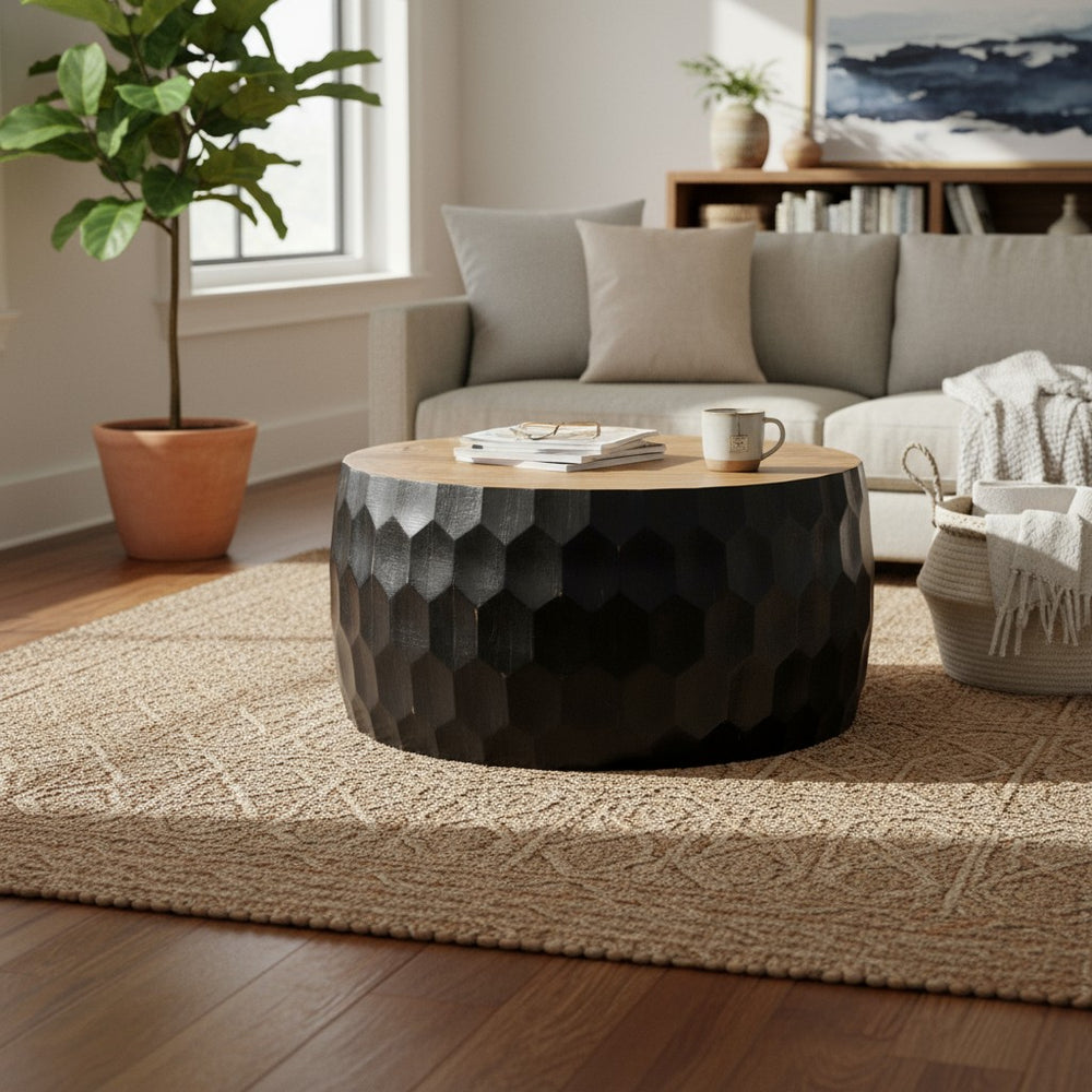 Elevate your living room with this bold handcrafted round coffee table by Viratra Art Decor. Made from premium solid mango wood, this table features a unique hand-carved honeycomb texture in a rich black finish paired with a contrasting natural wood top. Its modern yet rustic appeal makes it the perfect centerpiece for contemporary, boho, or industrial interiors.