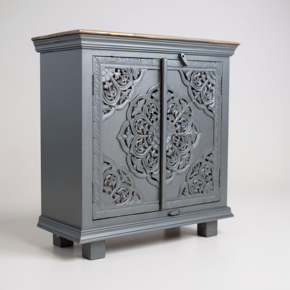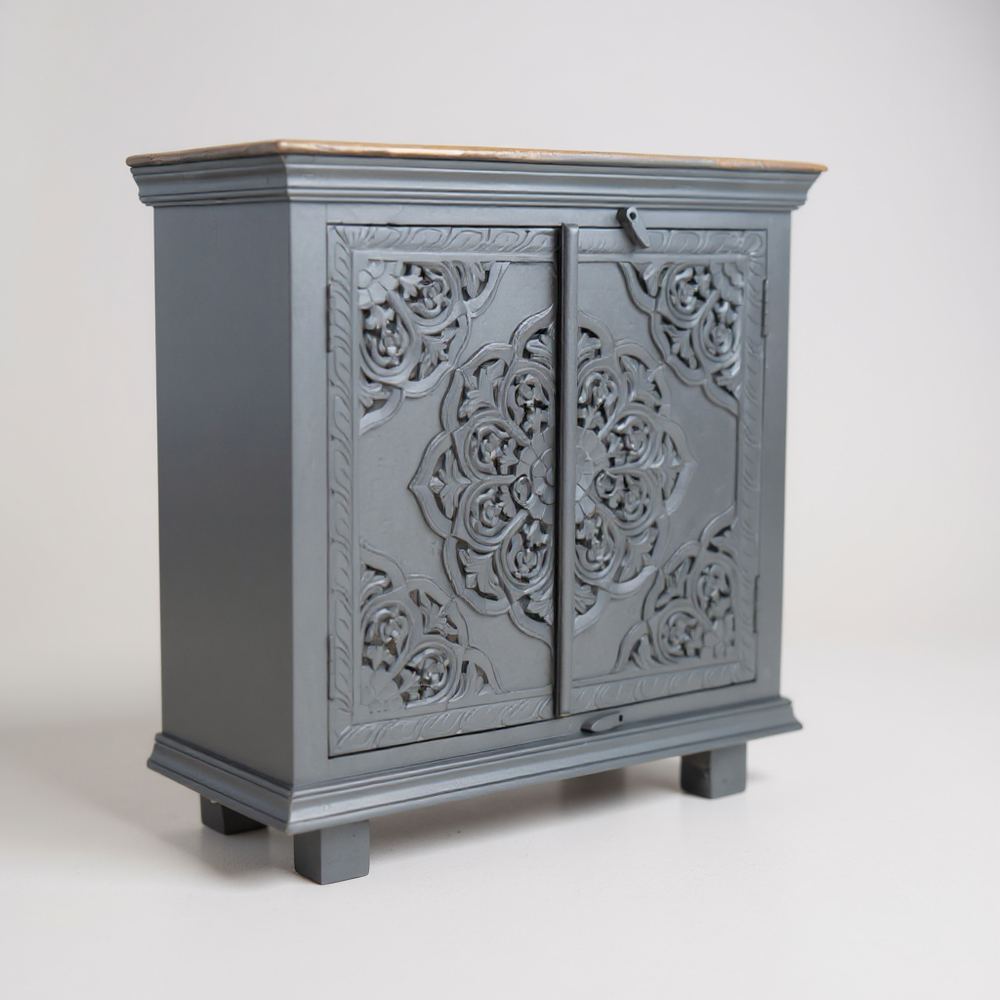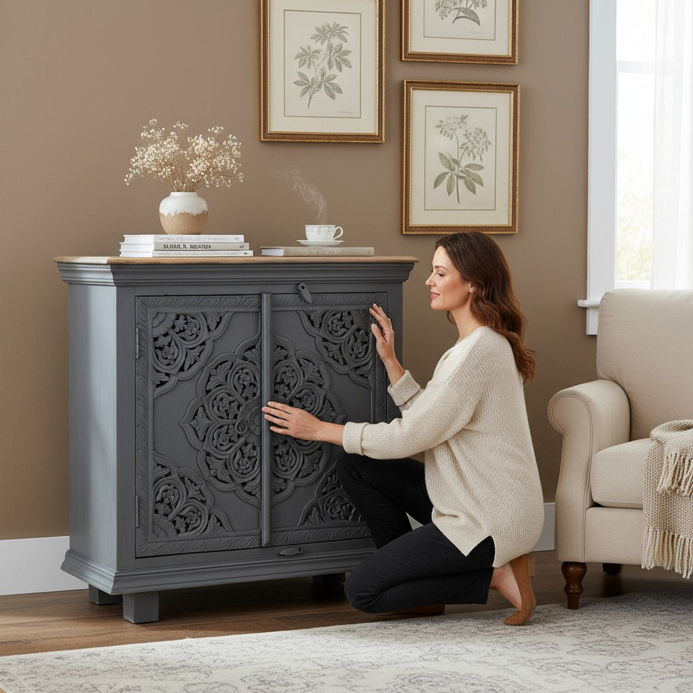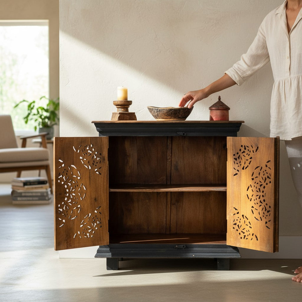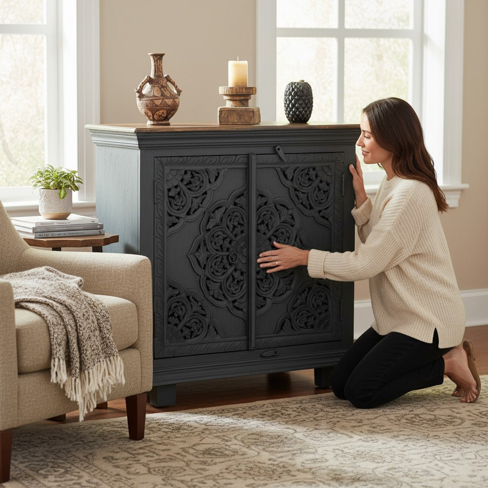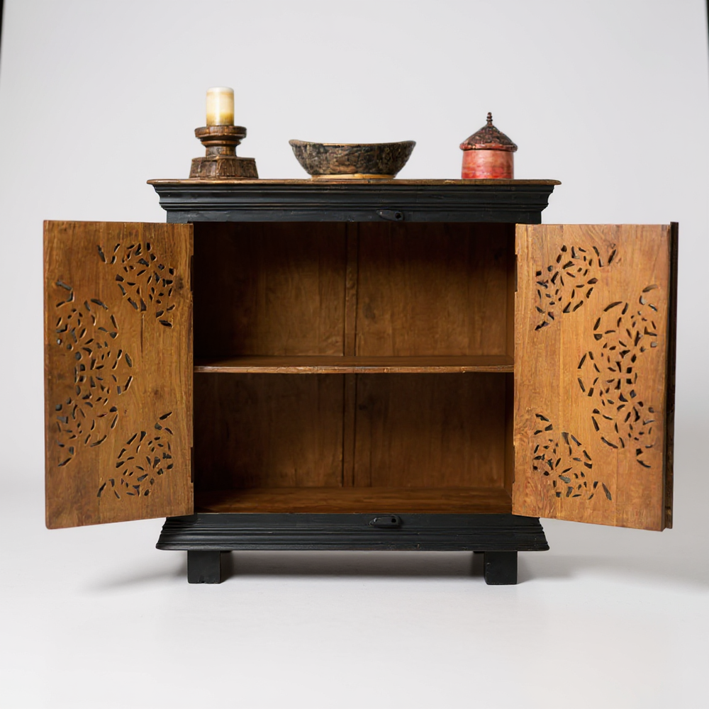Bring timeless Indian craftsmanship into your home with this stunning hand-carved black wooden cabinet by Viratra Art Decor. Expertly made from solid mango wood, this piece showcases a beautifully detailed floral mandala design on its double doors, adding elegance and texture to any interior.