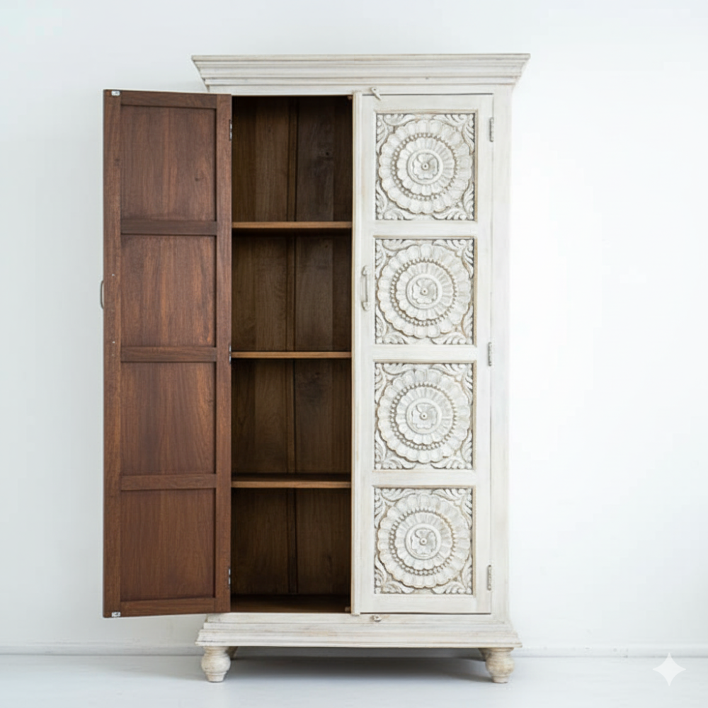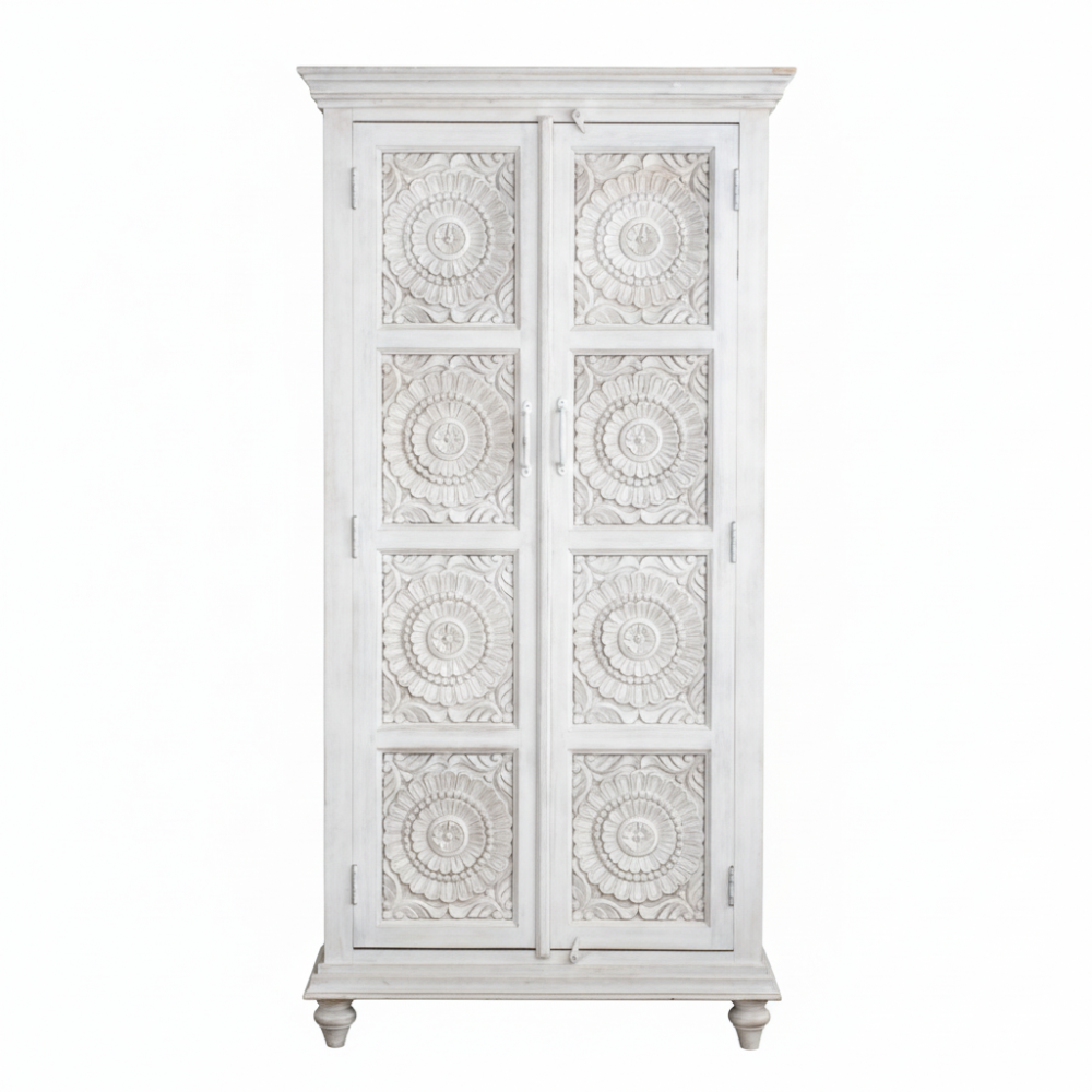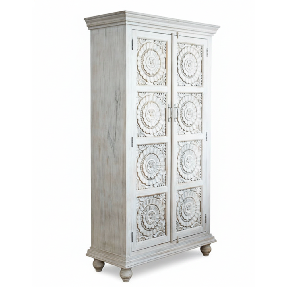 Bring timeless Indian craftsmanship into your home with this exquisite hand-carved tallboy cabinet by Viratra Art Decor. Expertly crafted from durable solid mango wood, this tall storage unit features intricately carved floral mandala patterns on each panel, symbolizing harmony and balance. The soft whitewashed finish highlights the delicate detailing, giving it a serene and elegant appeal perfect for both modern and traditional interiors.