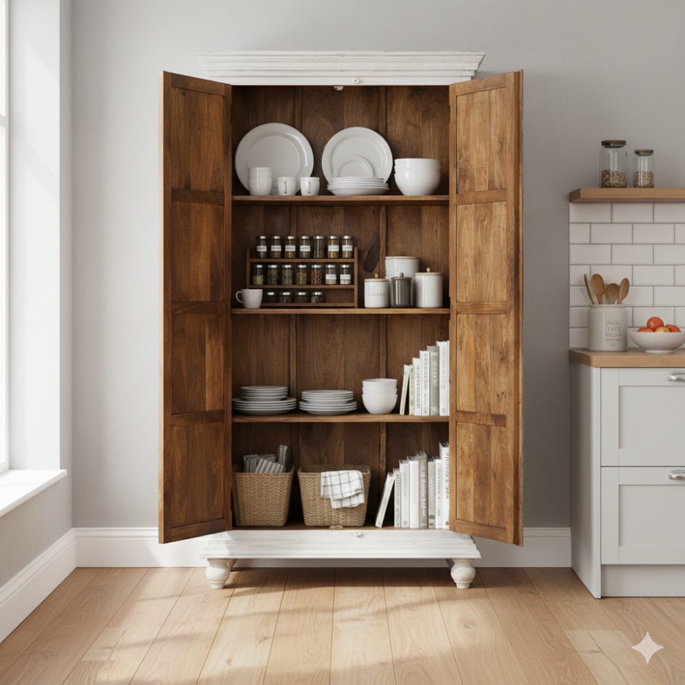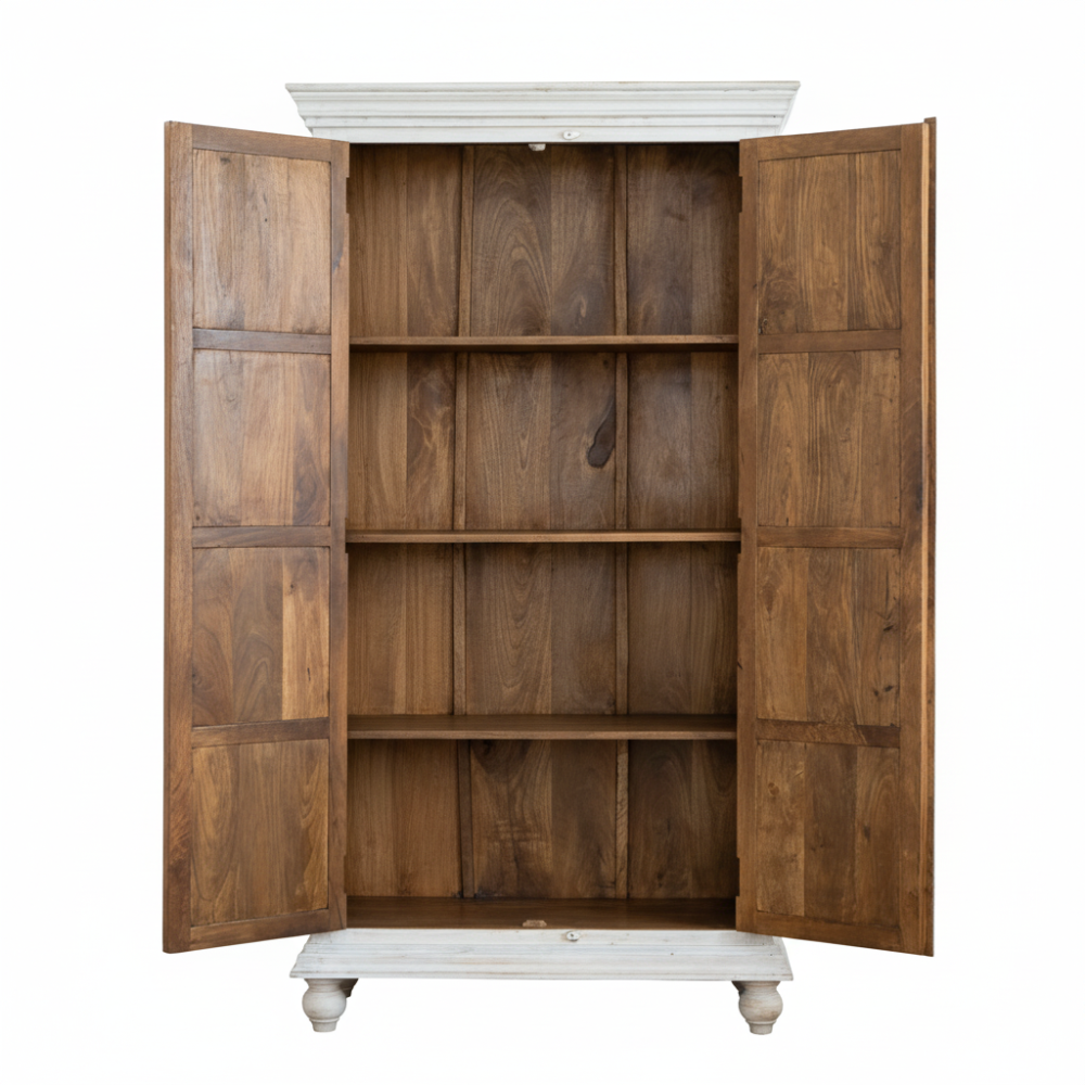 Behind the double doors lies a spacious interior with multiple fixed shelves, providing ample room for organizing clothes, linens, or home essentials. The contrast between the natural wood interior and the white exterior enhances its rustic charm and artisan character.