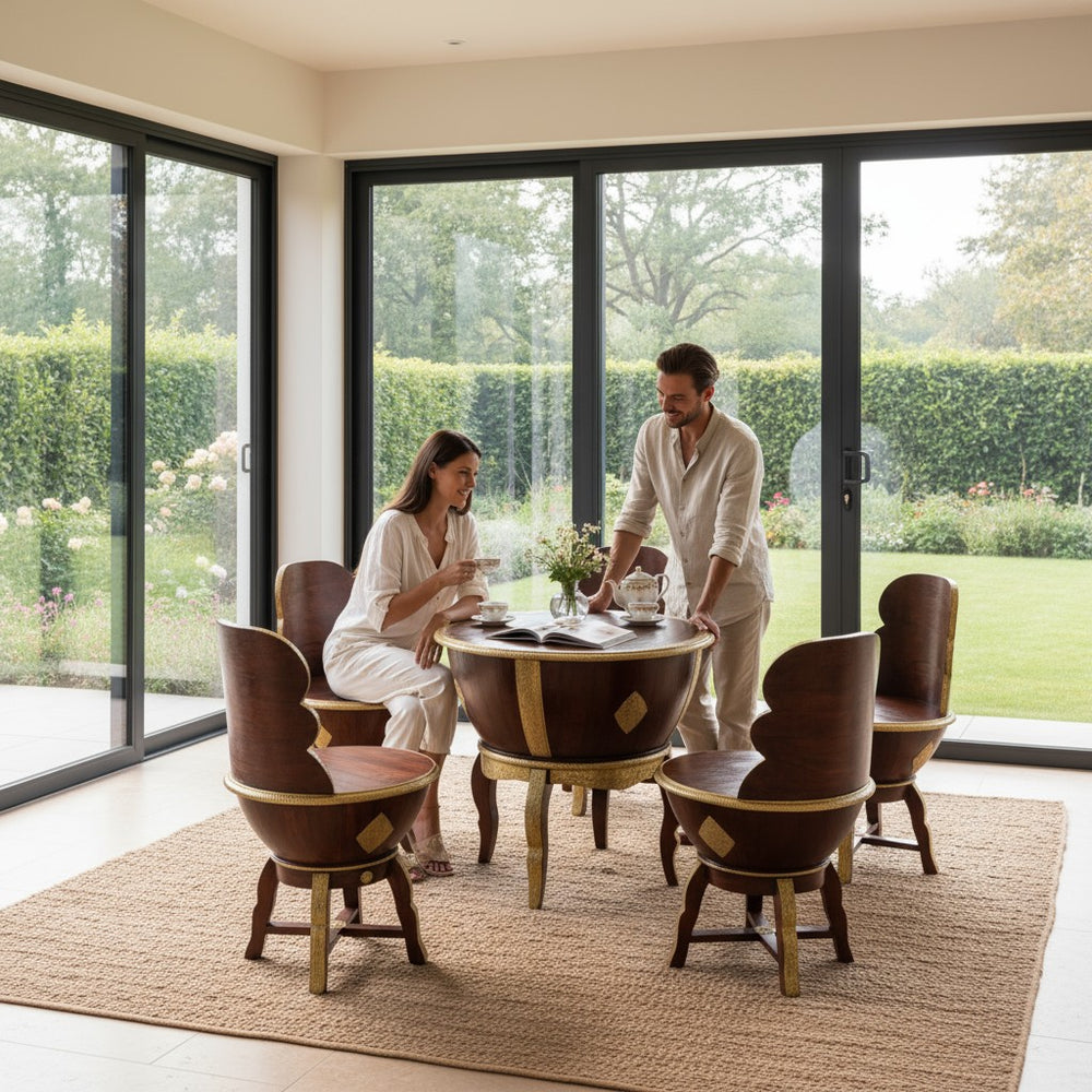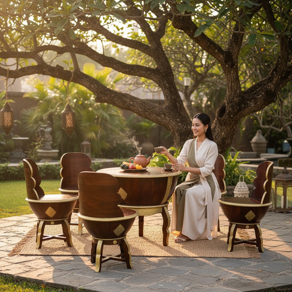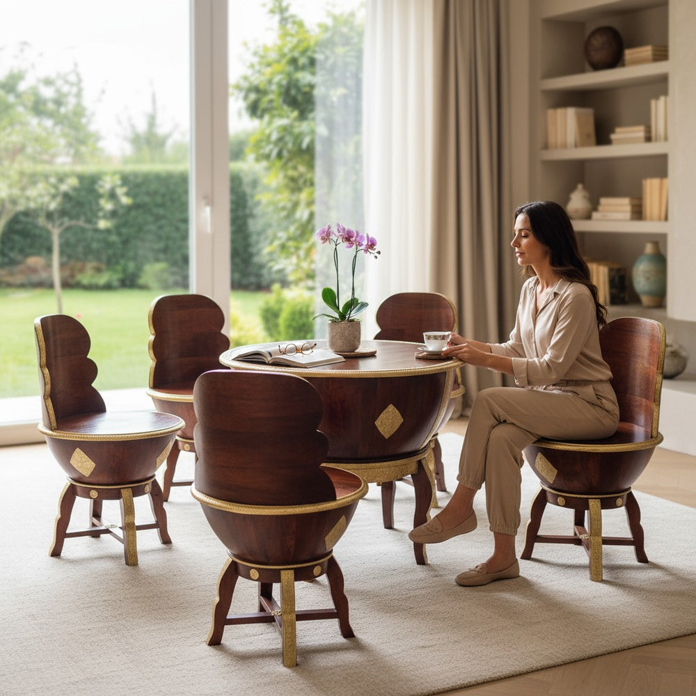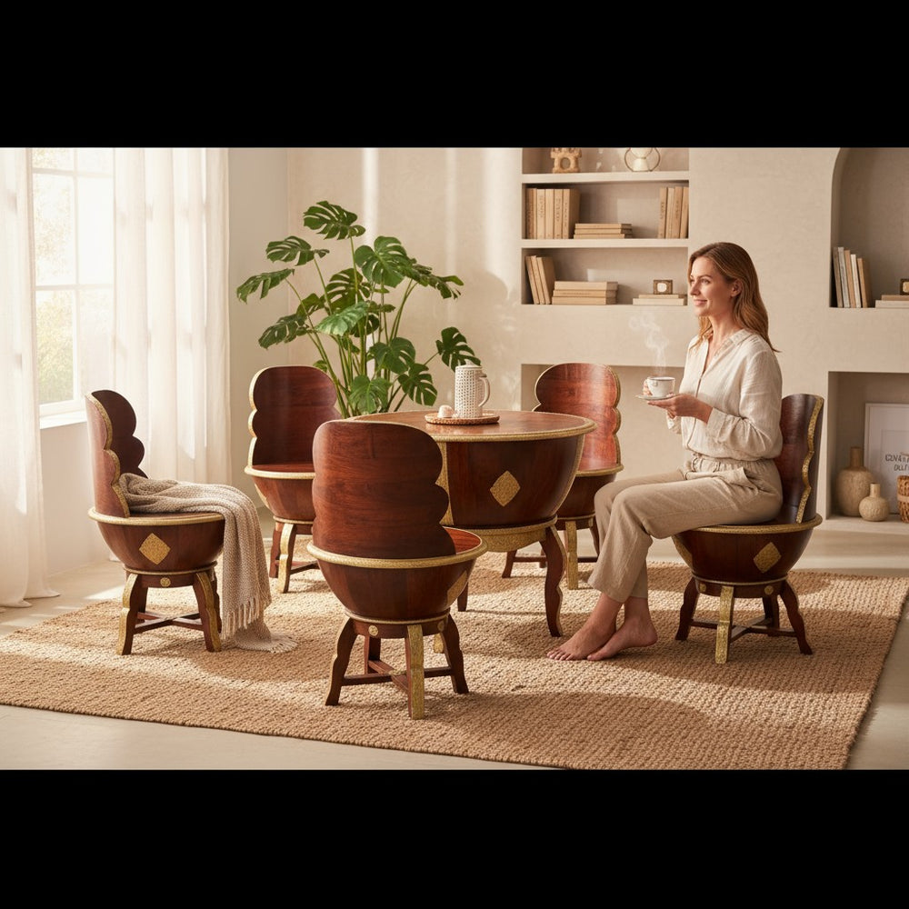 Elevate your dining or lounging experience with this exquisitely handcrafted wooden coffee table set, designed to blend luxury with everyday comfort. Perfect for modern, bohemian, and traditional homes alike, this set creates a warm and inviting ambiance for tea-time conversations, weekend brunches, or cozy indoor gatherings. The sculpted bowl-shaped chairs offer a unique royal seating feel, while the detailed gold accents bring an artisanal charm that transforms any space into a sophisticated retreat. Ideal for sunrooms, patios, living areas, or stylish breakfast corners—this set becomes the heart of every meaningful conversation.