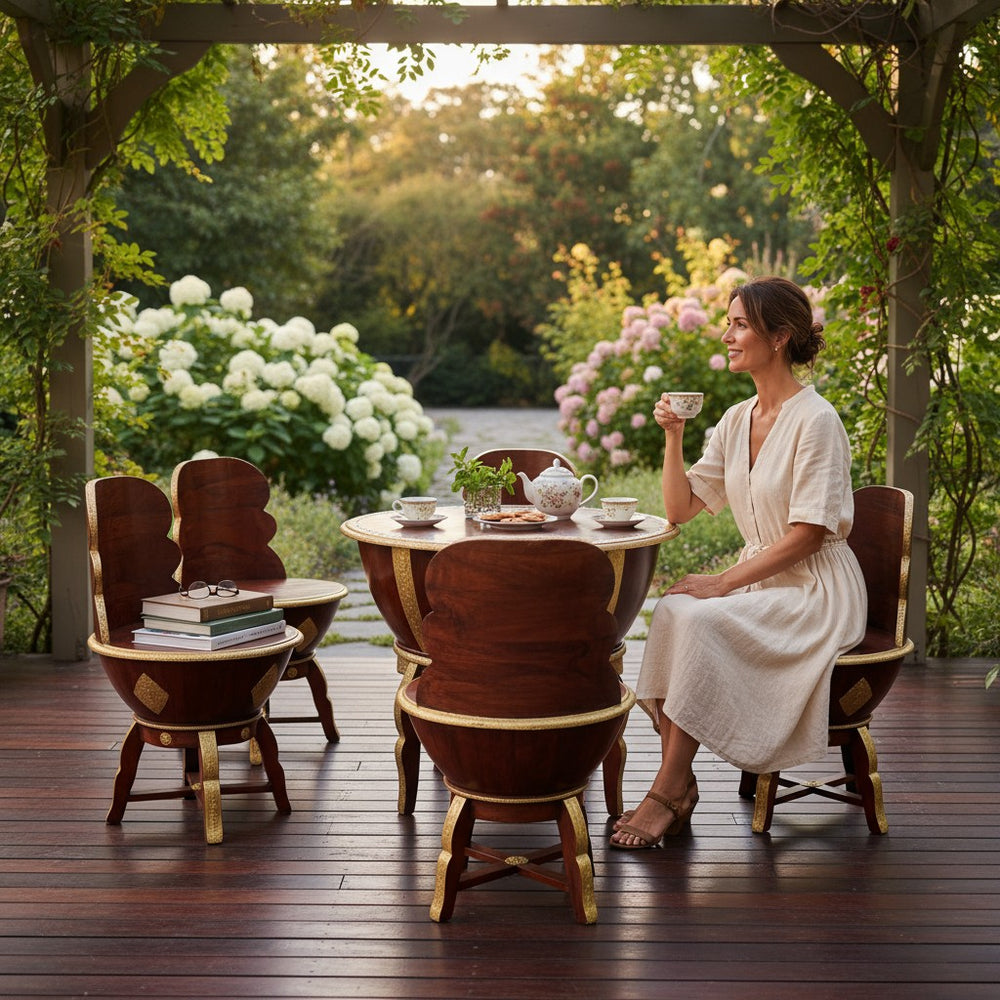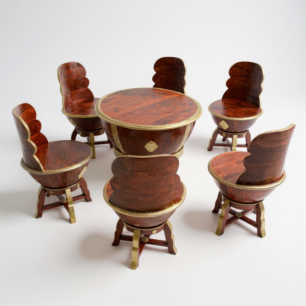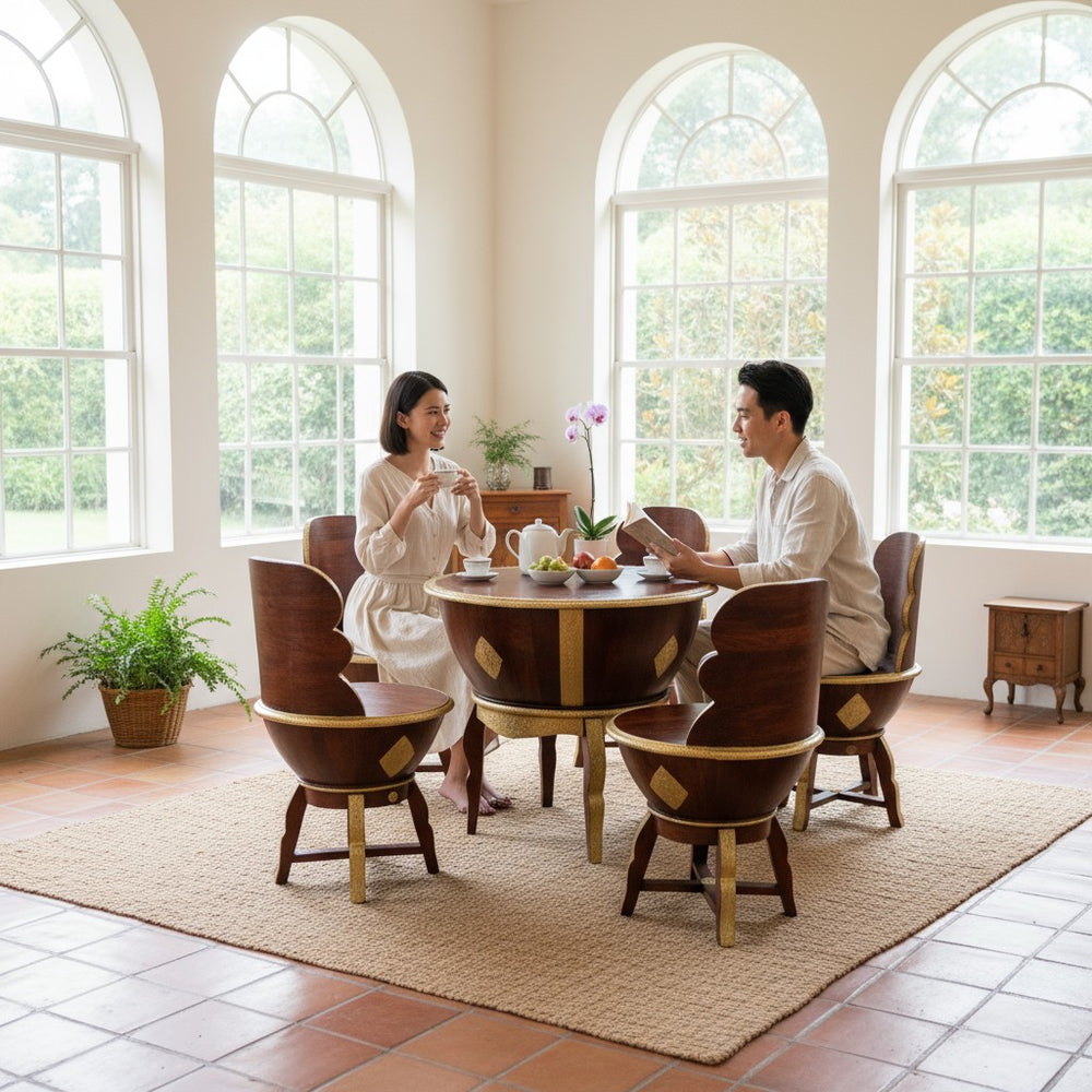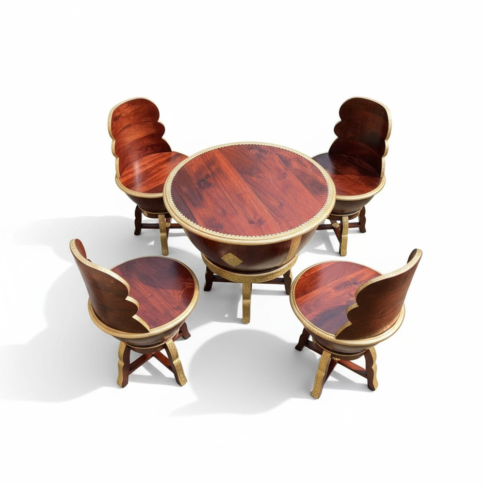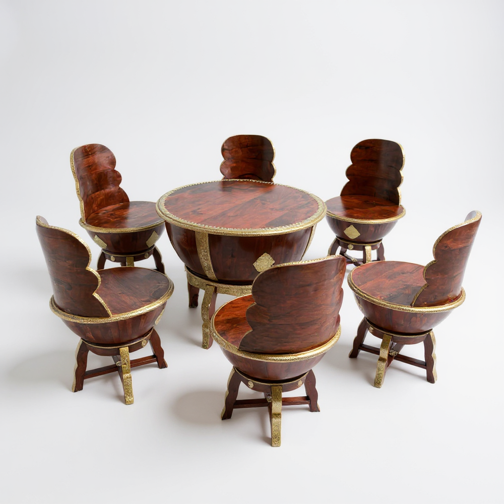 Elevate your dining or lounging experience with this exquisitely handcrafted wooden coffee table set, designed to blend luxury with everyday comfort. Perfect for modern, bohemian, and traditional homes alike, this set creates a warm and inviting ambiance for tea-time conversations, weekend brunches, or cozy indoor gatherings. The sculpted bowl-shaped chairs offer a unique royal seating feel, while the detailed gold accents bring an artisanal charm that transforms any space into a sophisticated retreat. Ideal for sunrooms, patios, living areas, or stylish breakfast corners—this set becomes the heart of every meaningful conversation.