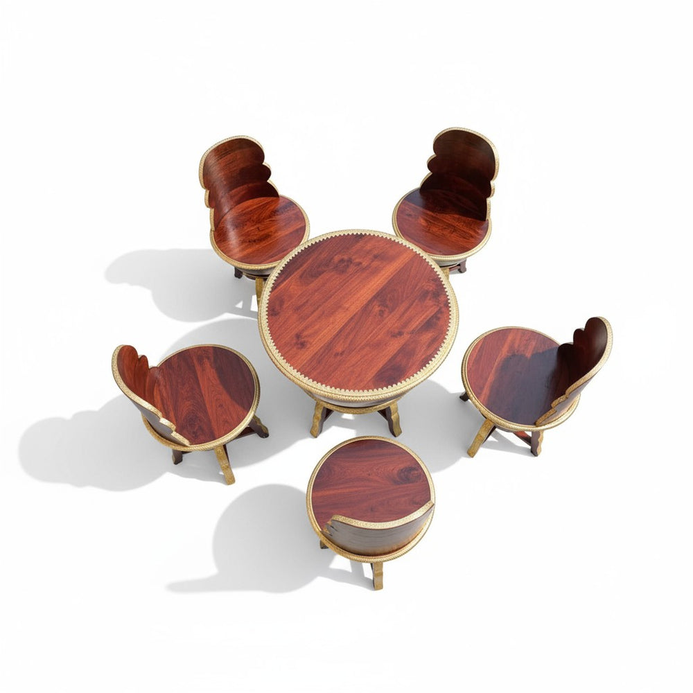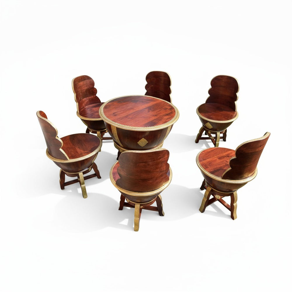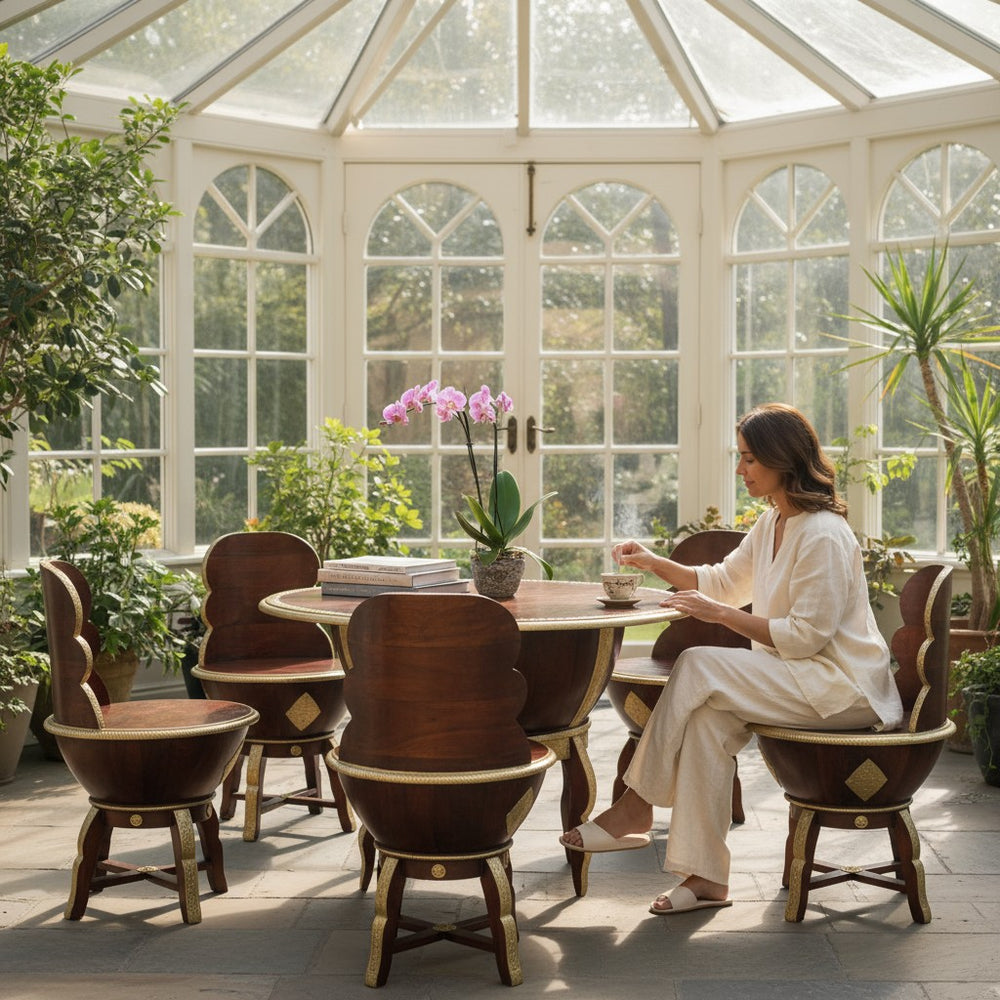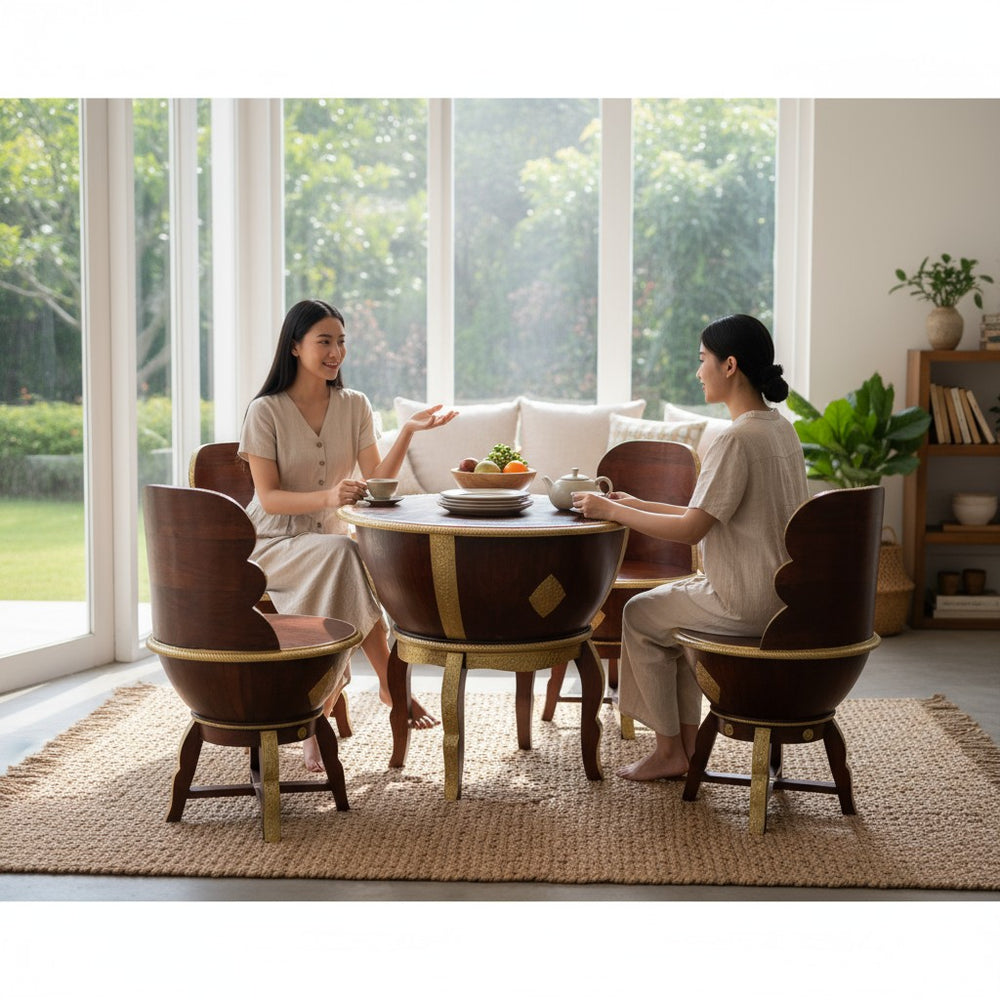 Elevate your dining or lounging experience with this exquisitely handcrafted wooden coffee table set, designed to blend luxury with everyday comfort. Perfect for modern, bohemian, and traditional homes alike, this set creates a warm and inviting ambiance for tea-time conversations, weekend brunches, or cozy indoor gatherings. The sculpted bowl-shaped chairs offer a unique royal seating feel, while the detailed gold accents bring an artisanal charm that transforms any space into a sophisticated retreat. Ideal for sunrooms, patios, living areas, or stylish breakfast corners—this set becomes the heart of every meaningful conversation.