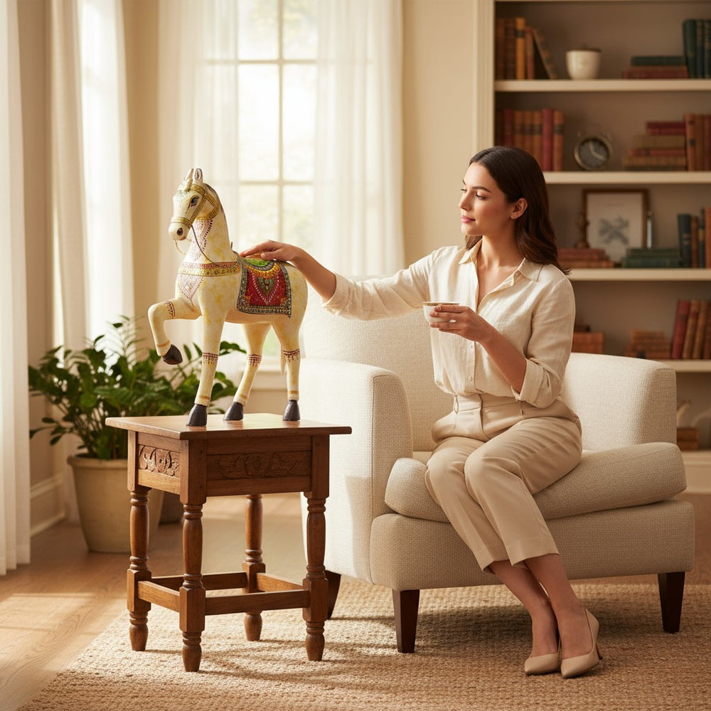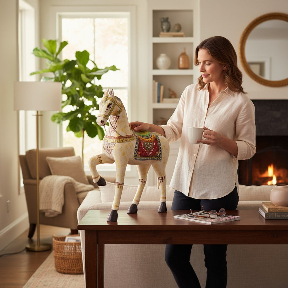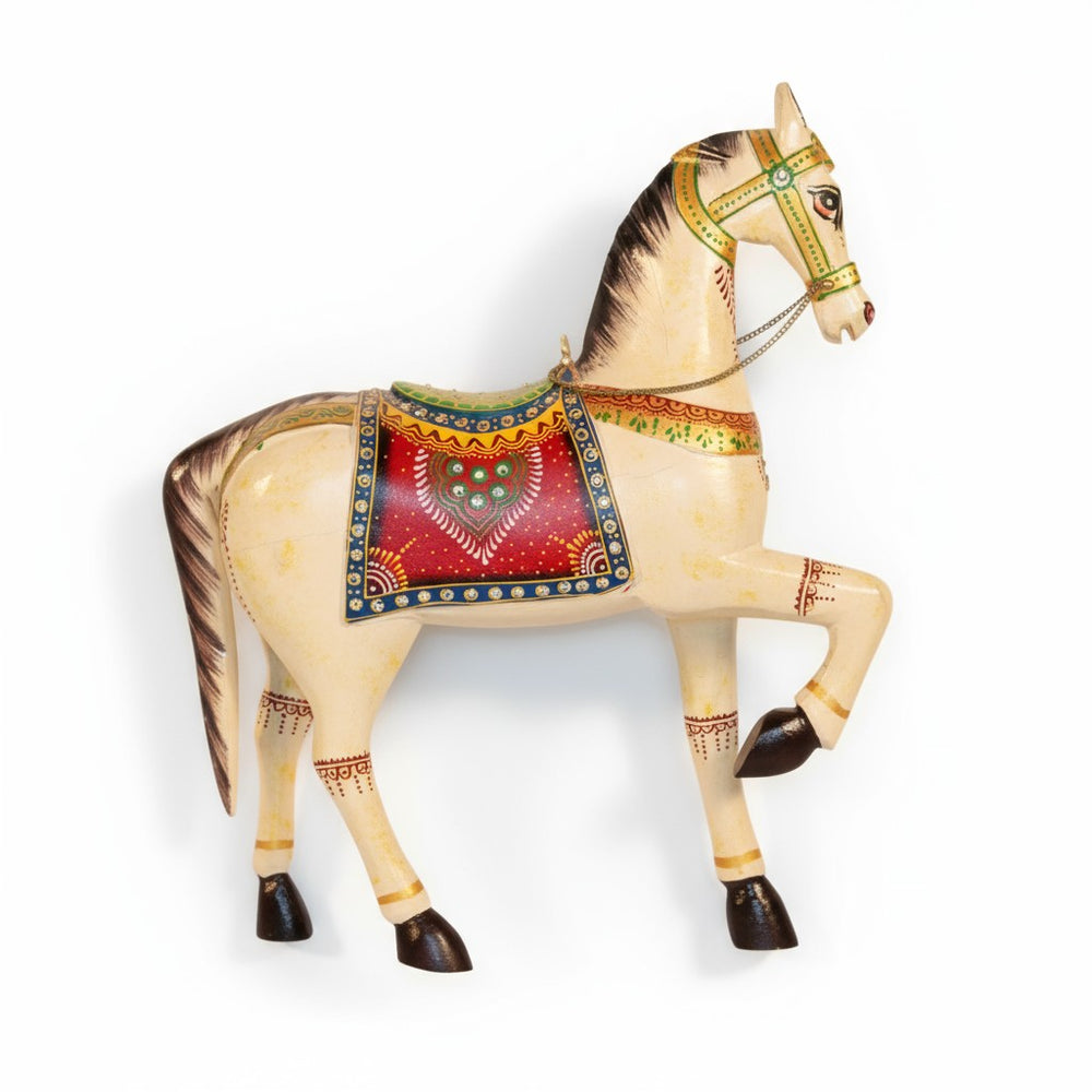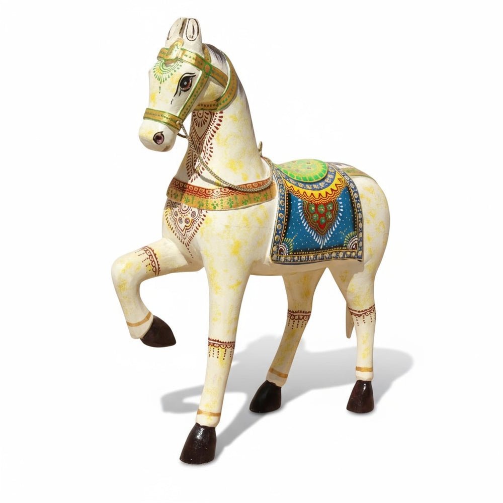 Bring home a touch of royal Indian artistry with this beautifully handcrafted horse statue, adorned with intricate hand-painted details and vibrant traditional patterns. Perfect for living rooms, consoles, study tables, or entryways, it adds cultural charm, elegance, and a statement-making decorative presence to any modern or classic interior.