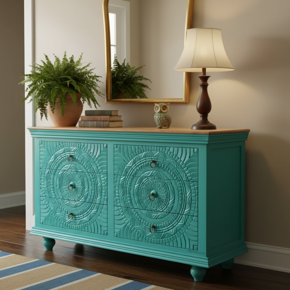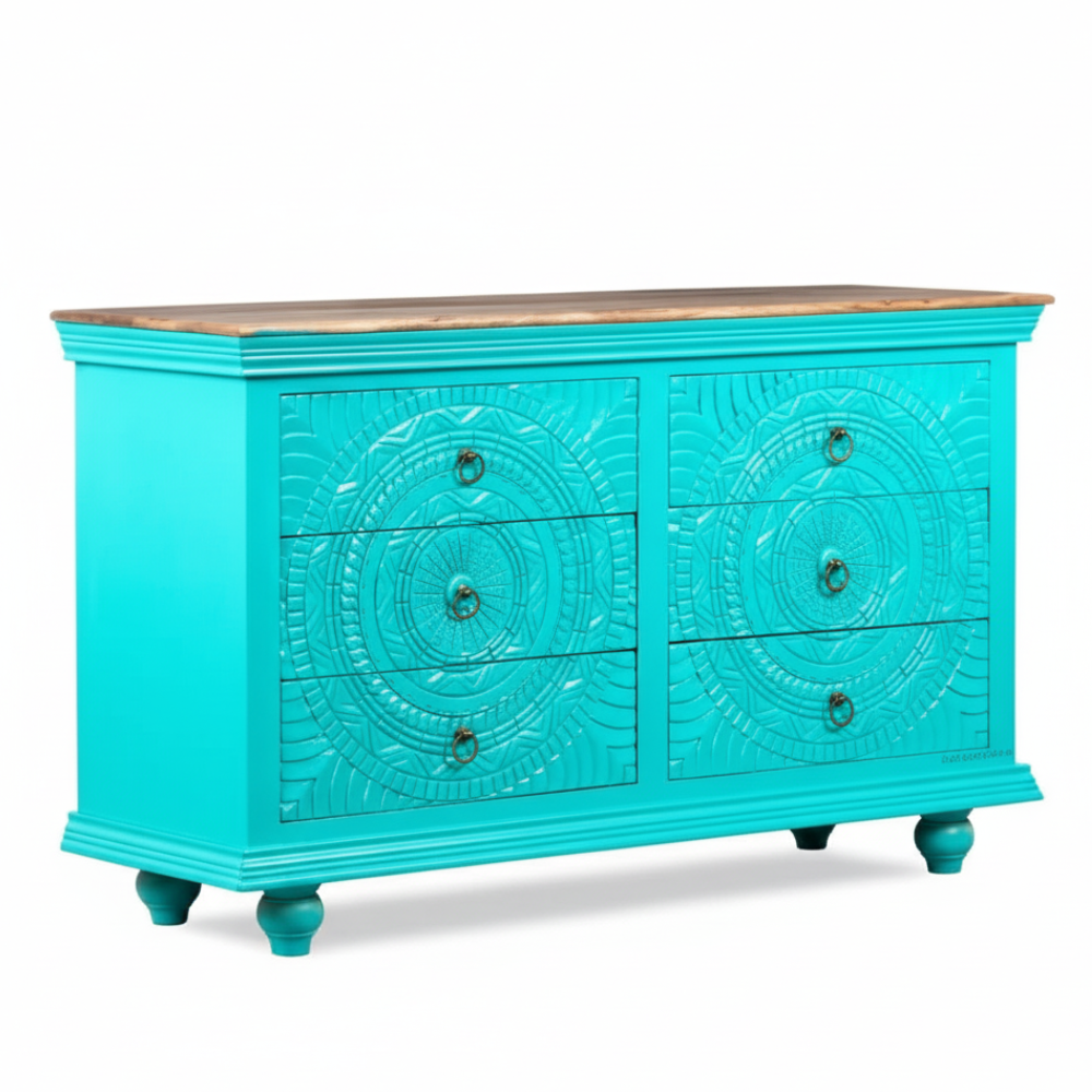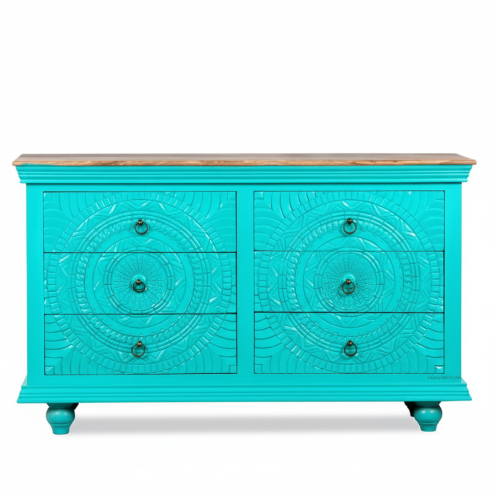 Brighten your space with this bold and artistic drawer cabinet, designed to bring life and personality to any room. The eye-catching turquoise finish paired with intricate hand-carved circular patterns creates a stunning statement piece perfect for eclectic, boho, contemporary, and modern global homes. Ideal for storing essentials while adding a vibrant decorative touch, this cabinet effortlessly enhances bedrooms, living rooms, hallways, and creative spaces.