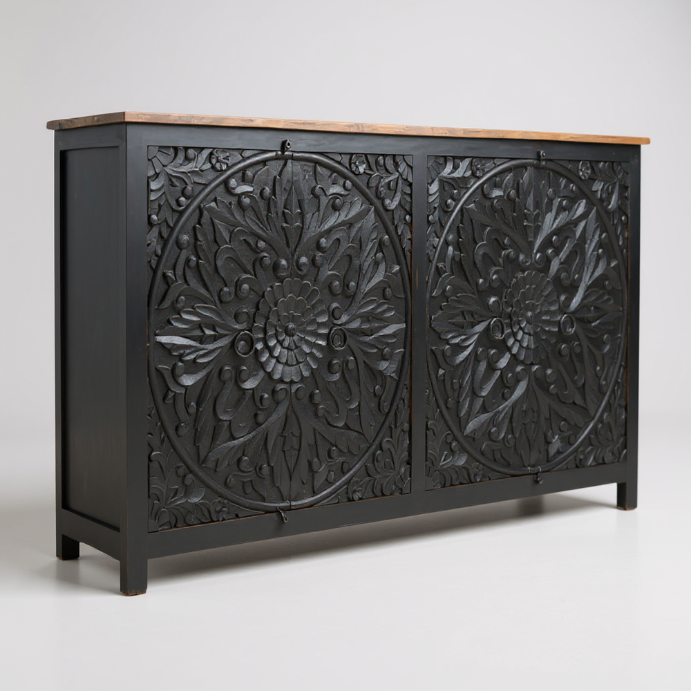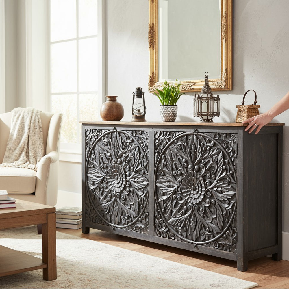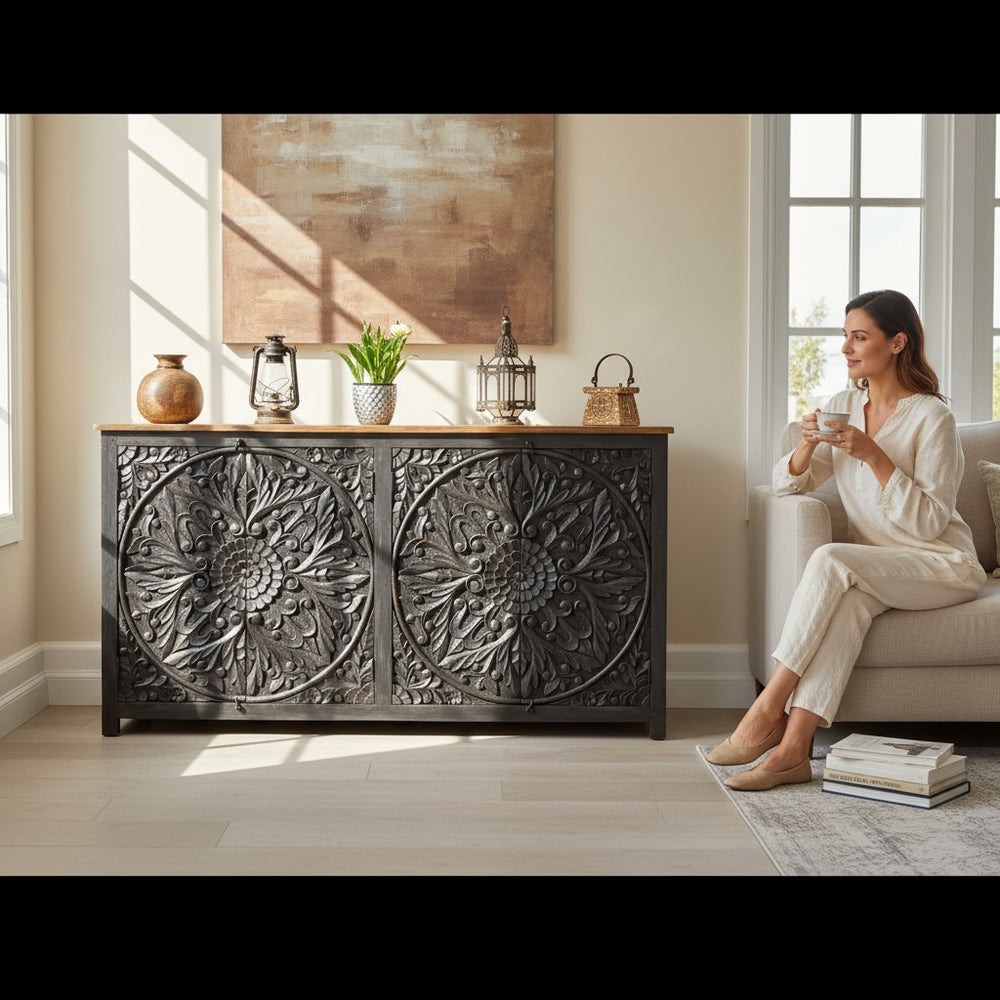 Finished in a rich charcoal black tone with a contrasting natural wood top, this sideboard brings together rustic texture and modern sophistication. Behind the beautifully carved doors lies a spacious storage area with a central shelf — ideal for organizing dinnerware, linens, or everyday essentials.
