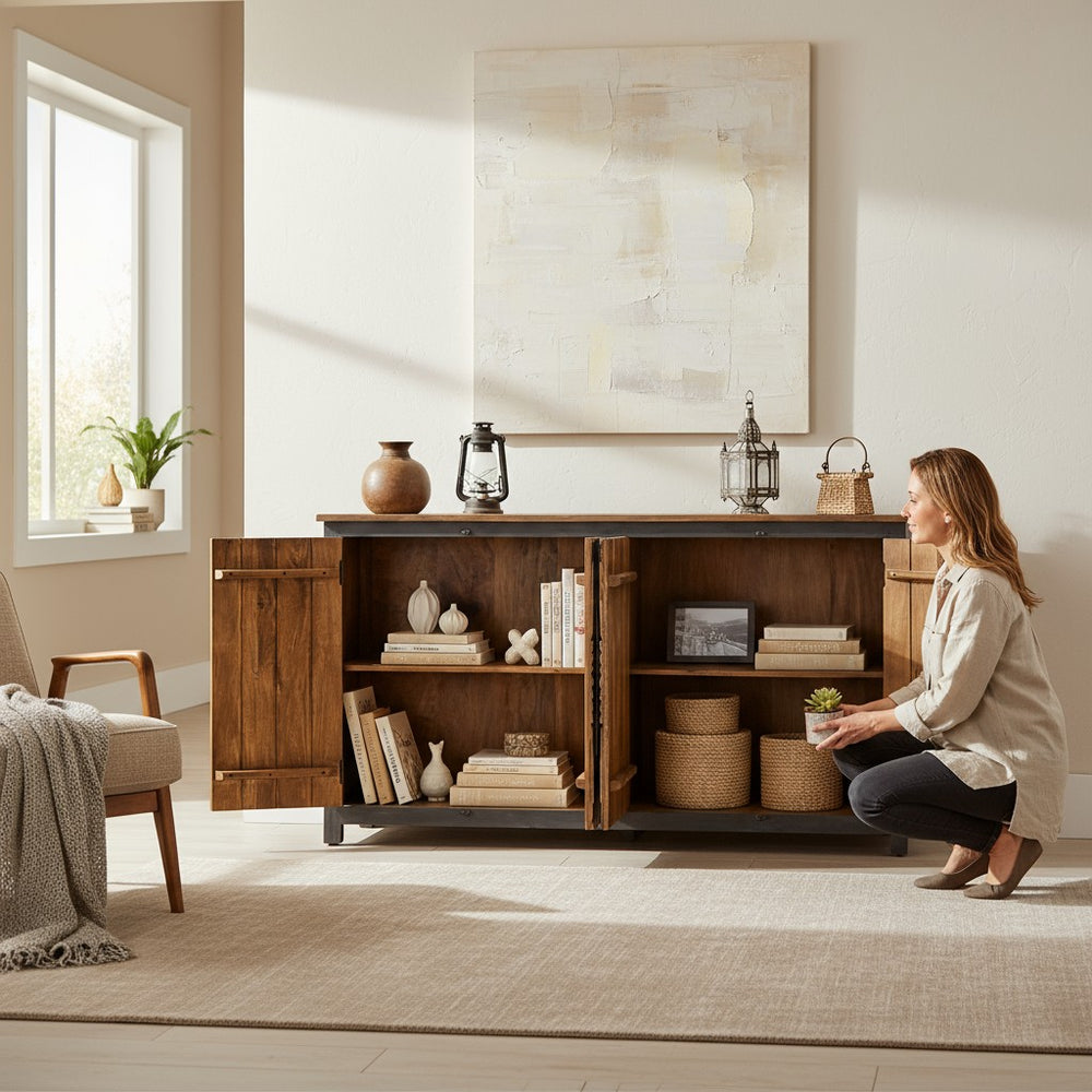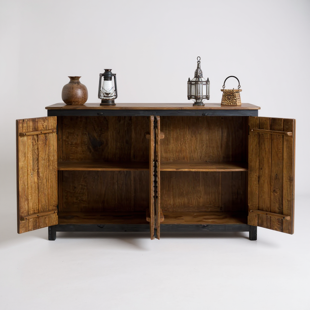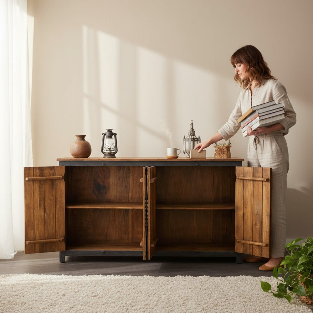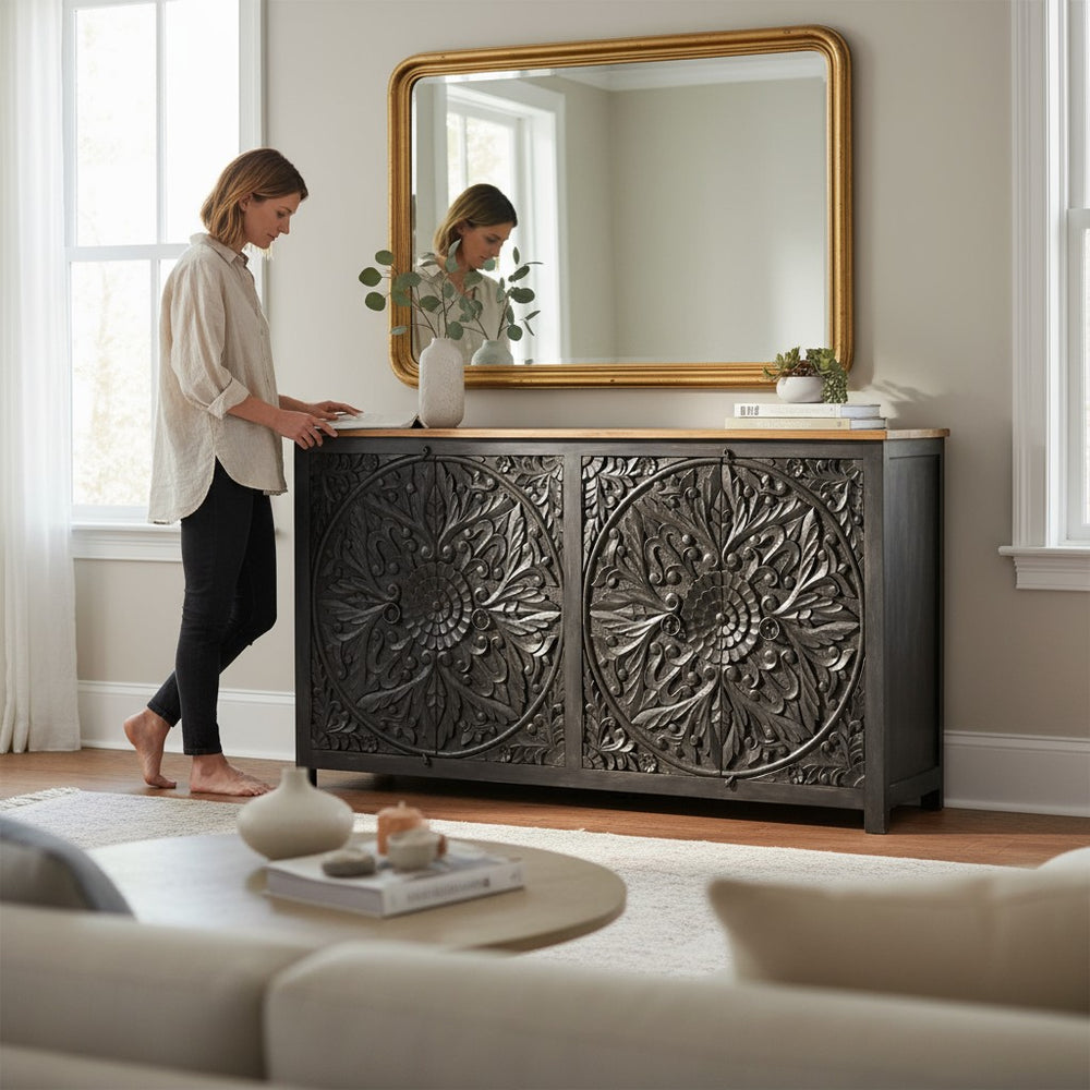 Finished in a rich charcoal black tone with a contrasting natural wood top, this sideboard brings together rustic texture and modern sophistication. Behind the beautifully carved doors lies a spacious storage area with a central shelf — ideal for organizing dinnerware, linens, or everyday essentials.