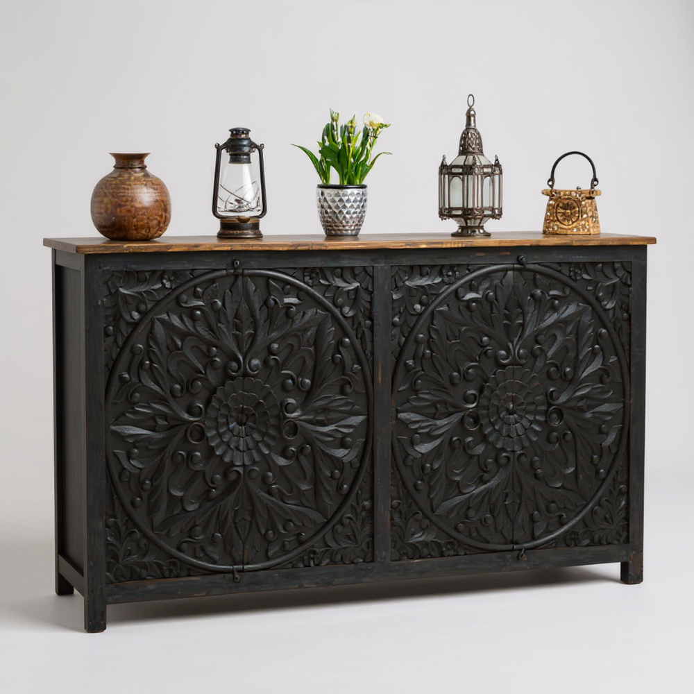 Elevate your home with this stunning Hand Carved Black Mandala Sideboard, a masterpiece of craftsmanship and design. Expertly handmade from solid mango wood, this statement piece features intricately carved twin circular mandala floral patterns on the front doors, symbolizing harmony and artistry in traditional Indian decor.