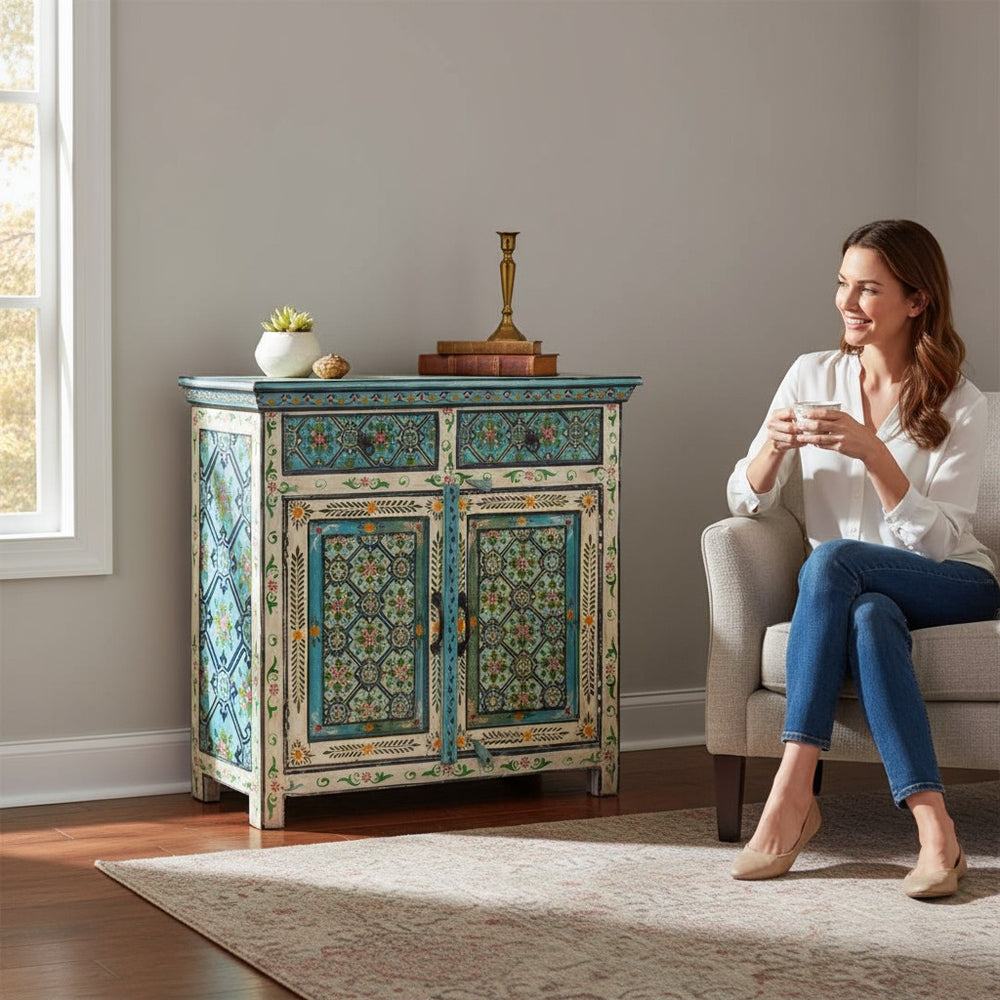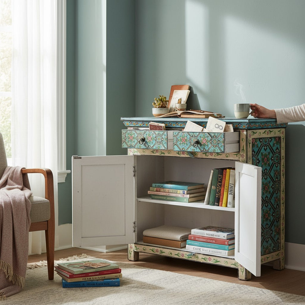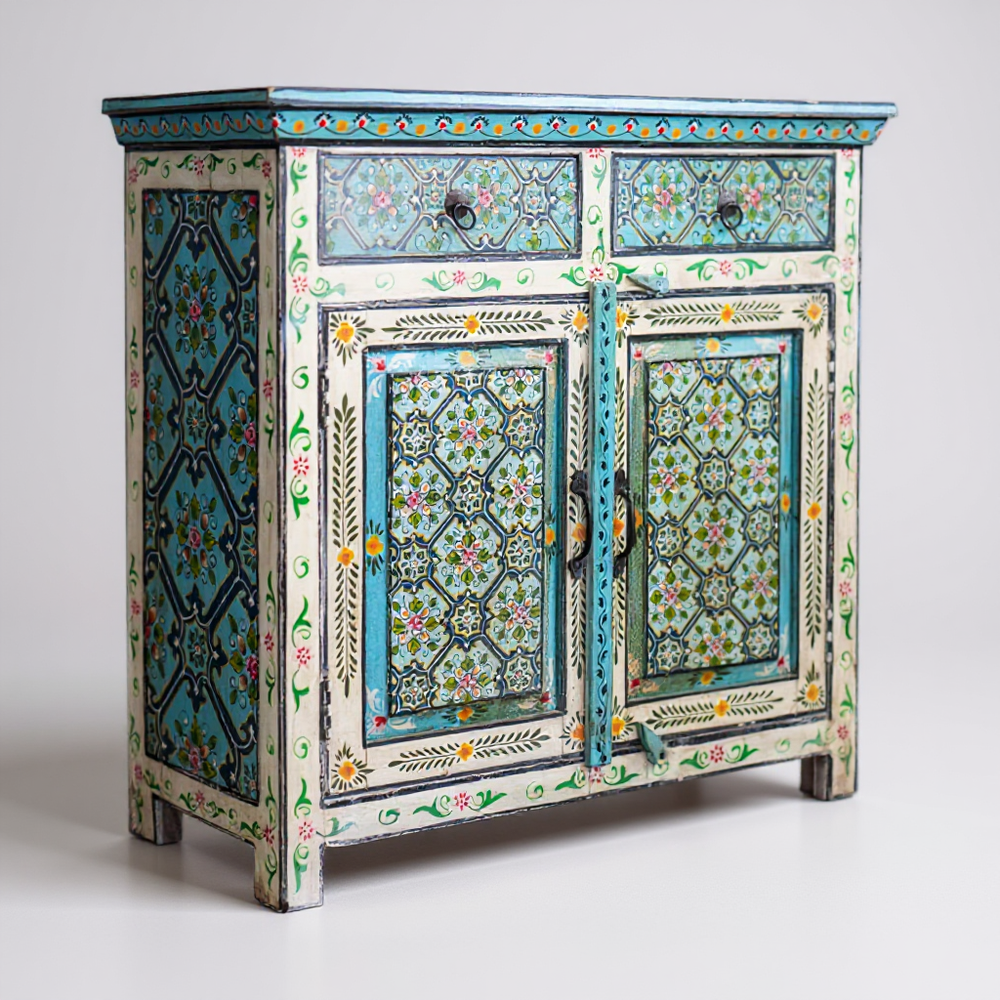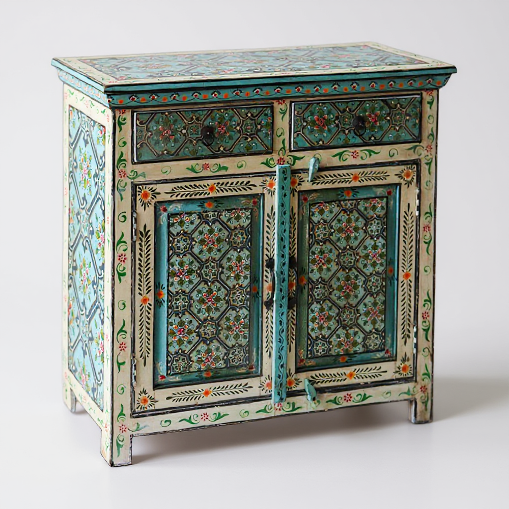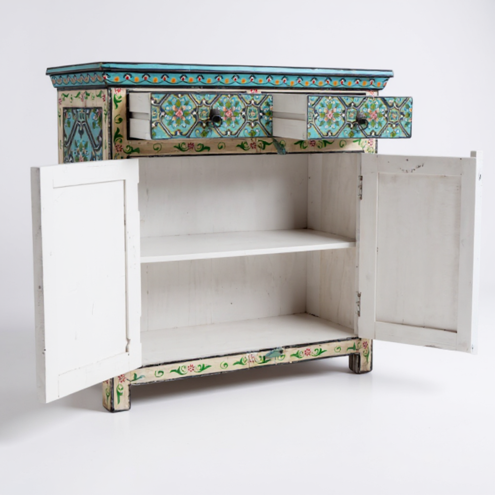 The cabinet features two drawers and two doors with one internal shelf, offering practical storage for your essentials while enhancing your interior with a pop of color and cultural elegance. Its ivory base and delicate brushwork create a vintage appeal perfect for bohemian, eclectic, or ethnic-inspired interiors.