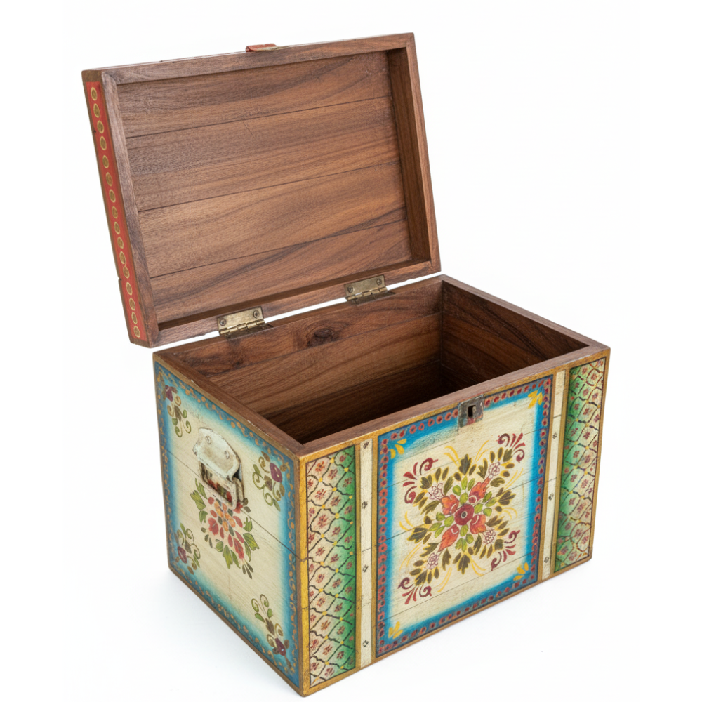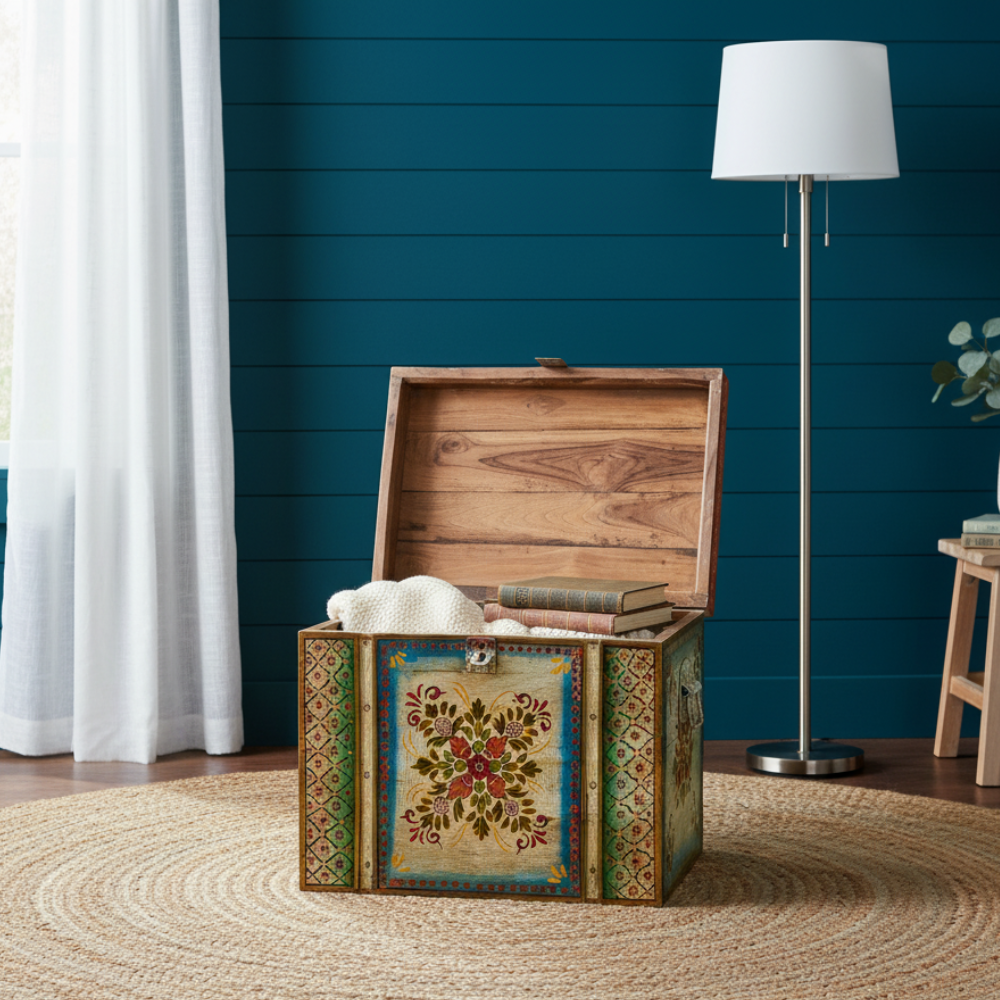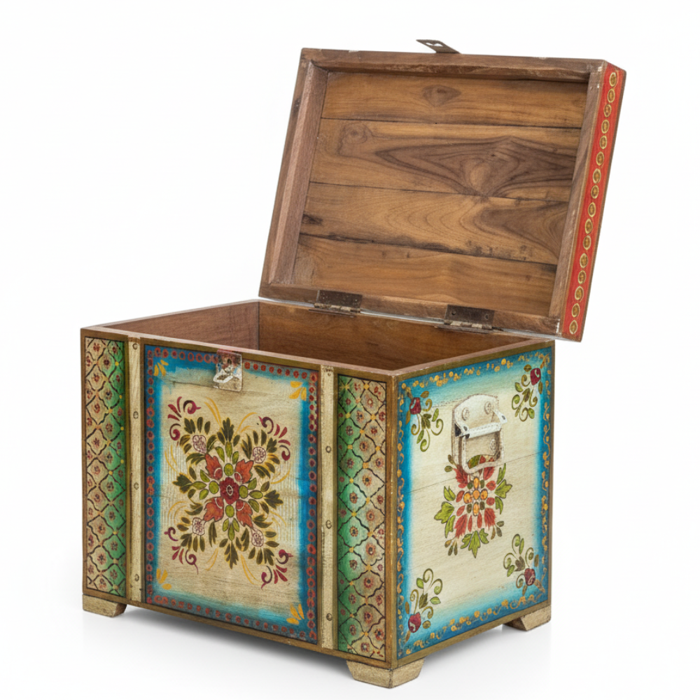 Each panel tells a story of Rajasthani heritage — the detailed brushwork and antique-inspired distressing create a charming, vintage look that celebrates India’s rich artistic traditions. The interior is spacious and left in a natural wood finish, making it perfect for storing blankets, linens, toys, or keepsakes.
