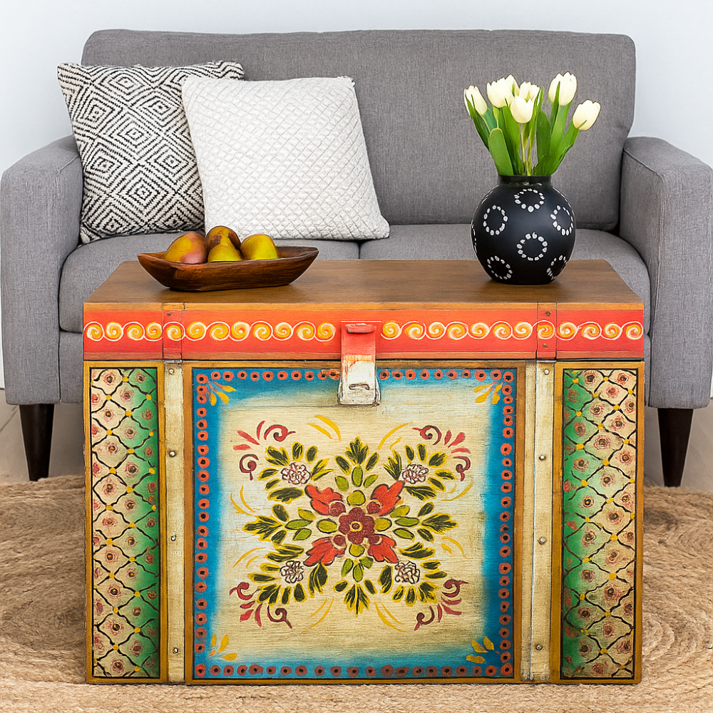Bring a touch of vibrant Indian artistry into your home with this stunning hand-painted wooden blanket chest by Viratra Art Decor. Expertly crafted from solid wood, this storage trunk showcases intricate traditional floral and geometric motifs, hand-painted in lively shades of turquoise, red, gold, and green.