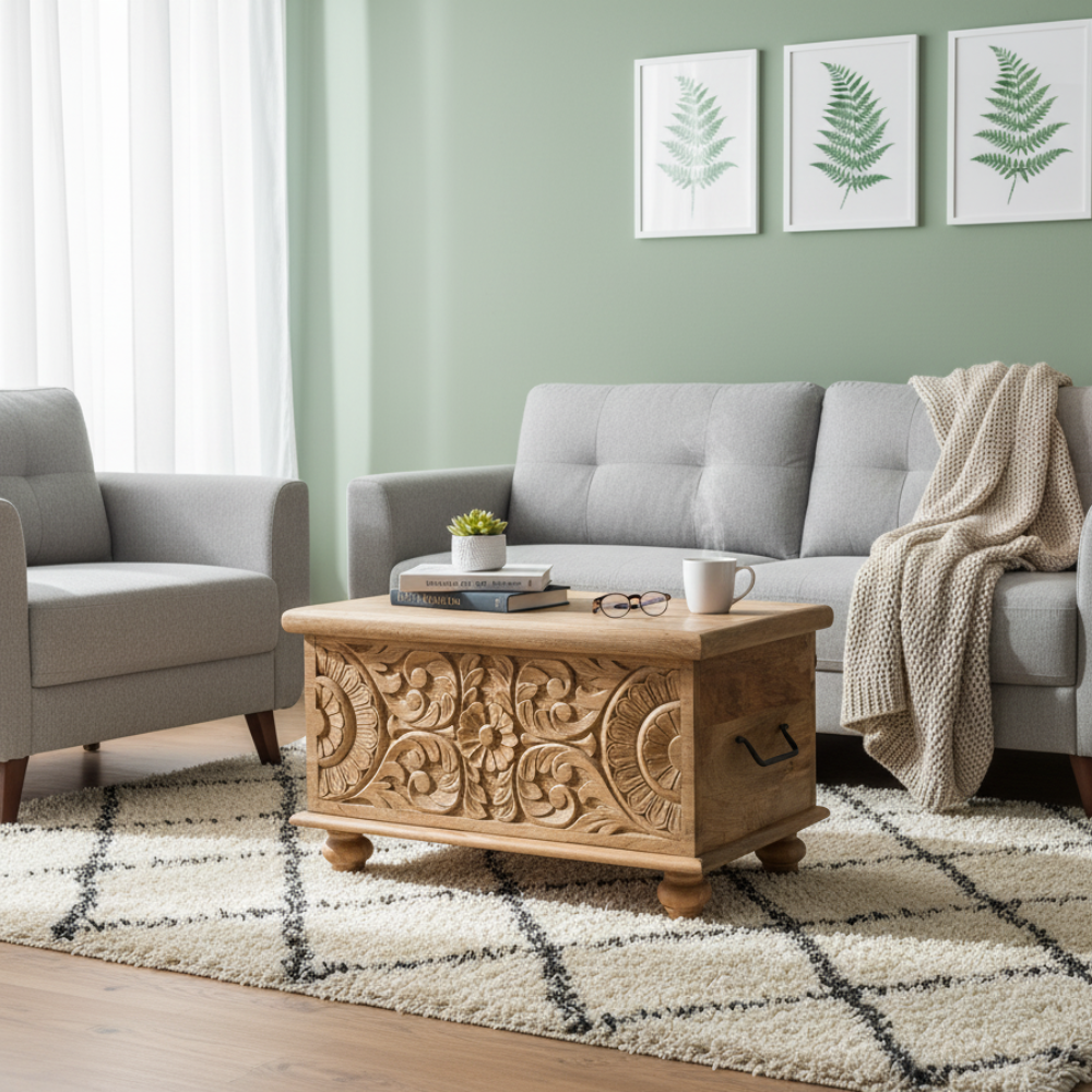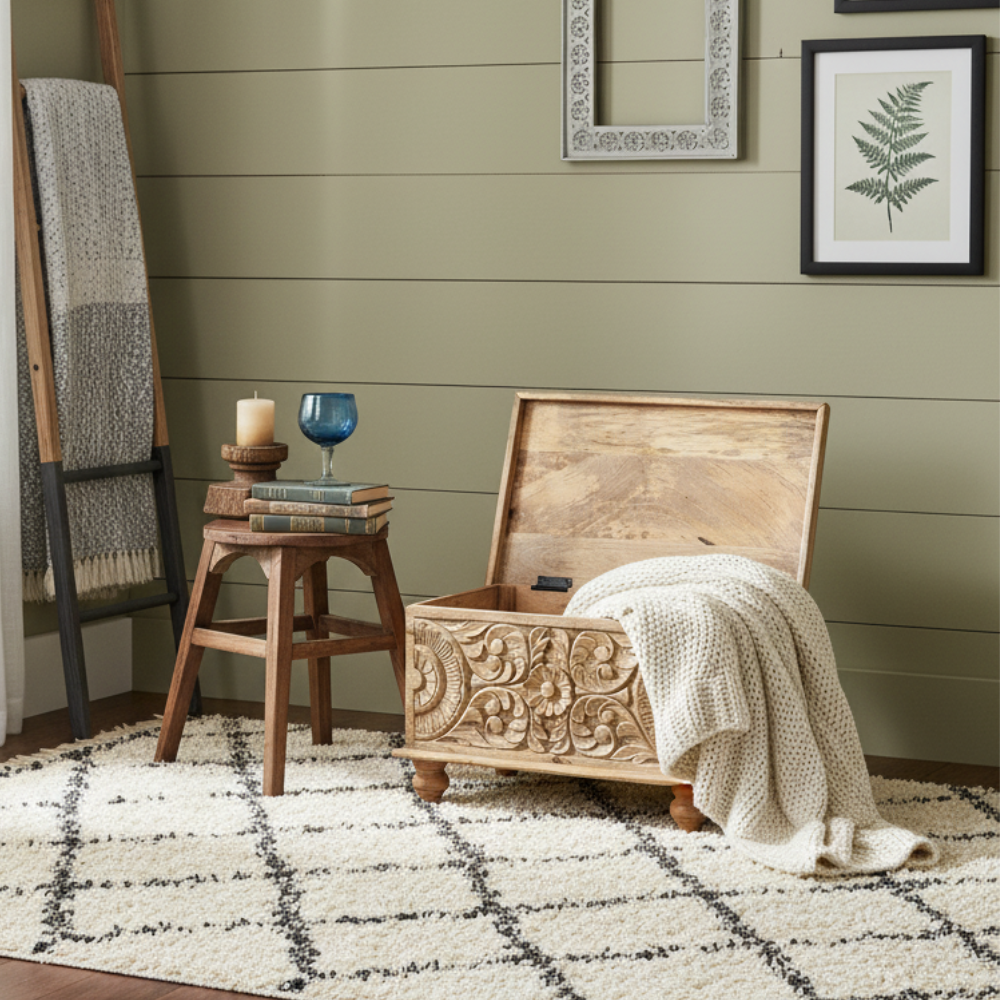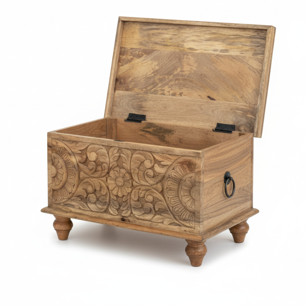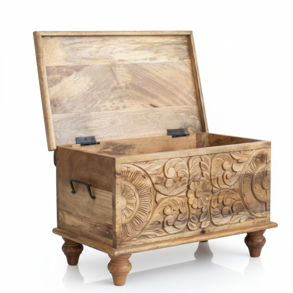 Embrace the charm of handcrafted Indian artistry with this elegant floral carved wooden blanket chest by Viratra Art Decor. Beautifully made from solid mango wood, this storage trunk showcases exquisite hand-carved floral and vine patterns on the front panel, celebrating traditional craftsmanship in a modern, natural finish.
