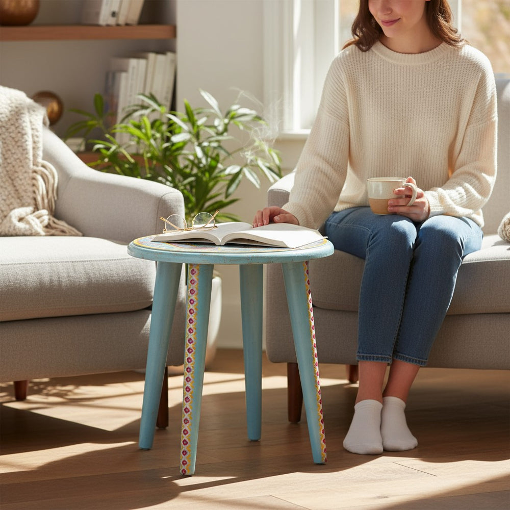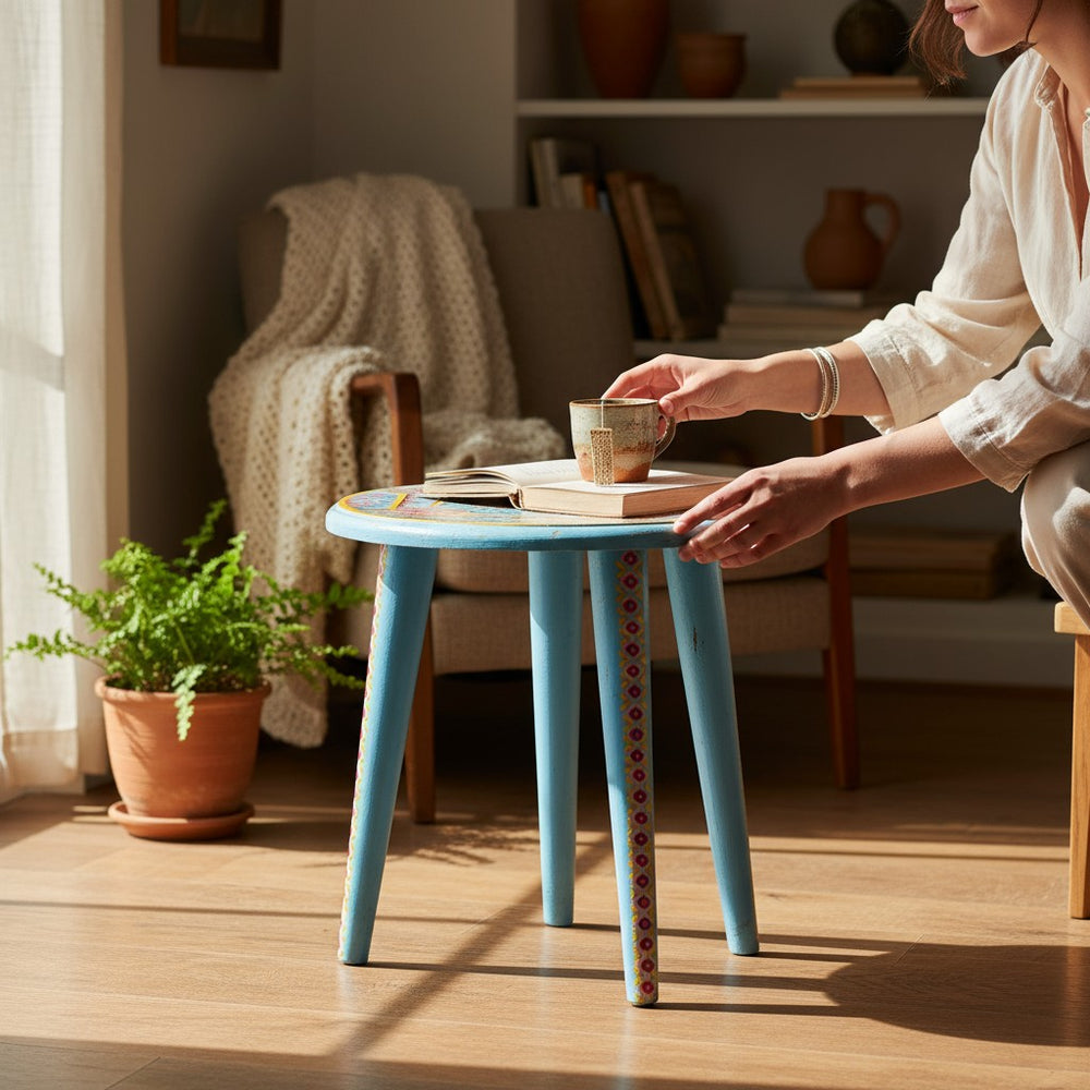 Bring a burst of color and charm into your home with this Boho Accent Table featuring beautifully hand-painted floral artwork. Its vibrant blue finish and folk-inspired detailing make it a perfect statement piece for eclectic, bohemian, artistic, and global-style interiors. Ideal as a side table, plant stand, or decorative accent, it adds warmth, personality, and handcrafted beauty to any room.
