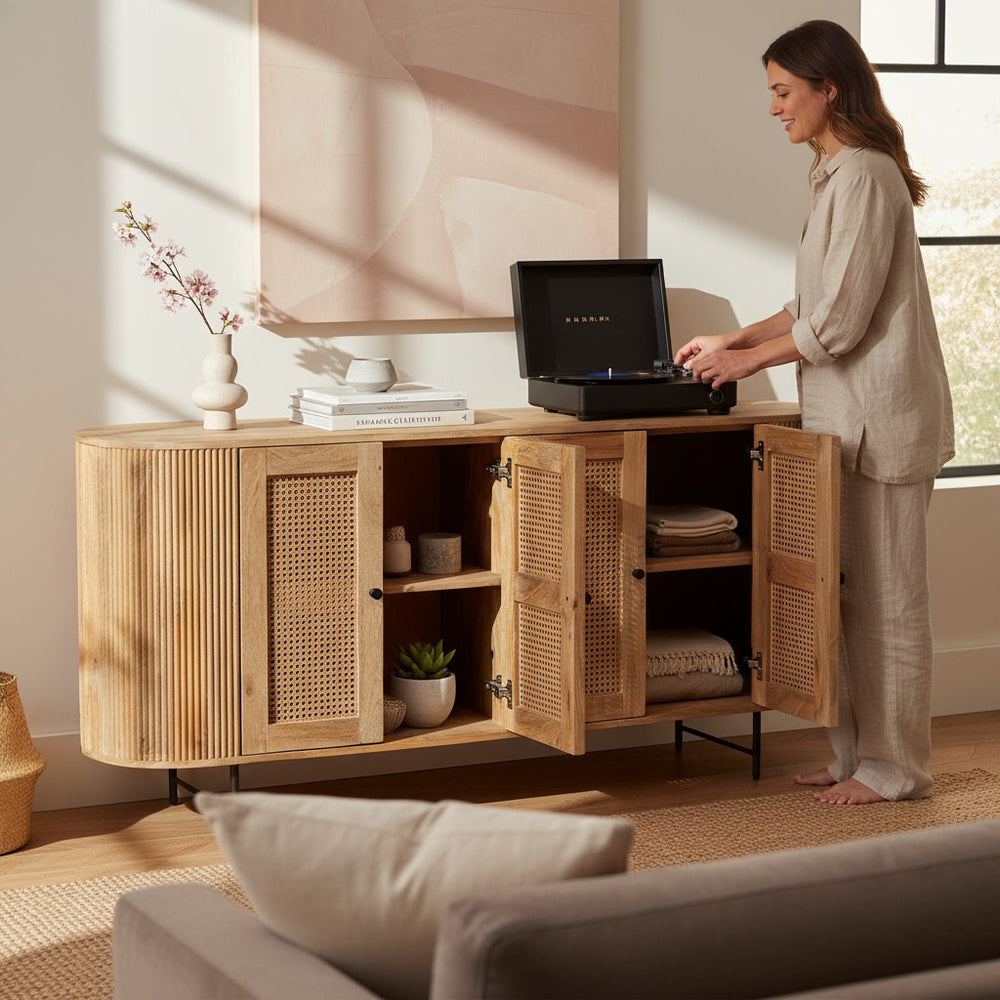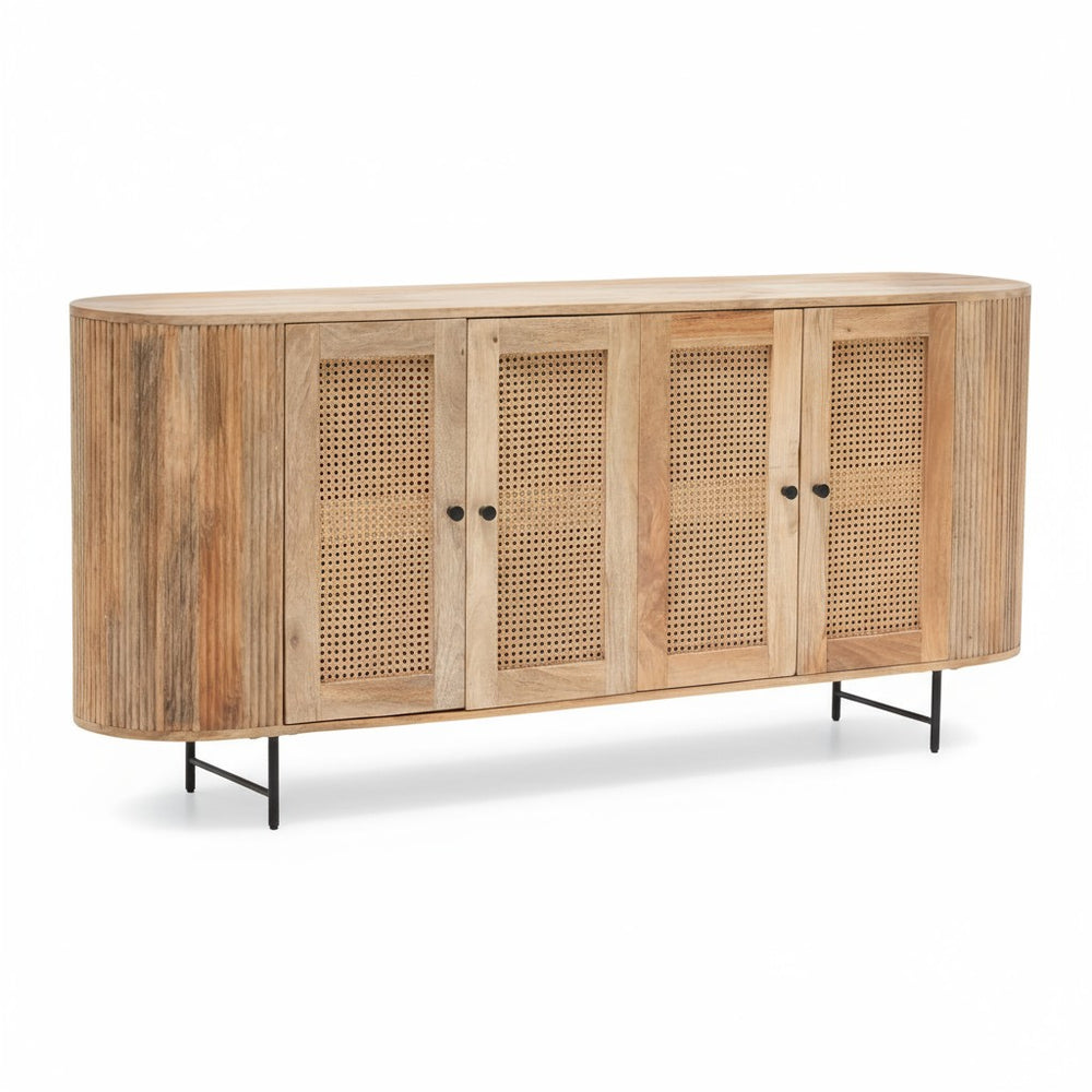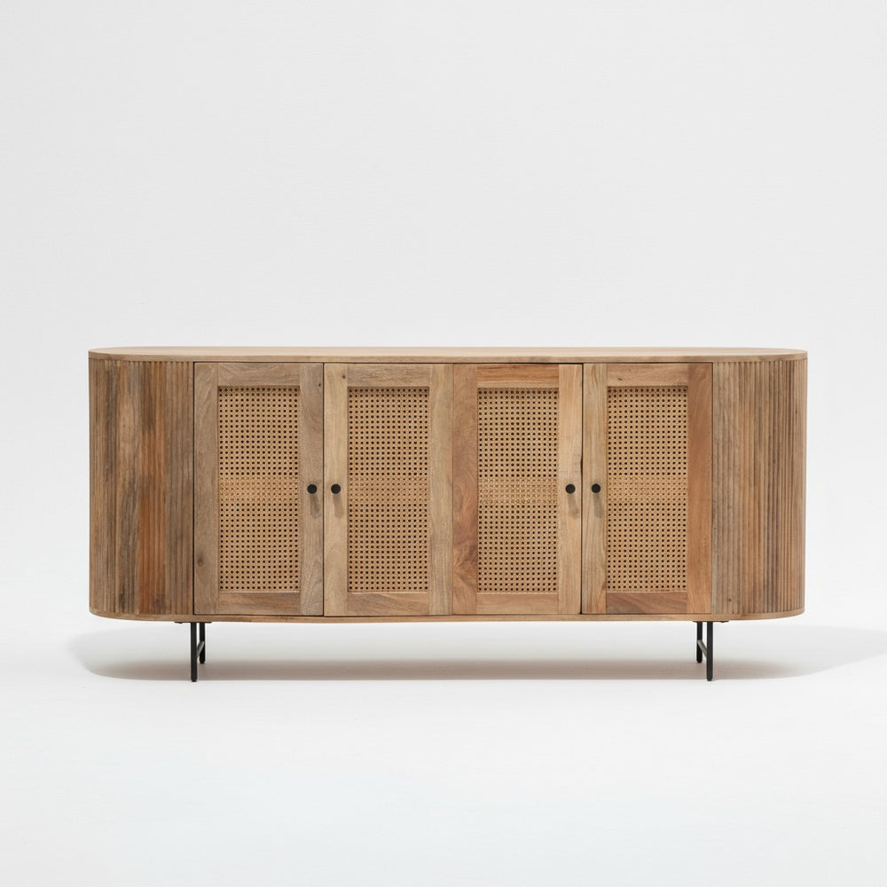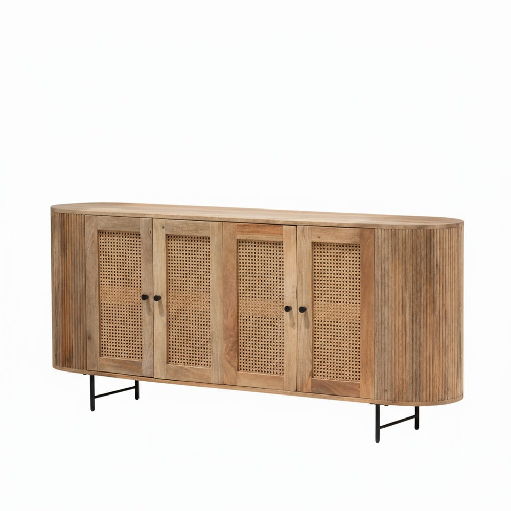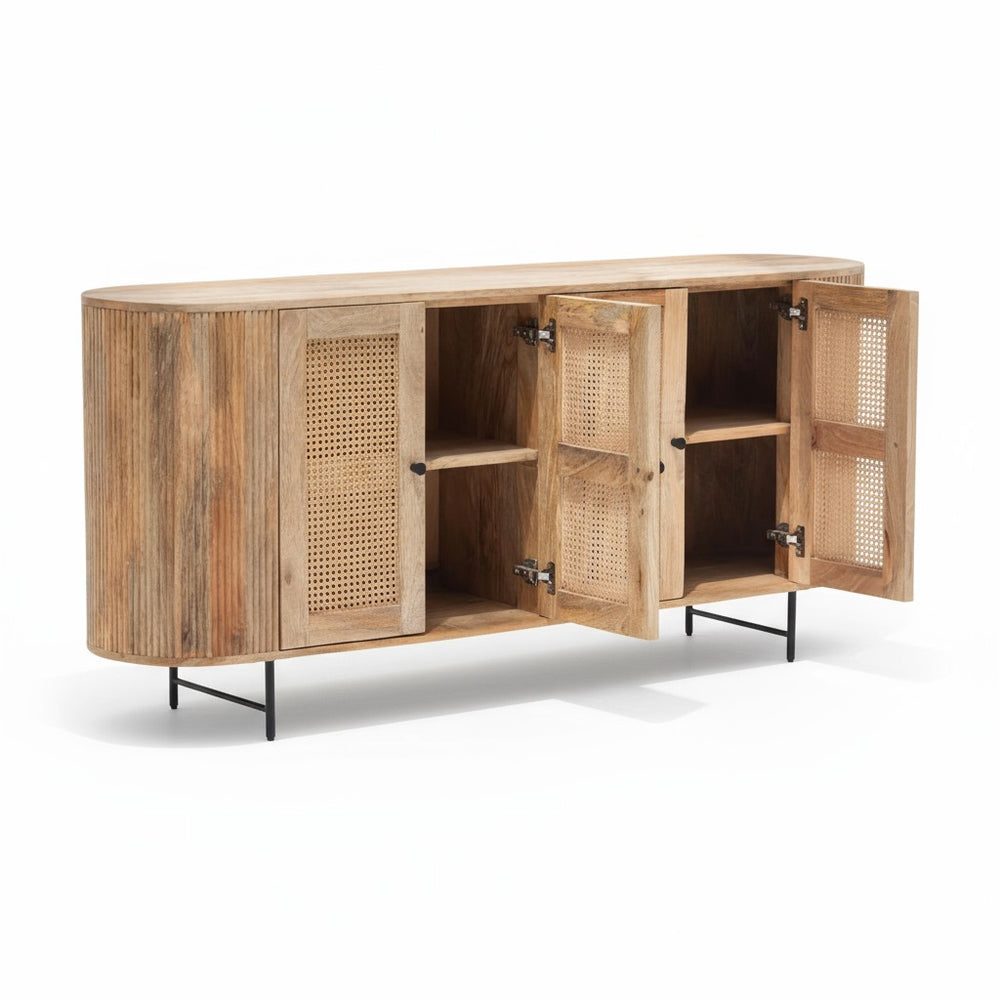 This handcrafted mango wood sideboard by Viratra Art Decor combines natural elegance with modern design. Featuring curved edges, cane webbing doors, and a sleek iron base, this piece brings warmth and texture to any living space. Perfect for both storage and style, it blends mid-century charm with contemporary simplicity.