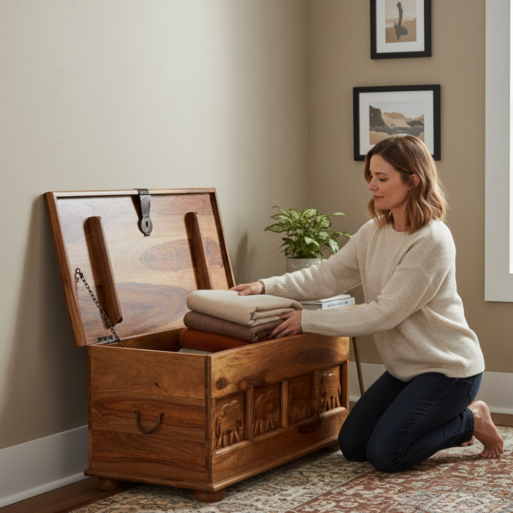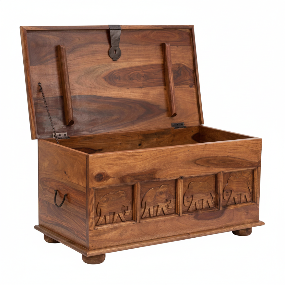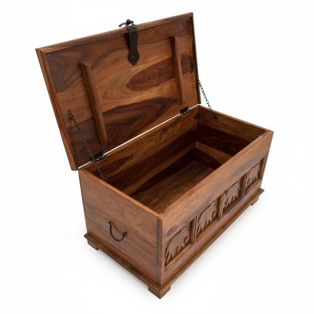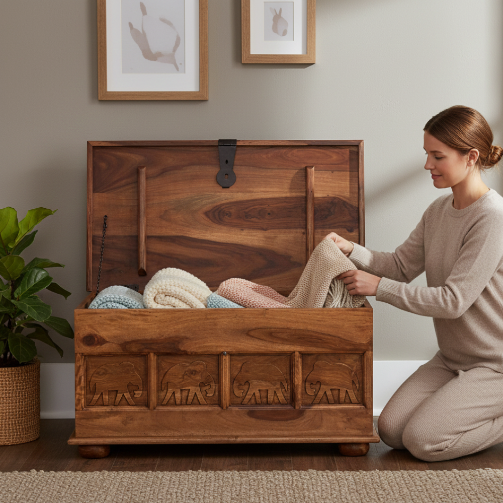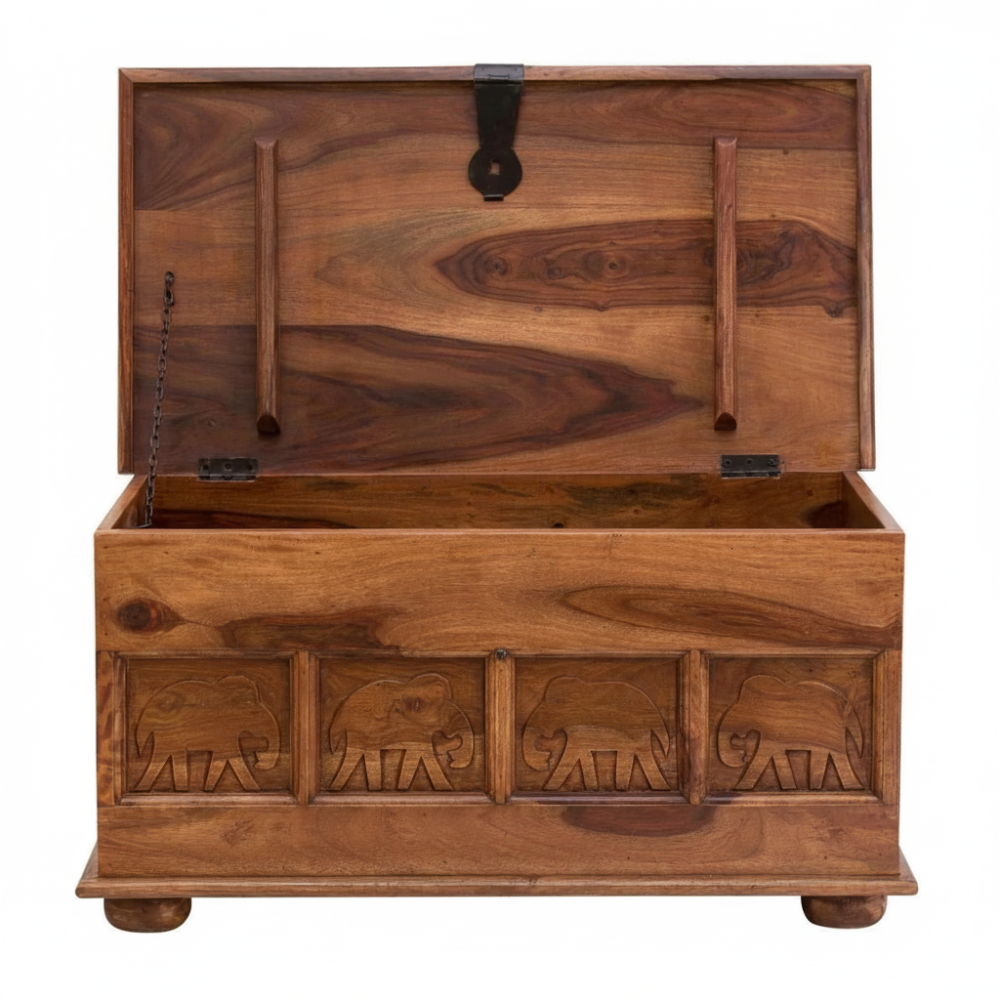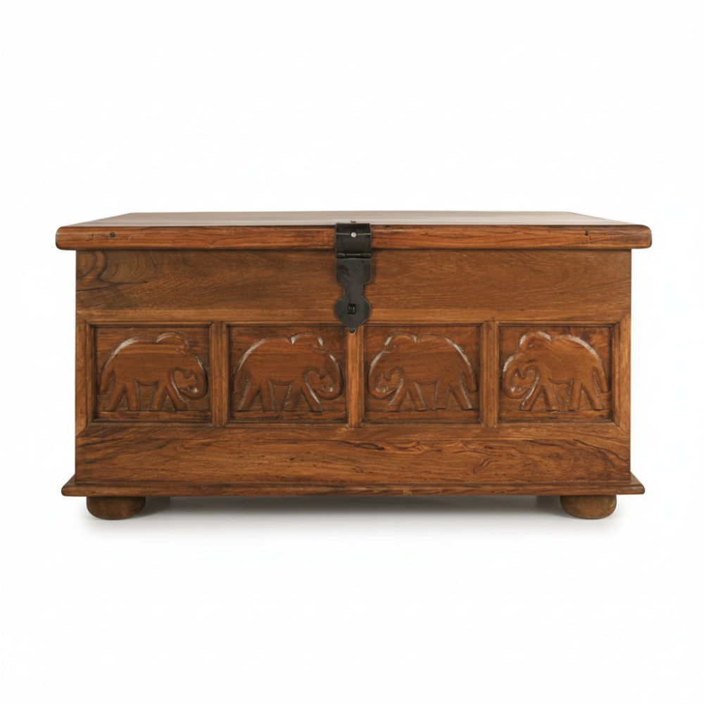 Enhance your living space with this handcrafted wooden trunk box, designed as an elegant blanket storage chest for modern and traditional homes alike. Made from rich natural wood and detailed with carved elephant motifs, it brings a warm, cultural charm to living rooms, bedrooms, or entryways. Its spacious interior effortlessly stores blankets, quilts, cushions, toys, and seasonal essentials—keeping your home clutter-free while adding a statement décor element. Perfect as a storage chest, coffee table, or accent piece, this trunk blends utility with timeless artisanal beauty.