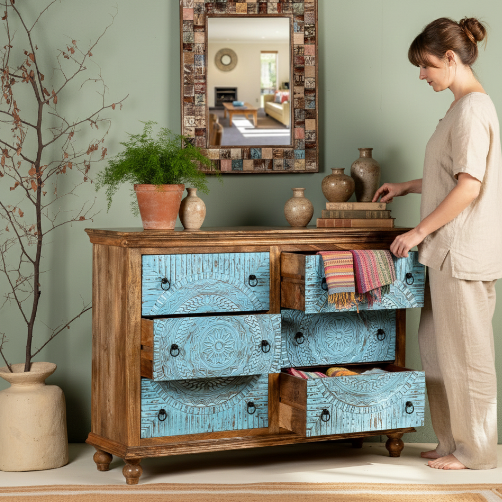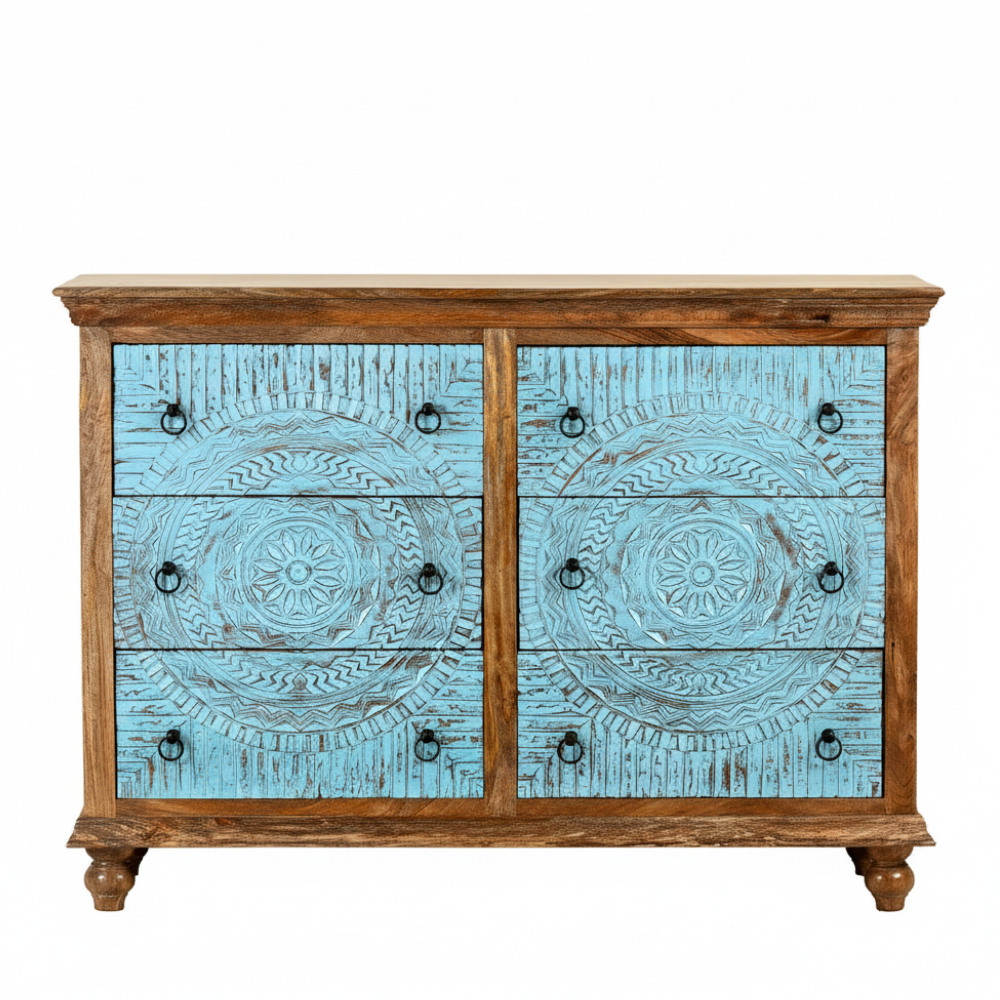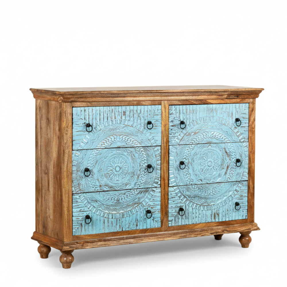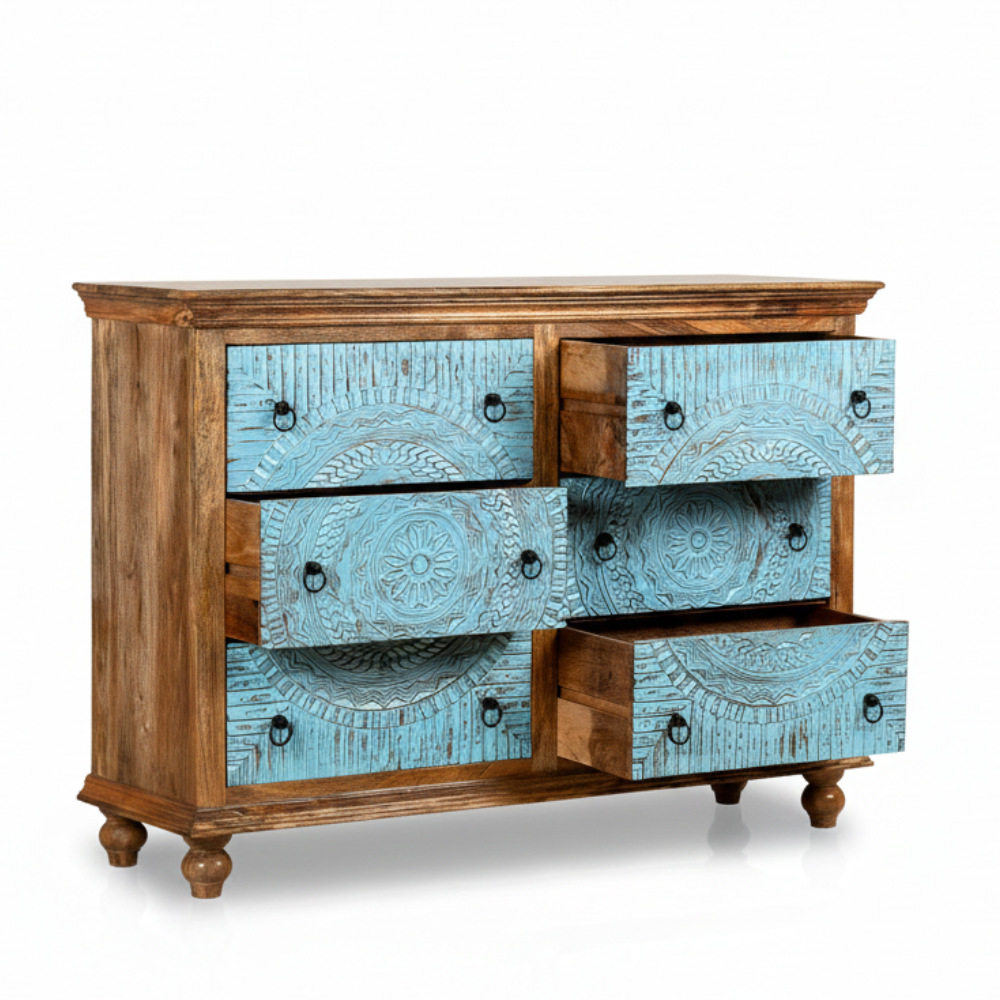 Bring effortless boho charm to your bedroom with this striking hand-carved chest of drawers, featuring a beautiful sky-blue carved front paired with a natural mango-wood frame. The artistic mandala-inspired carvings and distressed finish create a calming, stylish vibe—perfect for modern bohemian, rustic, coastal, or eclectic home interiors. With spacious drawers for clothes, linens, accessories, and daily essentials, this piece delivers both visual impact and smart bedroom storage in one.