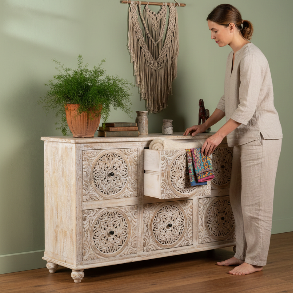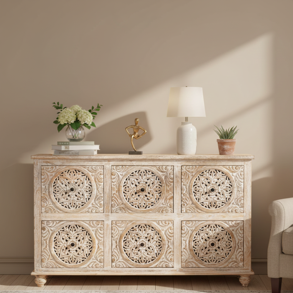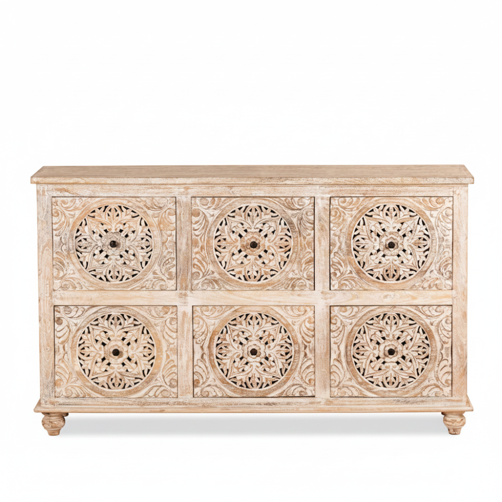Elevate your living space with this exquisitely hand-carved mango wood sideboard, designed to bring a serene boho-chic charm to any home. Its intricate circular floral carvings, antique whitewashed finish, and artistic craftsmanship create a warm, inviting ambiance—perfect for modern, rustic, or vintage-inspired interiors. Ideal as a stylish storage solution in the living room, hallway, dining area, or bedroom, this piece blends functionality with timeless artistry, becoming a captivating focal point in your decor.