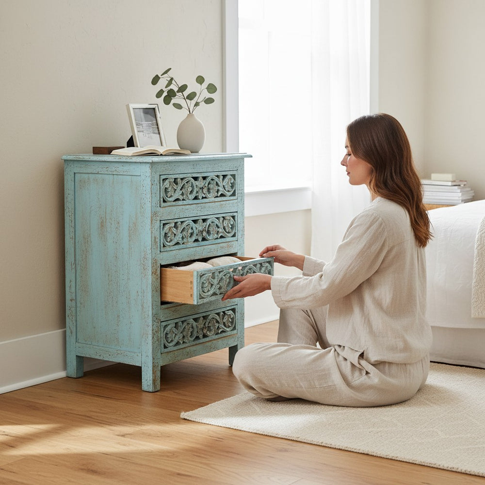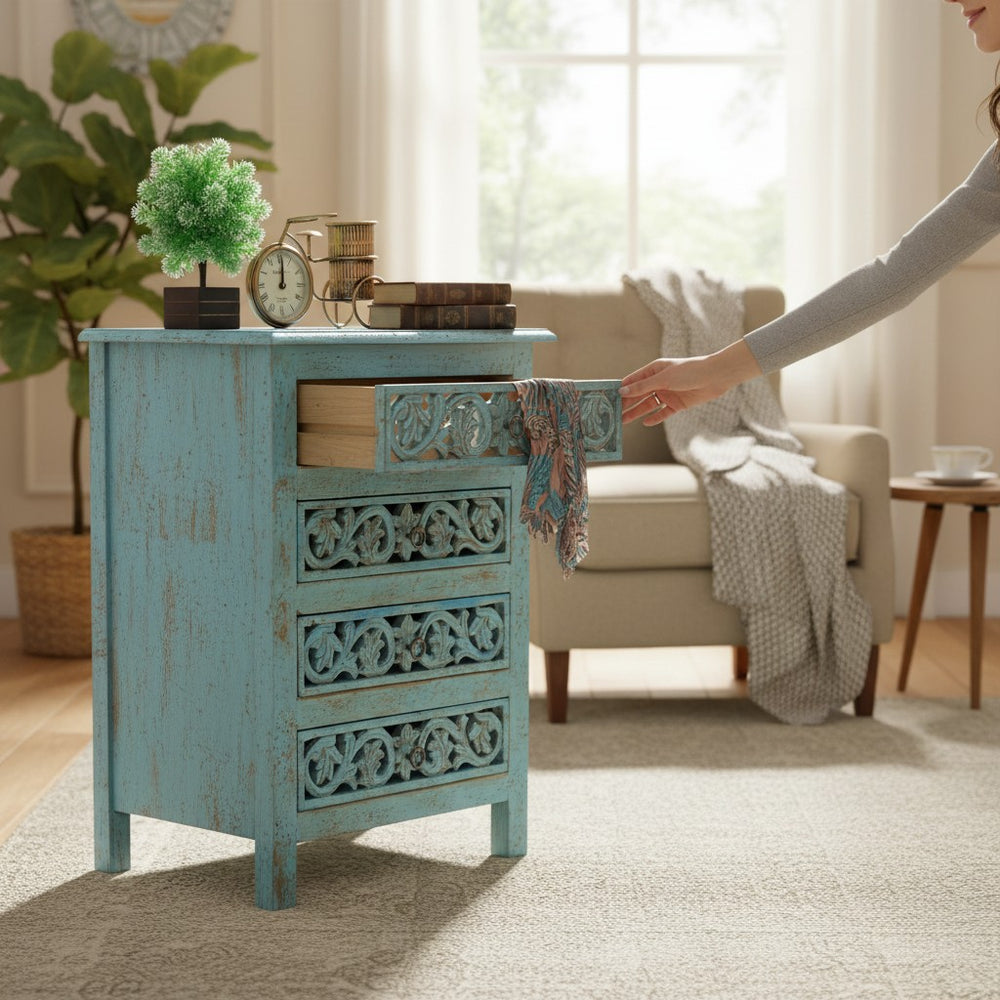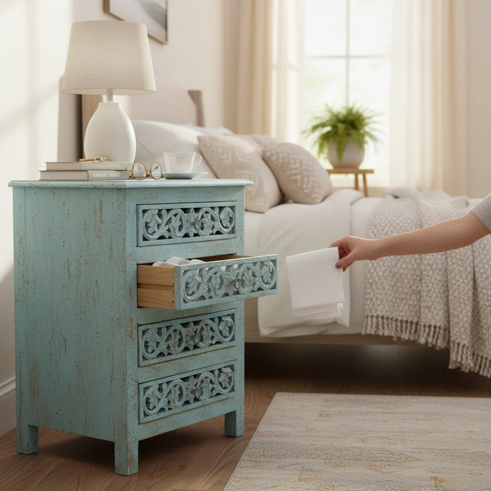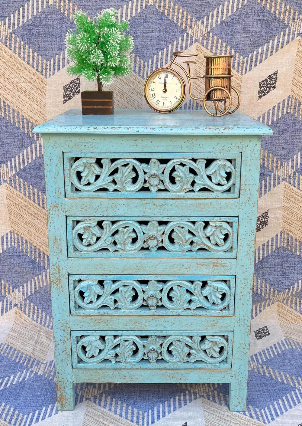 Bring timeless elegance and artisanal beauty into your bedroom with this handcrafted drawer chest. Featuring intricate floral carvings and a charming distressed turquoise finish, this chest blends rustic charm with functional storage. Its compact size makes it perfect for organizing clothes, accessories, and bedside essentials while enhancing your space with a serene, vintage-inspired look.