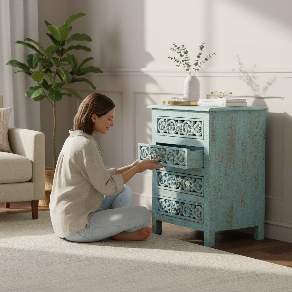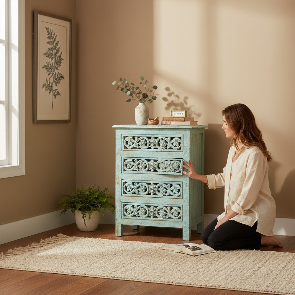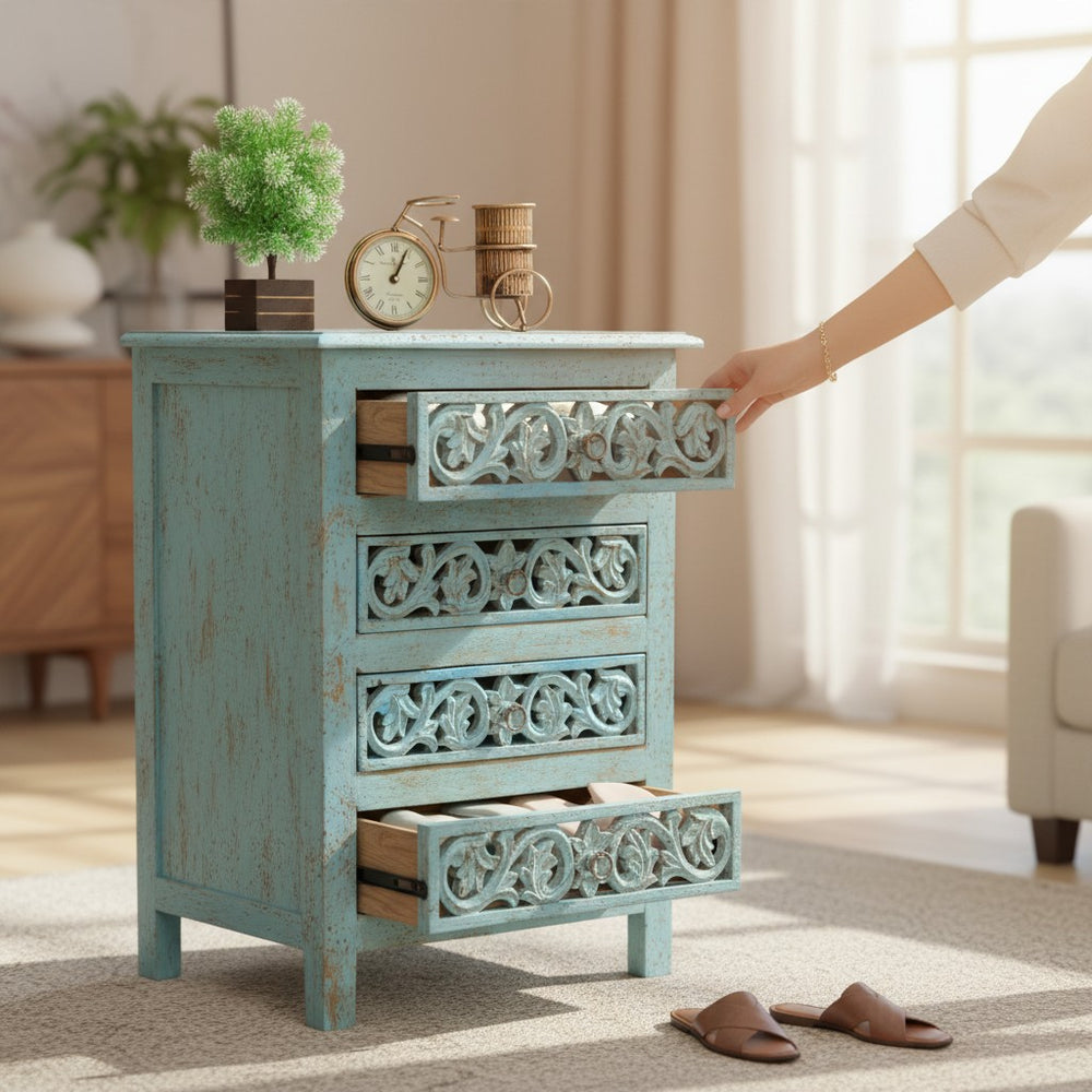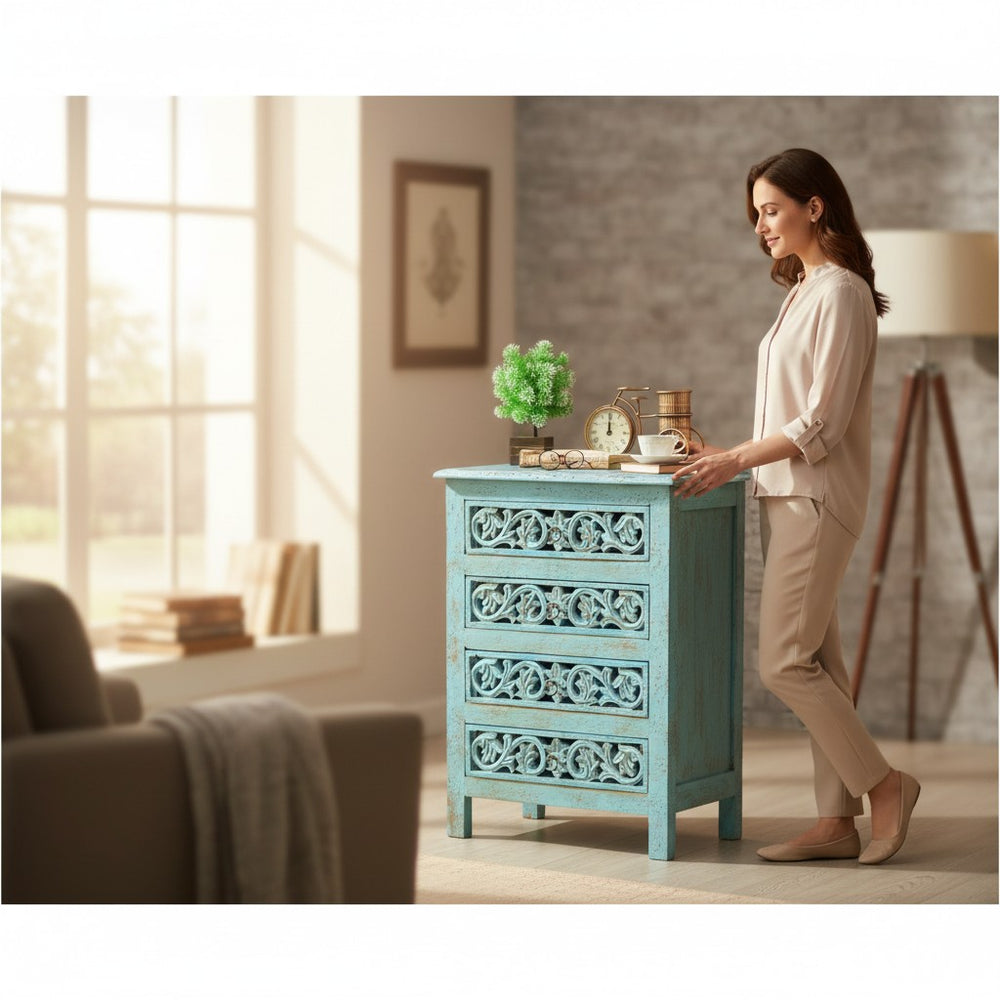 Bring timeless elegance and artisanal beauty into your bedroom with this handcrafted drawer chest. Featuring intricate floral carvings and a charming distressed turquoise finish, this chest blends rustic charm with functional storage. Its compact size makes it perfect for organizing clothes, accessories, and bedside essentials while enhancing your space with a serene, vintage-inspired look.