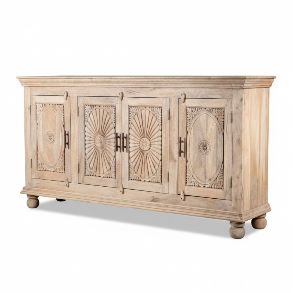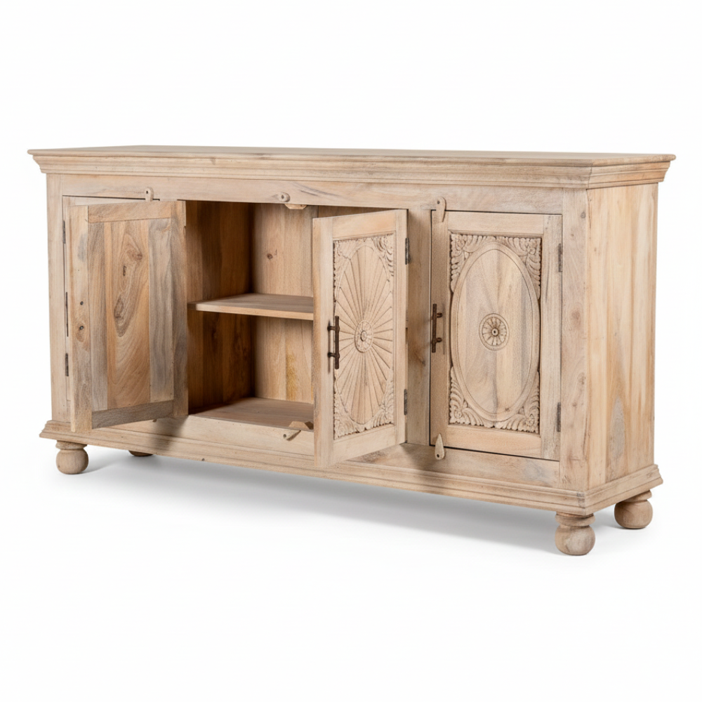 Bring home a touch of timeless craftsmanship with this beautifully hand-carved mango wood sideboard, designed to elevate modern, rustic, and boho-inspired interiors. Its sandblasted natural finish, intricate floral and sunburst carvings, and solid wooden construction create a warm, artisanal charm. Perfect as a living room storage cabinet, dining sideboard, or hallway console, it offers functional shelving hidden behind detailed doors—enhancing your home with both elegance and practicality.