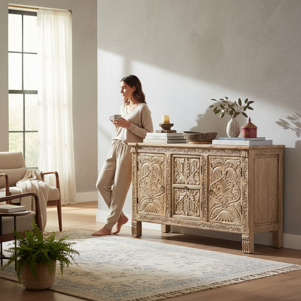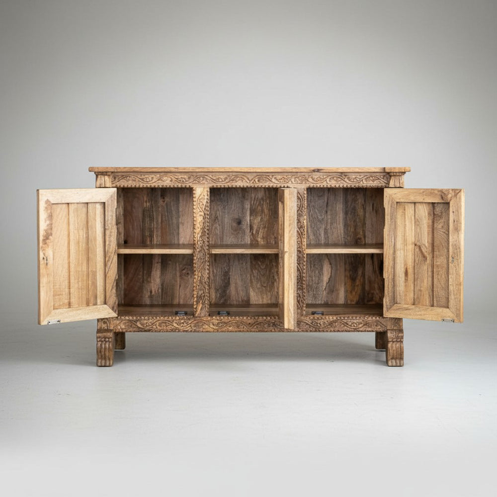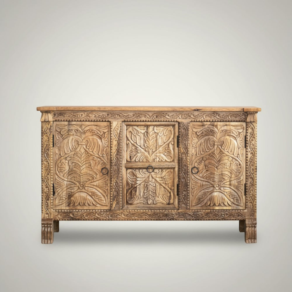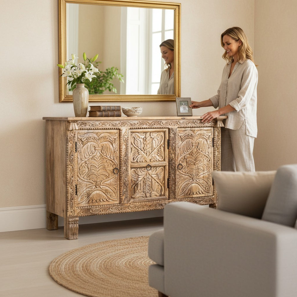 Bring global artisan charm into your home with this beautifully hand-carved mango wood sideboard. Its intricate Indian motifs and warm natural finish create a striking focal point in any living room, dining space, or hallway. Perfect for styling with candles, textiles, or decorative accents, it blends effortlessly with bohemian, rustic, modern ethnic, or farmhouse interiors while offering practical hidden storage.