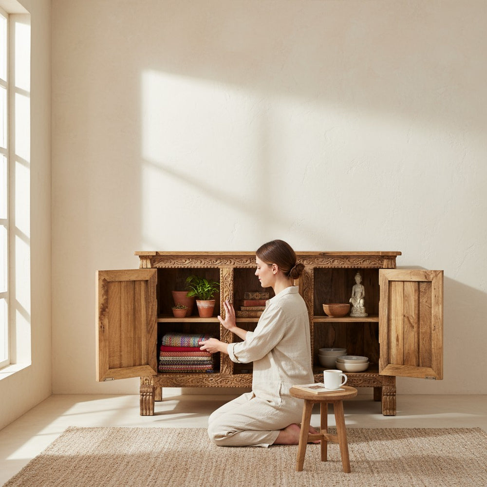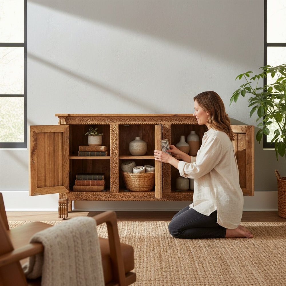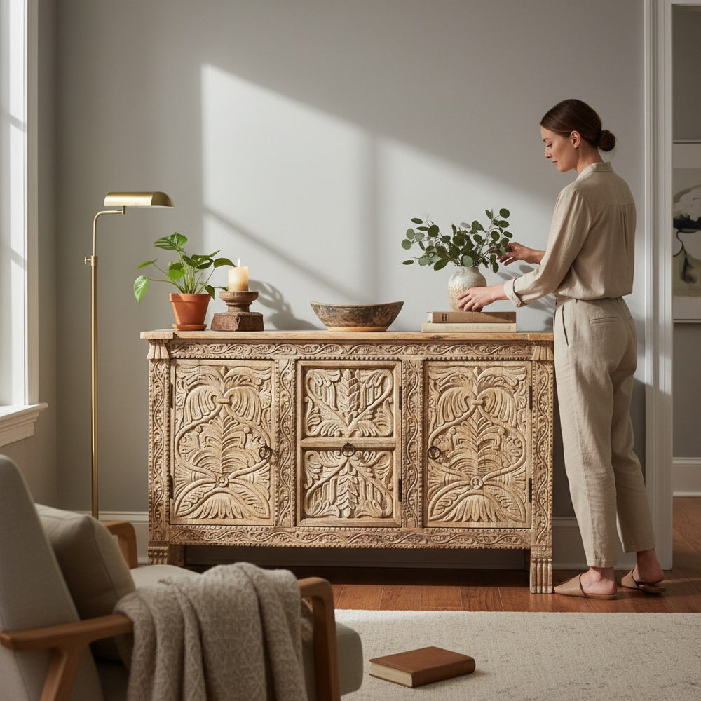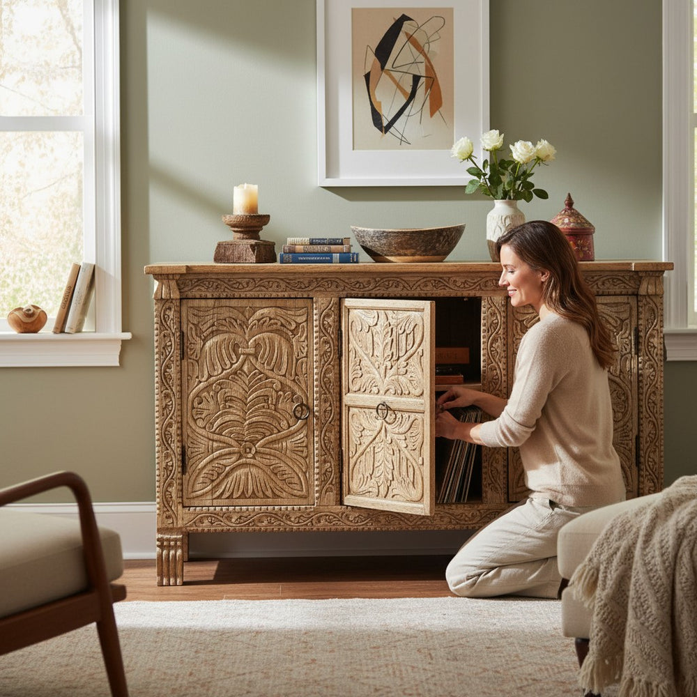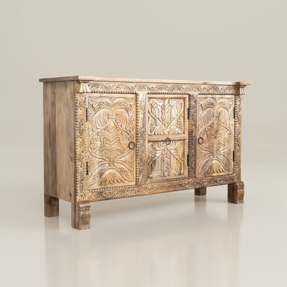 Bring global artisan charm into your home with this beautifully hand-carved mango wood sideboard. Its intricate Indian motifs and warm natural finish create a striking focal point in any living room, dining space, or hallway. Perfect for styling with candles, textiles, or decorative accents, it blends effortlessly with bohemian, rustic, modern ethnic, or farmhouse interiors while offering practical hidden storage.