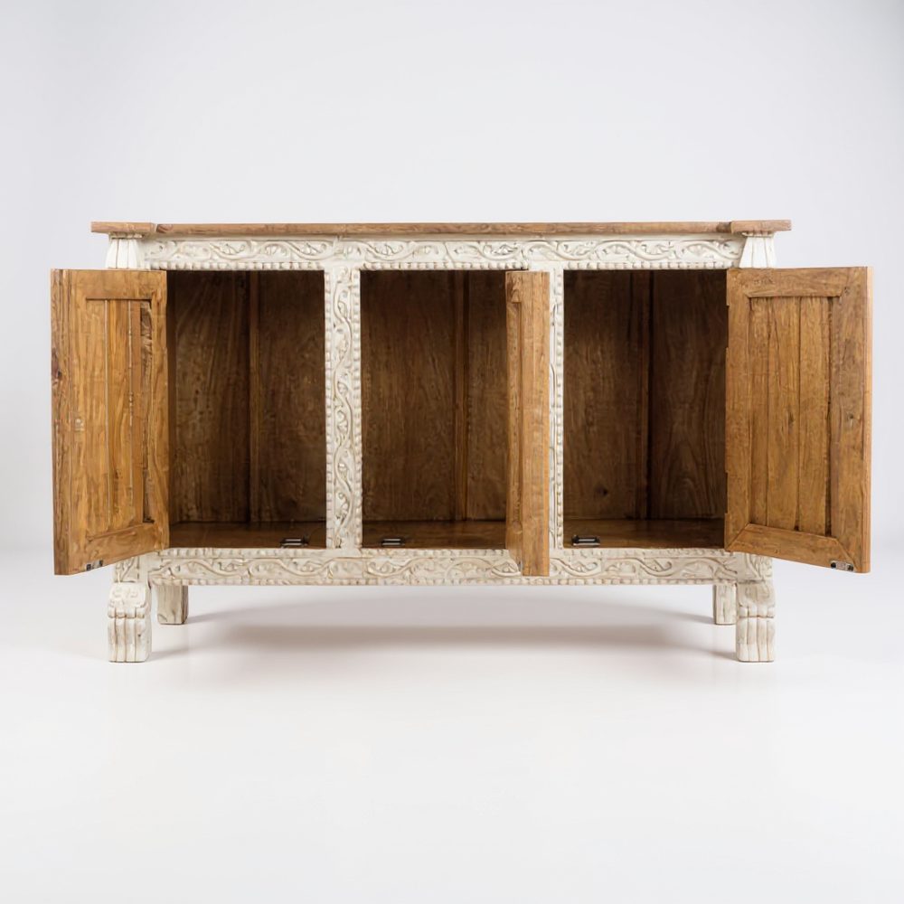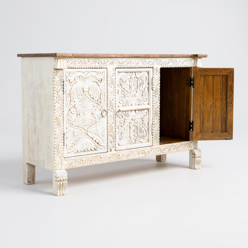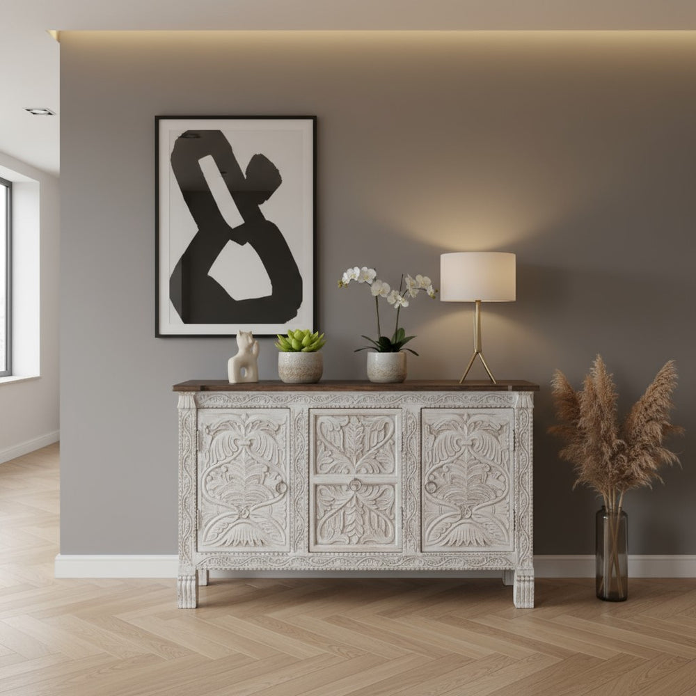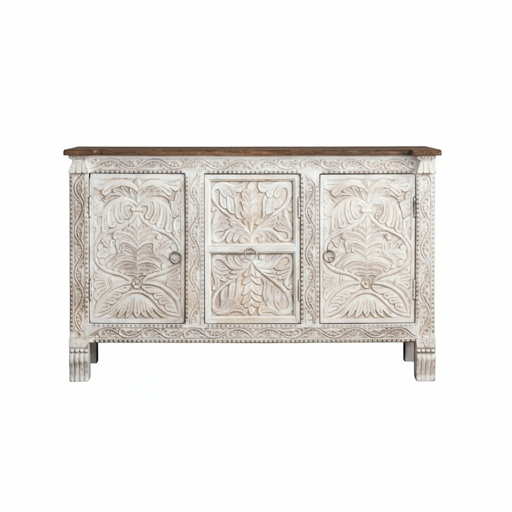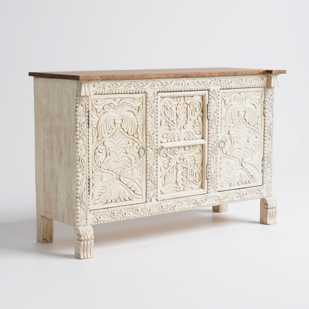 Bring timeless elegance into your home with this beautifully hand-carved white sideboard. Featuring intricate floral patterns and a warm natural wood top, this piece blends classic craftsmanship with modern rustic charm. Perfect for living rooms, hallways, or dining spaces, it offers generous storage behind its three carved doors while enhancing any interior with its bright, airy, and artistic presence.