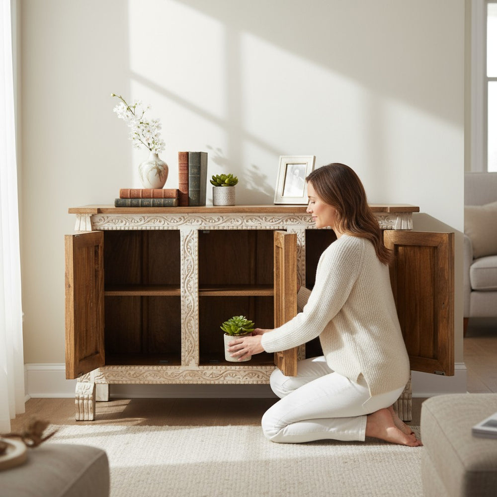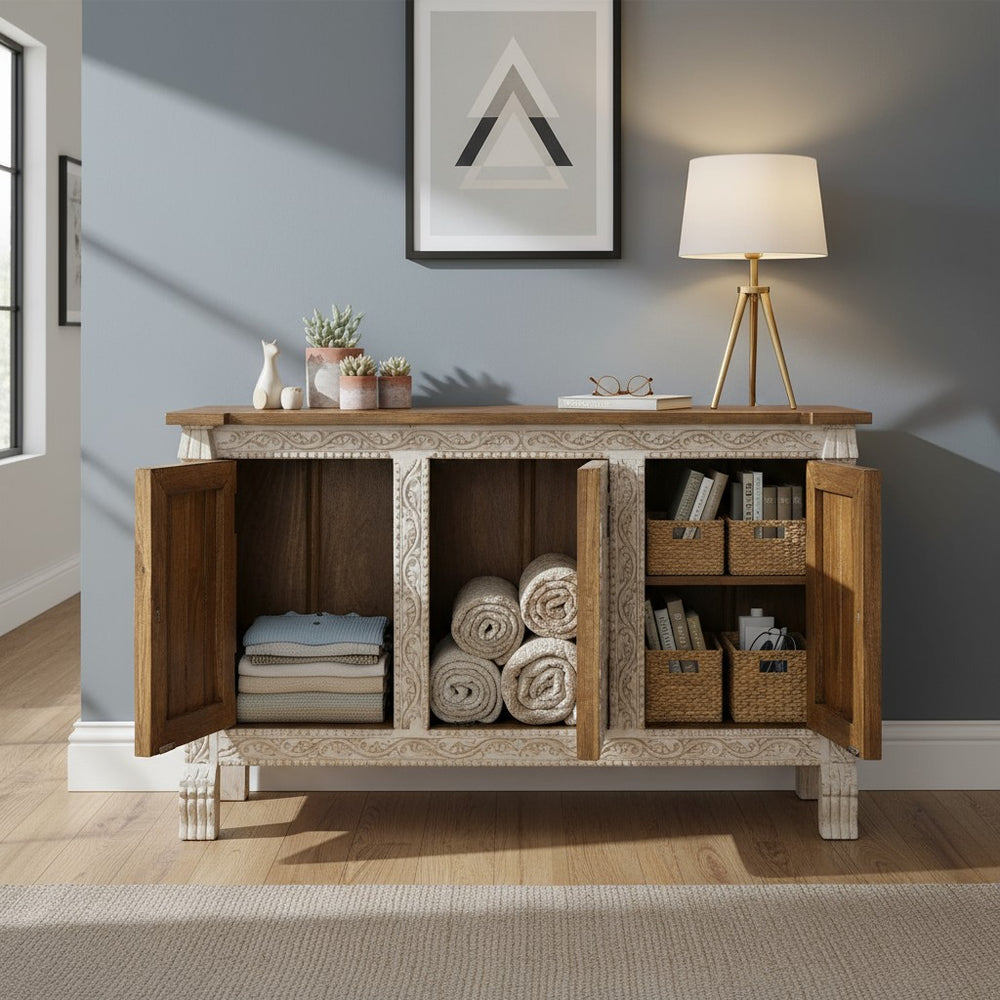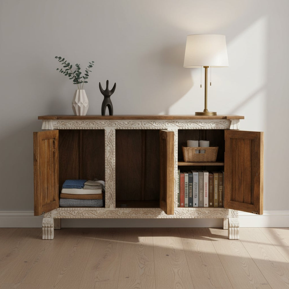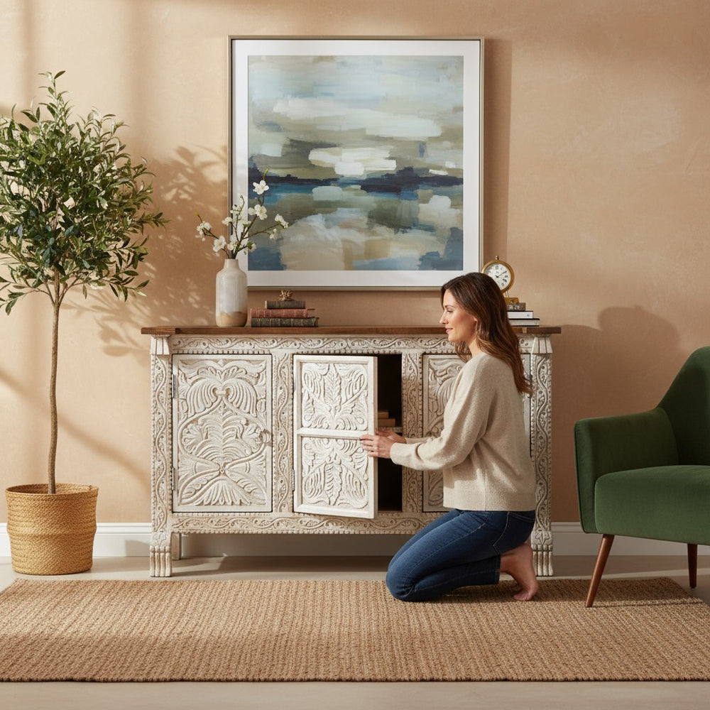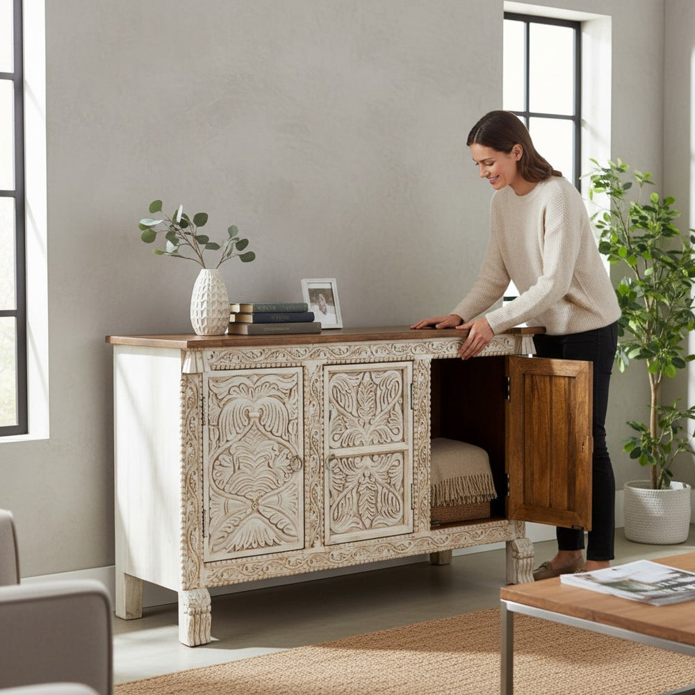 Bring timeless elegance into your home with this beautifully hand-carved white sideboard. Featuring intricate floral patterns and a warm natural wood top, this piece blends classic craftsmanship with modern rustic charm. Perfect for living rooms, hallways, or dining spaces, it offers generous storage behind its three carved doors while enhancing any interior with its bright, airy, and artistic presence.