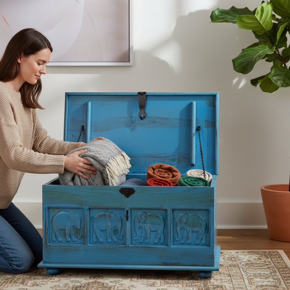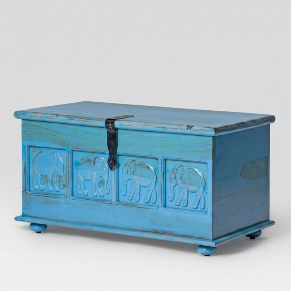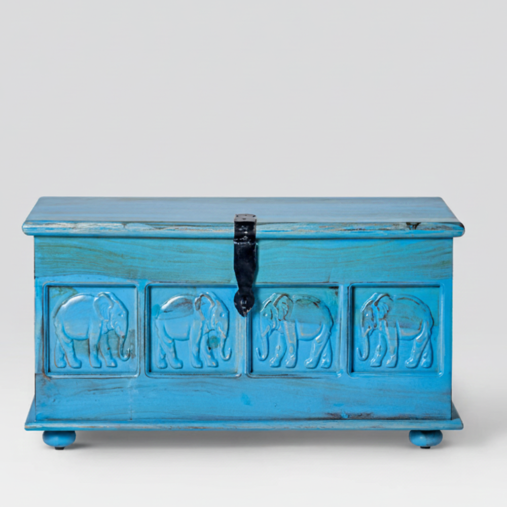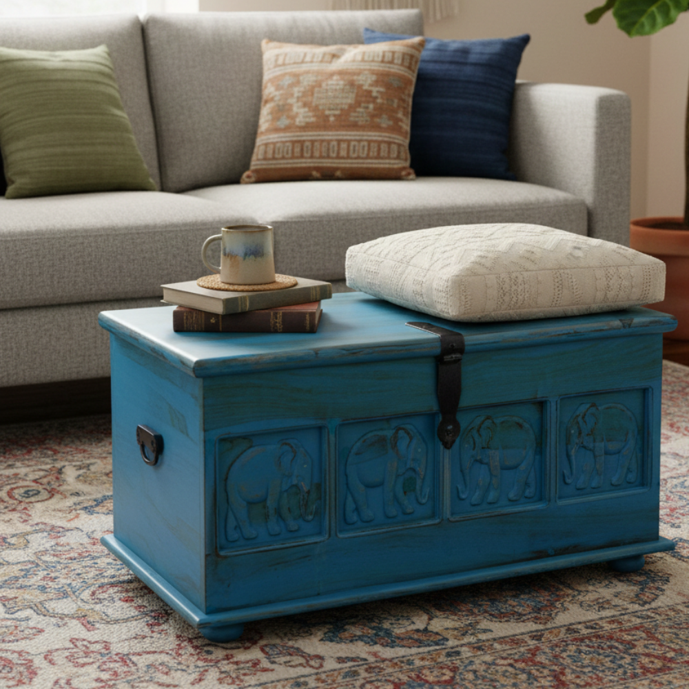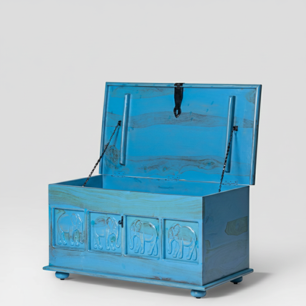 Add a touch of ethnic charm and functional elegance to your living space with this Handcrafted Wooden Trunk Storage Chest. Finished in a refreshing distressed blue shade with beautifully carved elephant motifs, this trunk brings an artistic and serene vibe to your home. Ideal for living rooms, bedrooms, or entryways, it works as a stylish coffee table, decorative accent, or hidden storage solution. This versatile piece enhances both modern and traditional interiors with timeless craftsmanship and natural wooden texture.