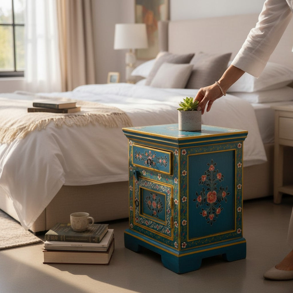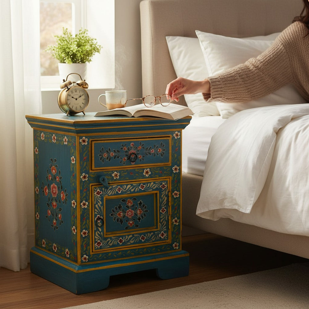 Add a touch of artistic charm to your bedroom or living space with this beautifully hand-painted bedside table, crafted by skilled Indian artisans. Featuring vibrant floral motifs, intricate detailing, and a rich traditional finish, it blends functionality with cultural elegance. Perfect as a nightstand, accent table, or decorative storage piece for any modern, boho, or eclectic interior.