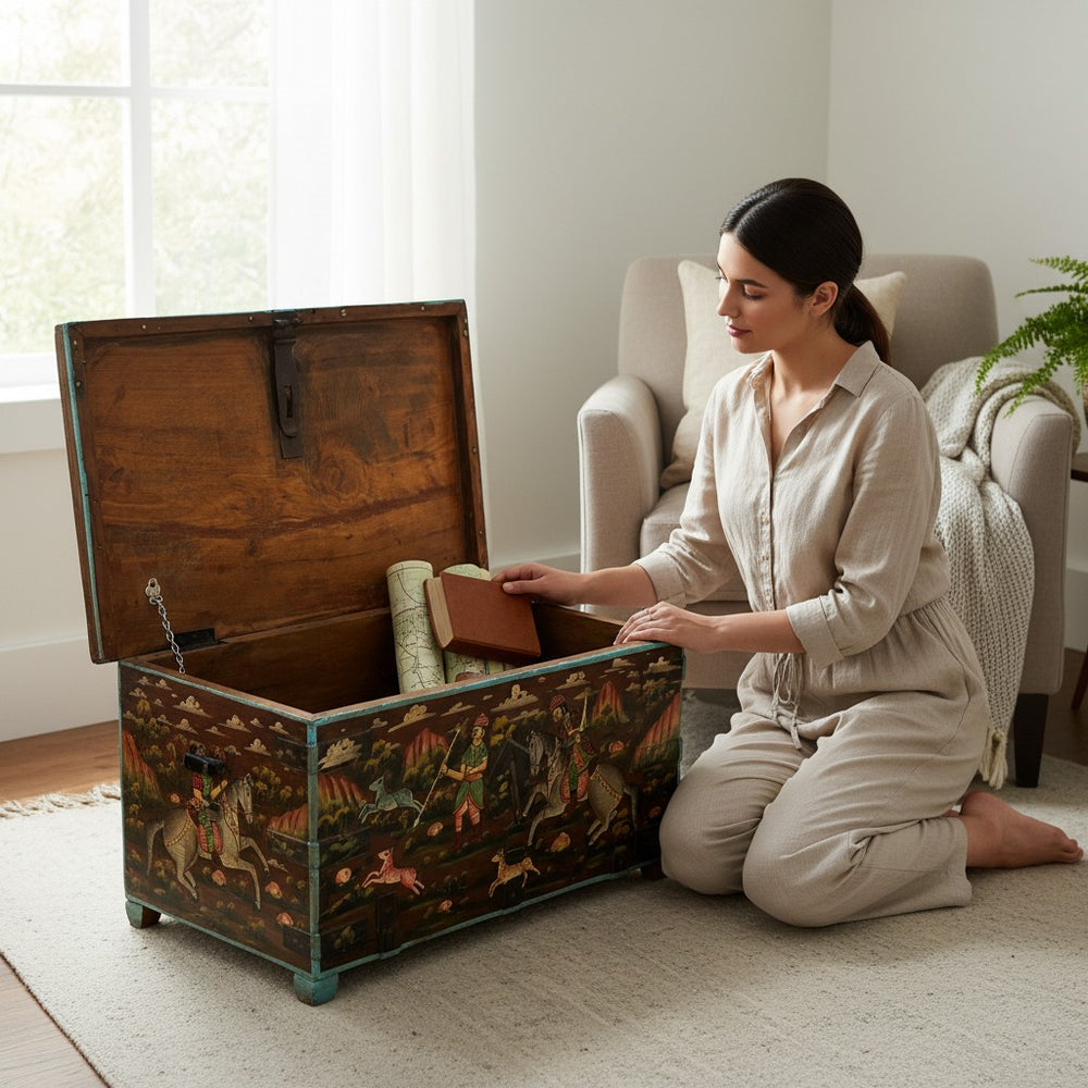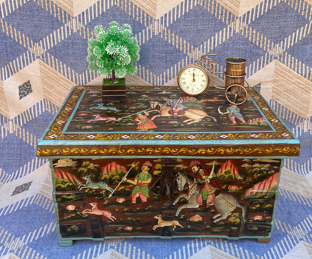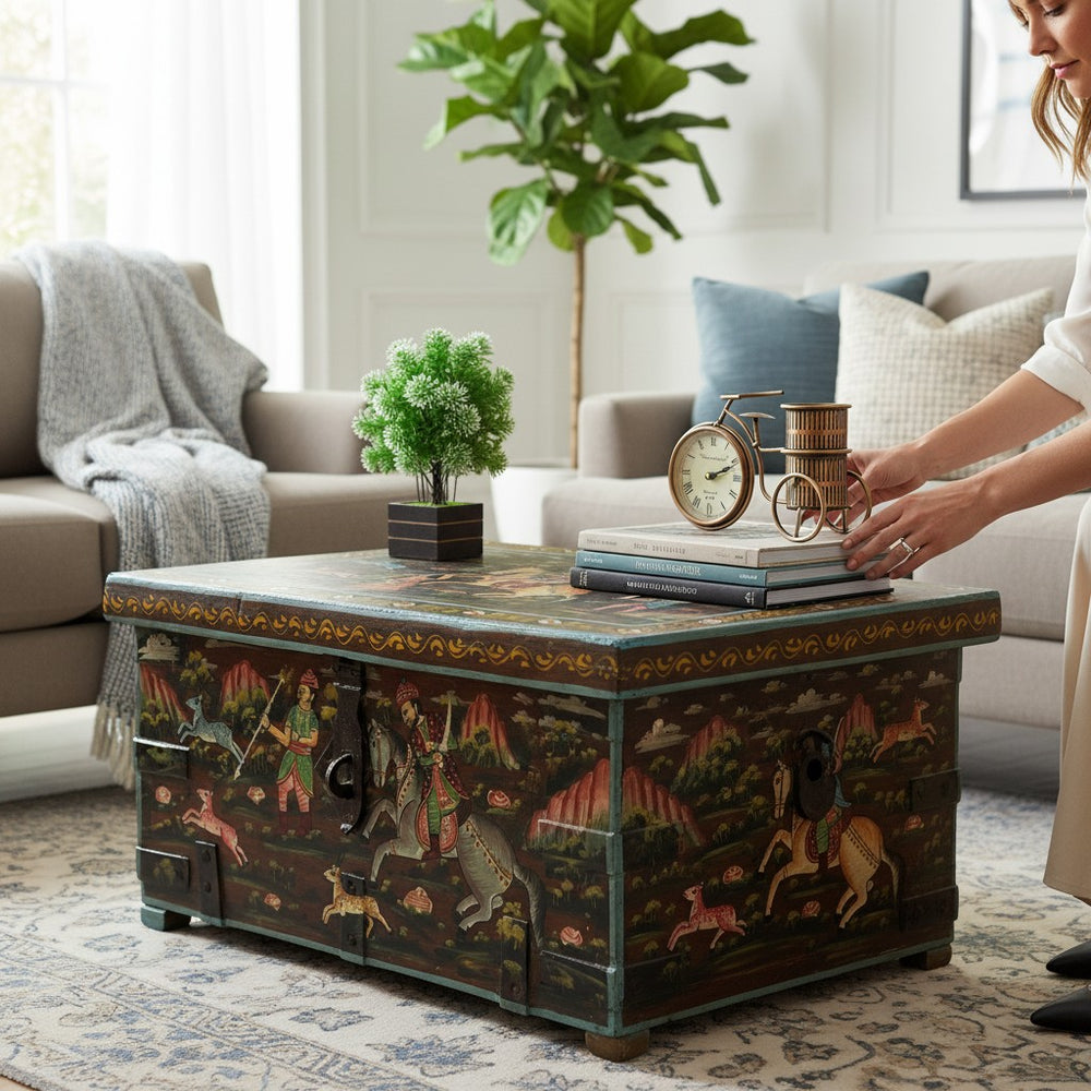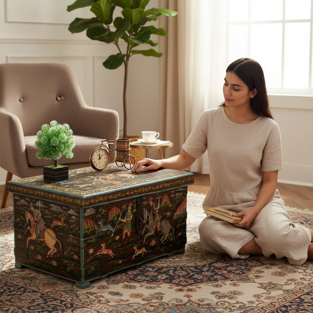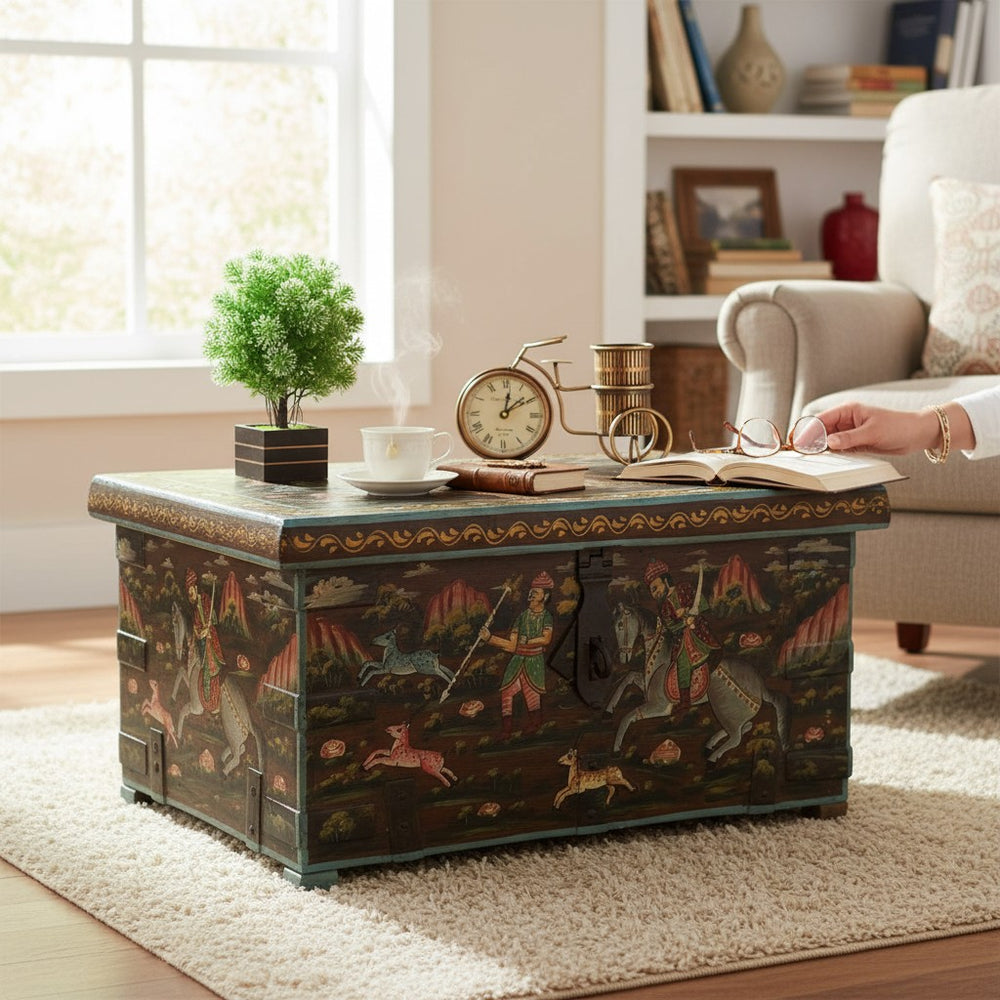 Add charm, culture, and functionality to your living room with this exquisite hand-painted storage trunk. Featuring traditional Rajasthani artwork depicting royal hunting scenes, this trunk doubles as a stylish coffee table and a spacious storage unit. Its rich colors, vintage finish, and artisan detailing make it a standout décor piece while offering a practical solution for organizing blankets, books, games, and everyday essentials. Perfect for creating a warm, heritage-inspired atmosphere in any modern or classic home.