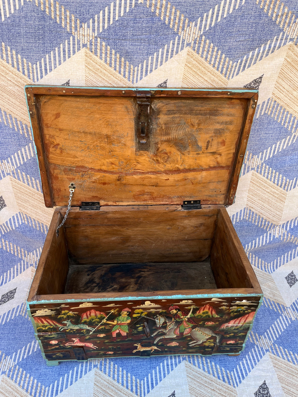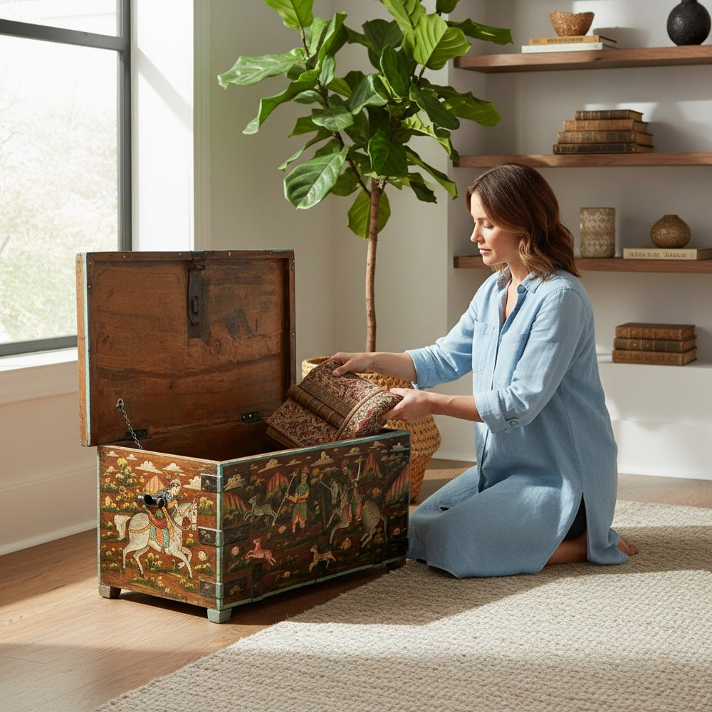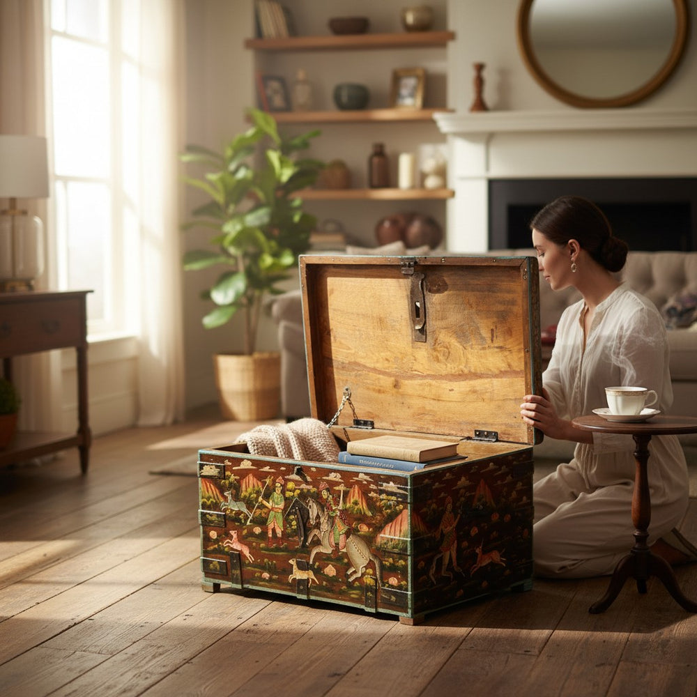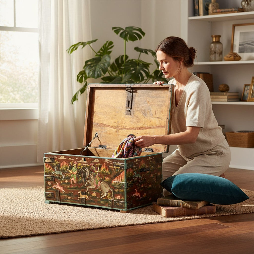 Add charm, culture, and functionality to your living room with this exquisite hand-painted storage trunk. Featuring traditional Rajasthani artwork depicting royal hunting scenes, this trunk doubles as a stylish coffee table and a spacious storage unit. Its rich colors, vintage finish, and artisan detailing make it a standout décor piece while offering a practical solution for organizing blankets, books, games, and everyday essentials. Perfect for creating a warm, heritage-inspired atmosphere in any modern or classic home.