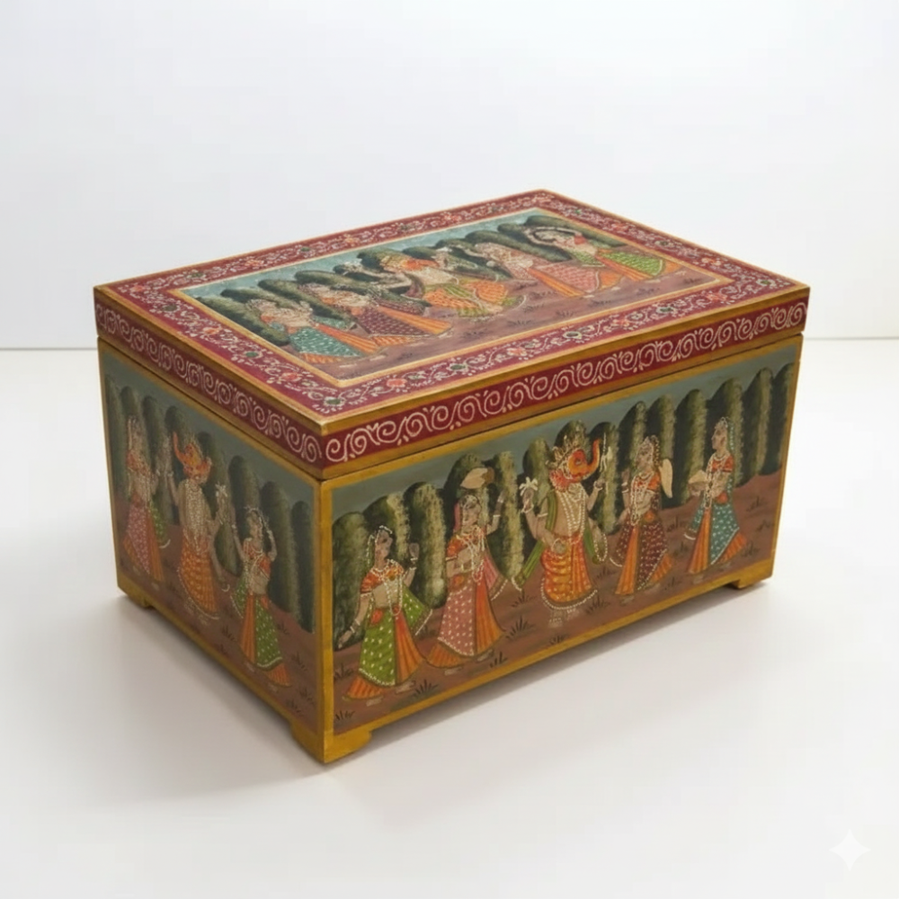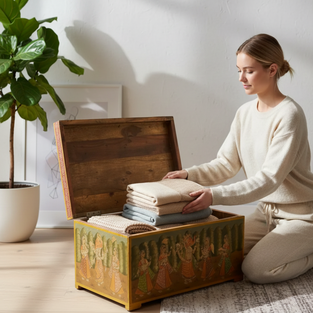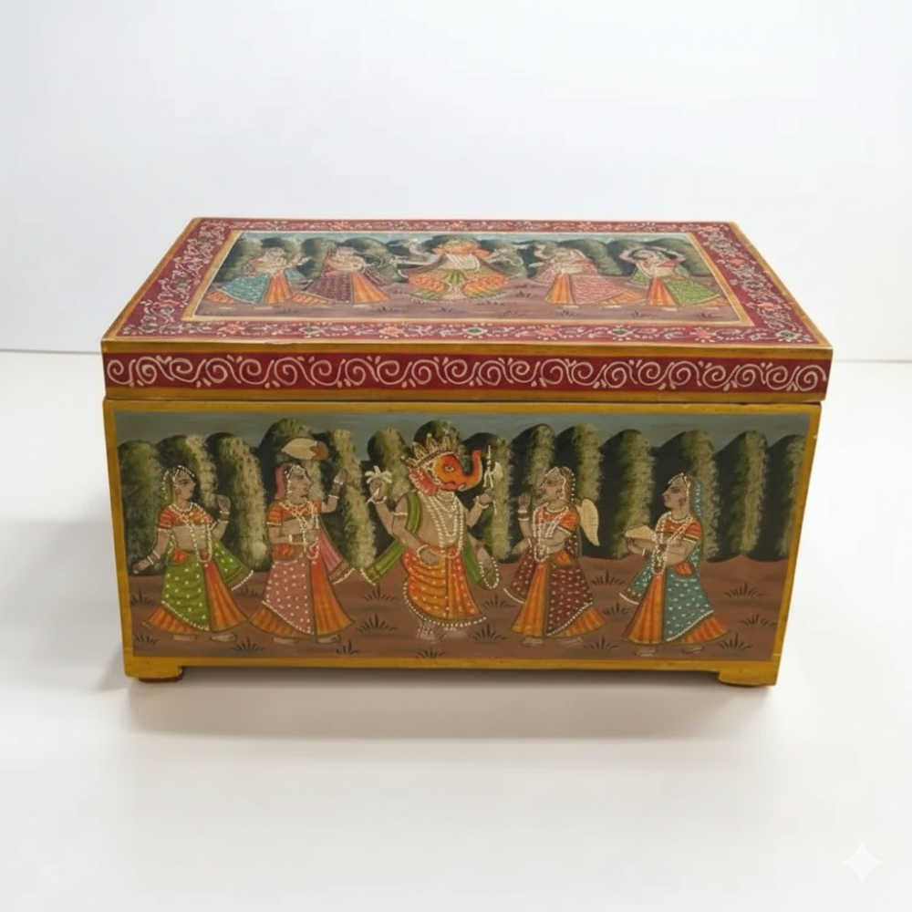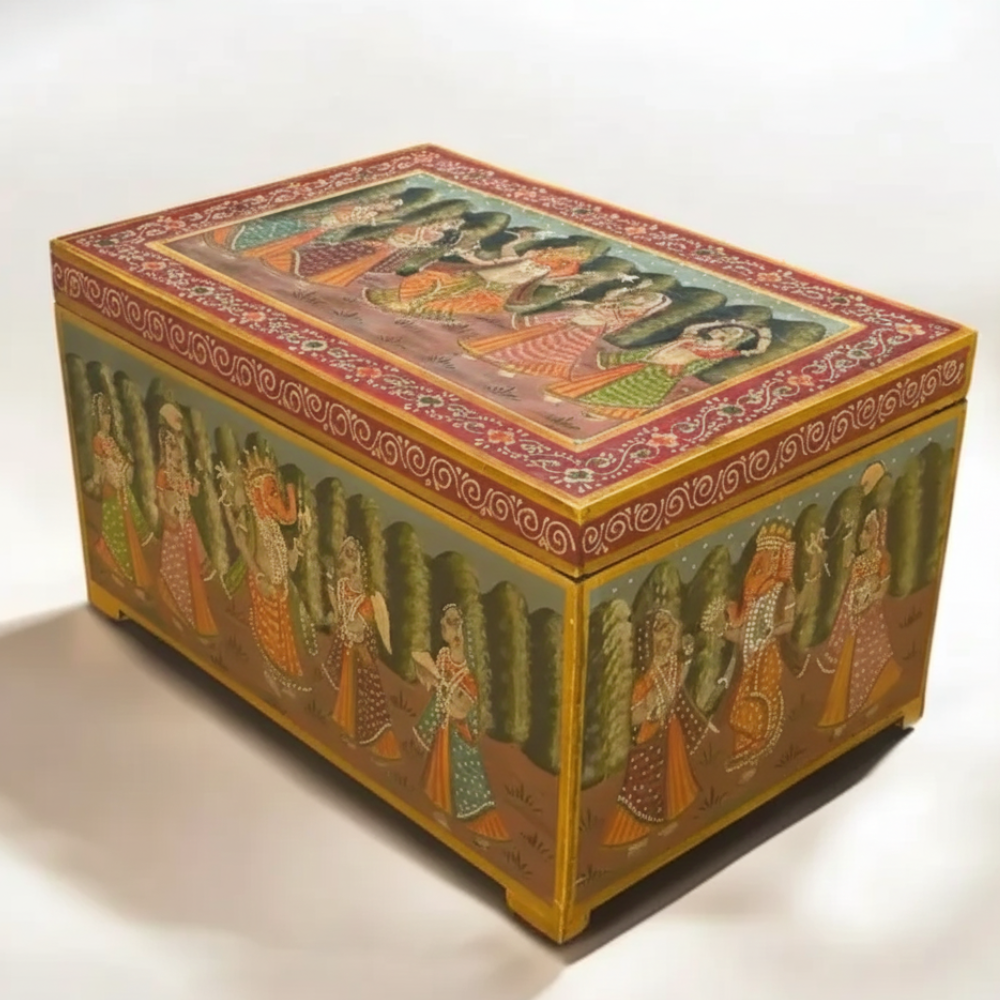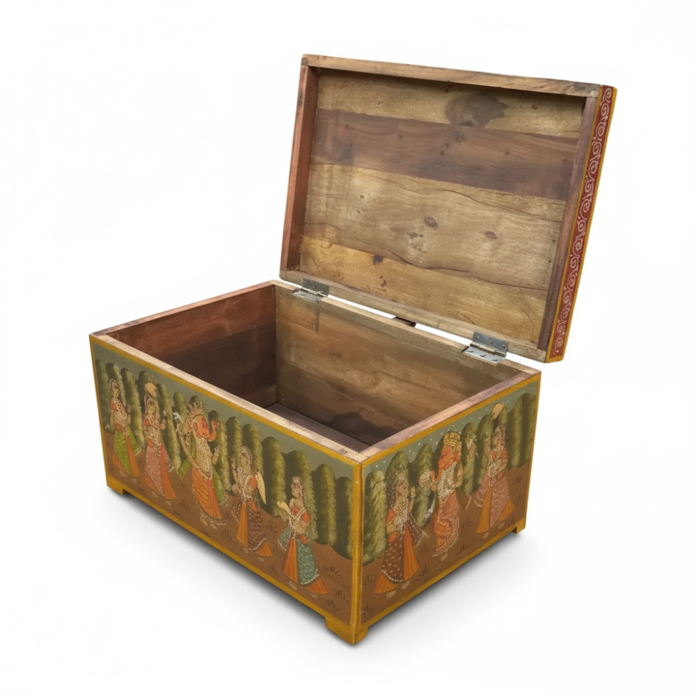 Enhance your home with this beautifully hand-painted wooden storage trunk chest, inspired by traditional Indian art and culture. Featuring exquisite mythological and royal-themed artwork on all sides, this trunk serves as both a functional storage solution and a striking décor piece. Perfect for living rooms, bedrooms, halls, and entryways, it adds a touch of heritage elegance while keeping your essentials—blankets, clothes, books, toys, or collectibles—neatly organized. Its handcrafted charm makes it a standout addition to boho, vintage, ethnic, and classic interiors.