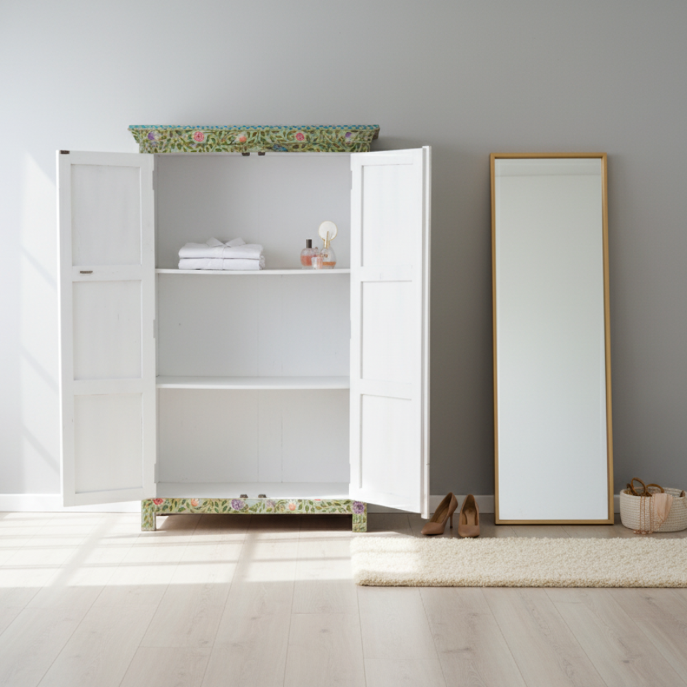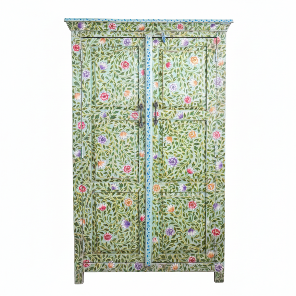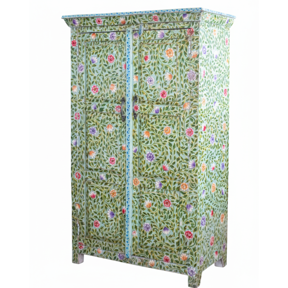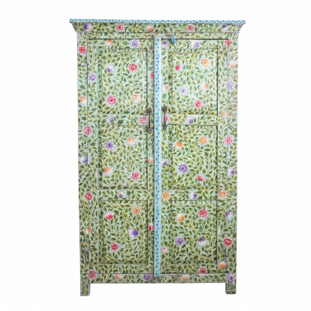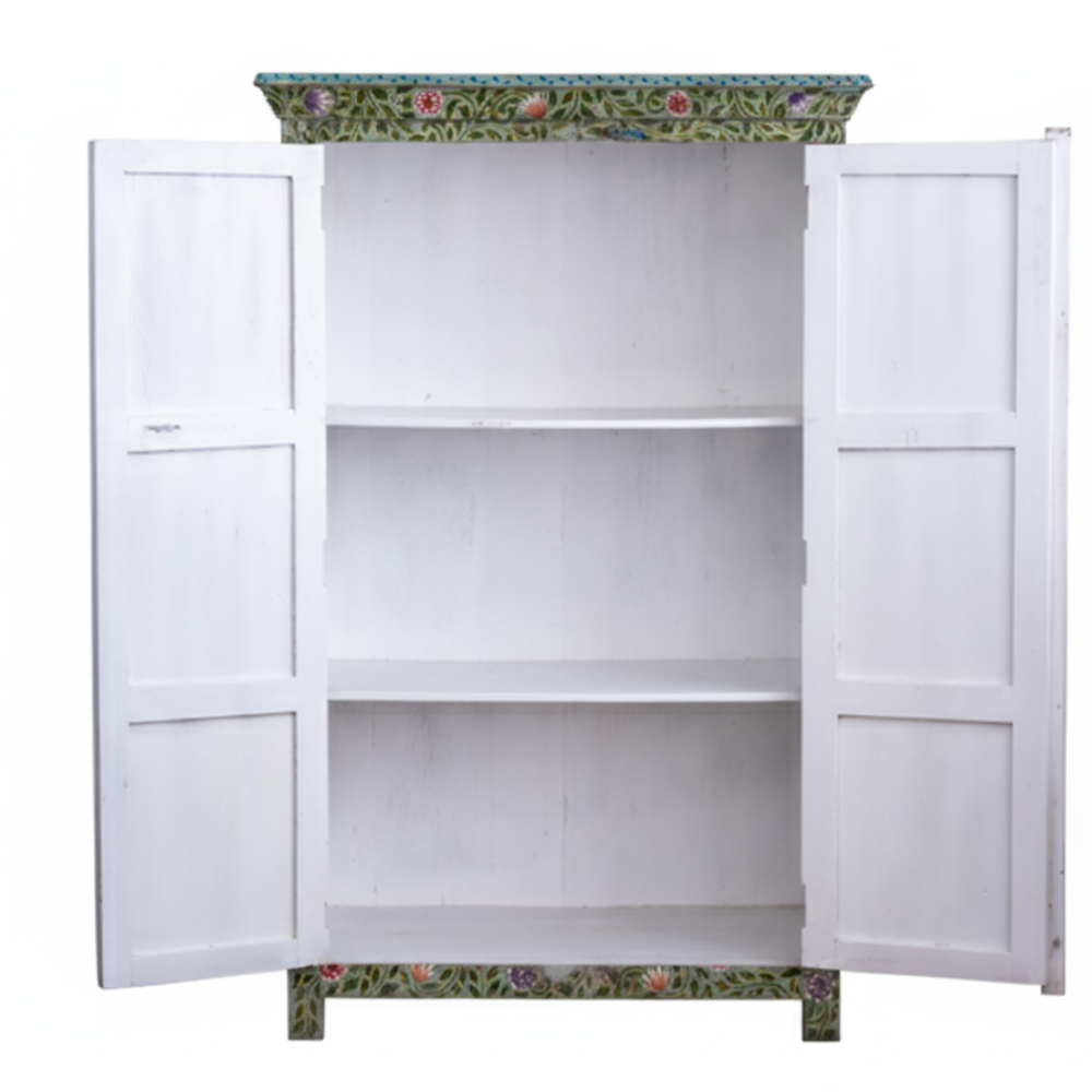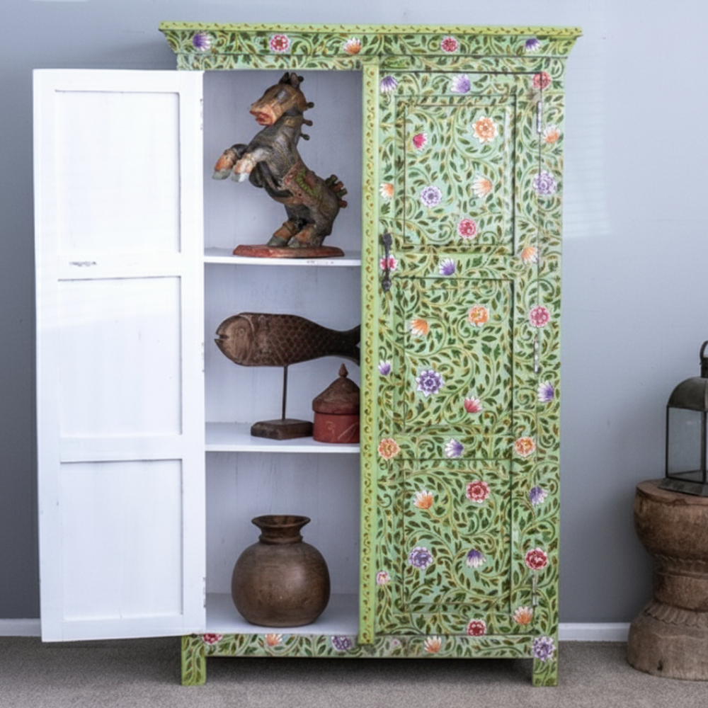 Bring a splash of traditional Indian artistry into your home with this hand-painted tallboy cabinet, beautifully crafted from durable solid mango wood. The entire surface is adorned with vibrant floral patterns in green, red, orange, and purple hues, inspired by Rajasthan’s ethnic folk art. This tall storage cabinet not only adds an artistic charm to your décor but also provides ample storage space with multiple interior shelves for organizing essentials neatly.