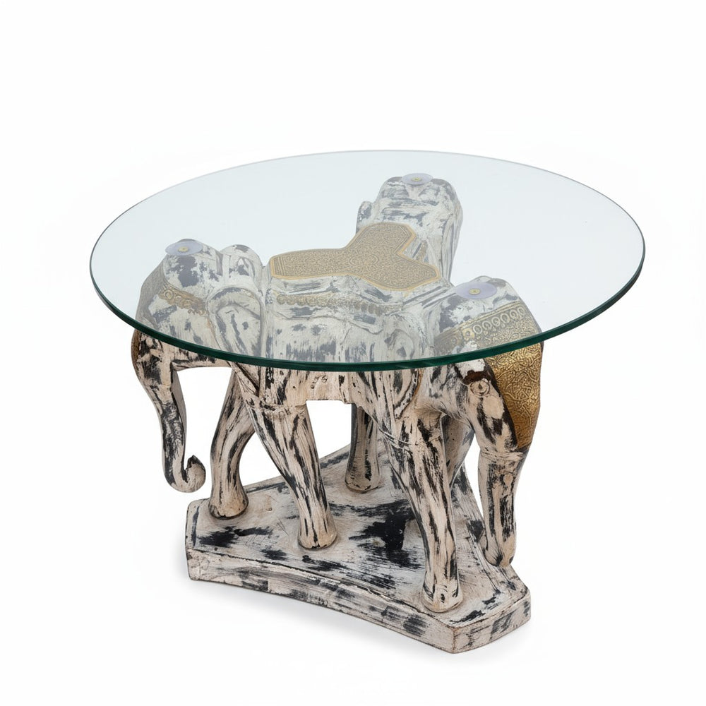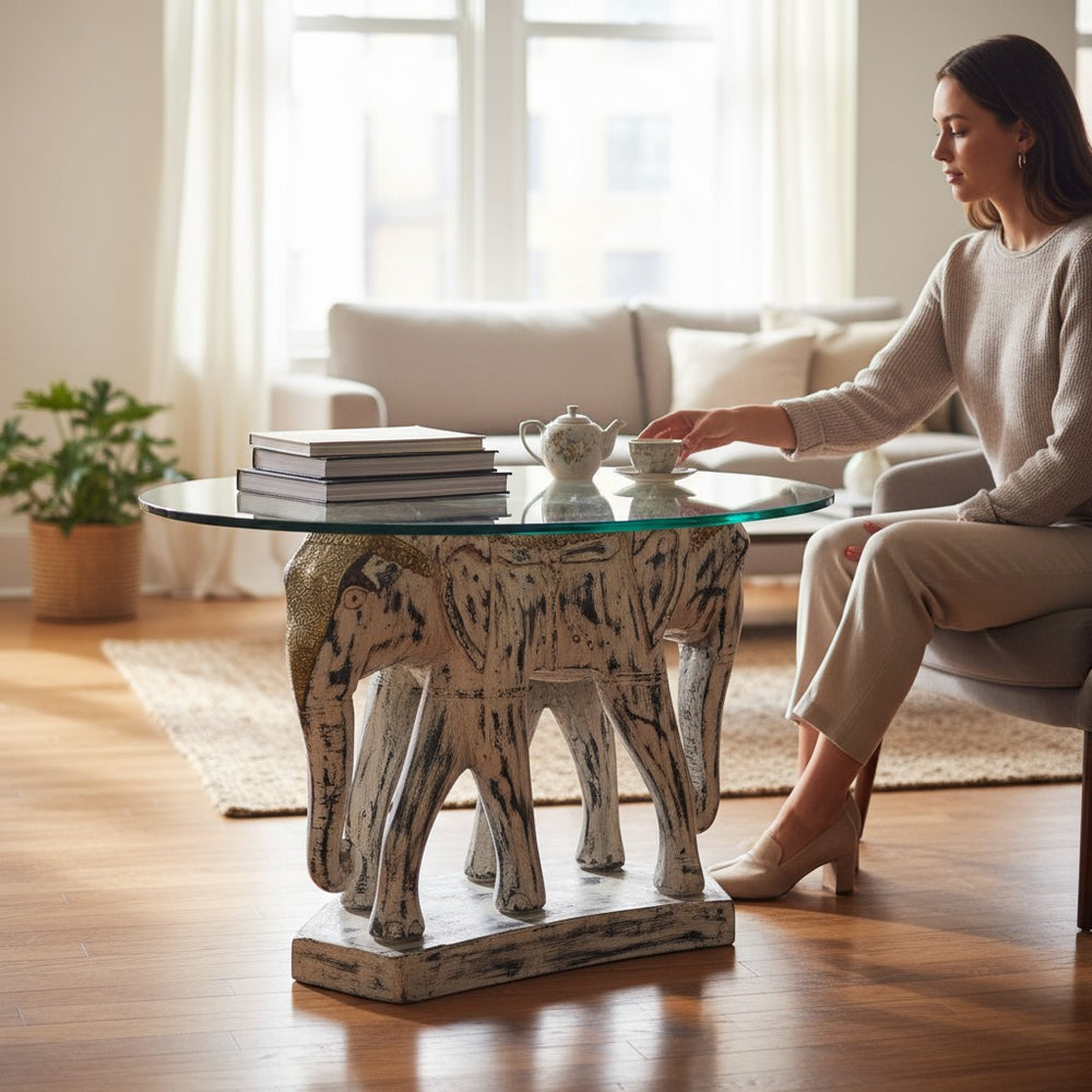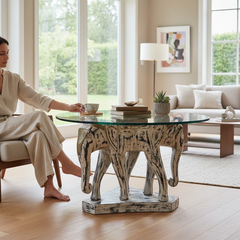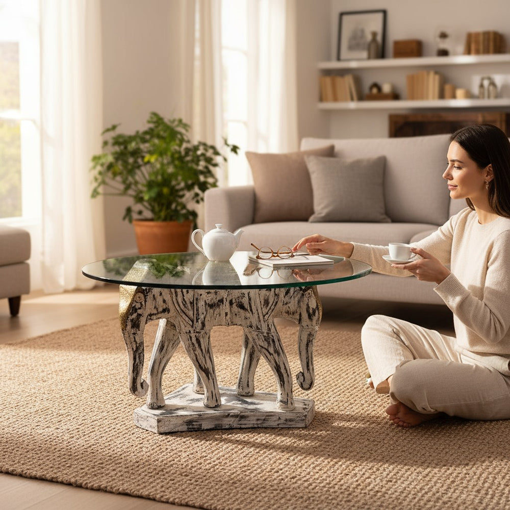 Enhance your living space with this stunning handcrafted Indian Elephant Coffee Table, featuring intricately carved wooden elephant figures supporting a premium round glass top. This artistic centerpiece adds cultural elegance and a touch of global charm to modern, boho, eclectic, and traditional interiors. Perfect for creating a warm, inviting, and conversation-worthy atmosphere in any home.