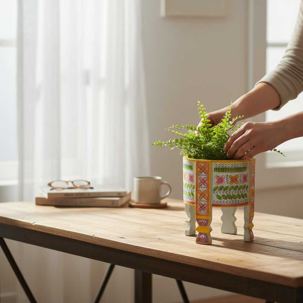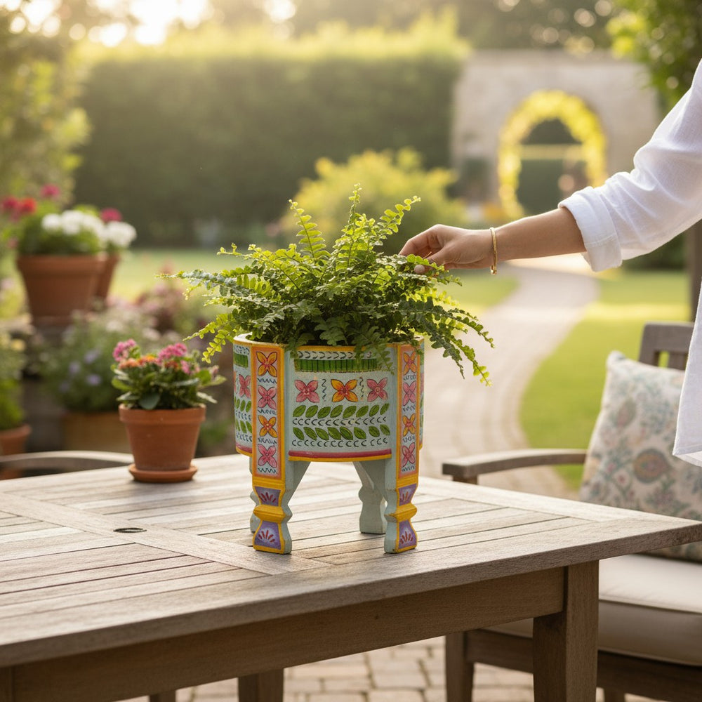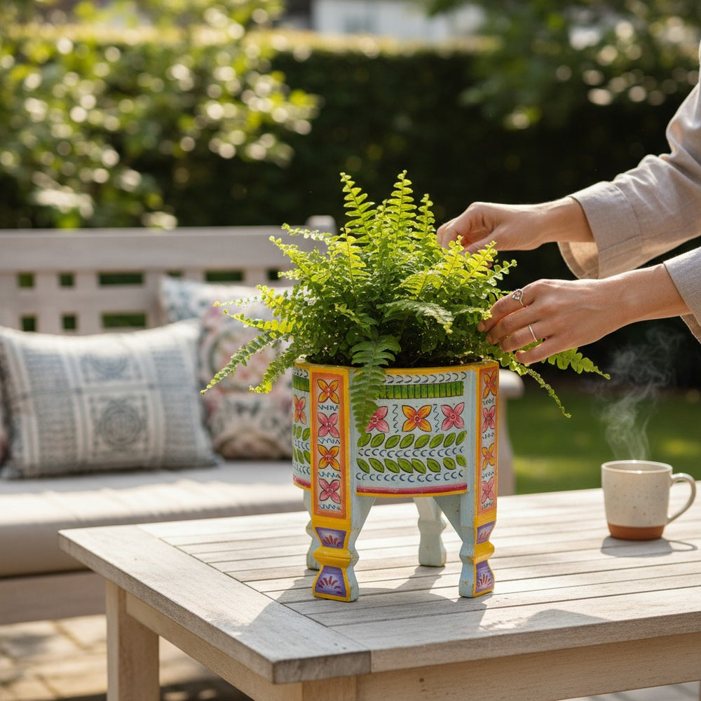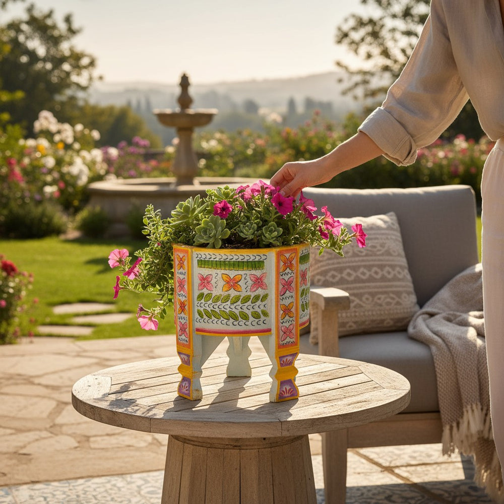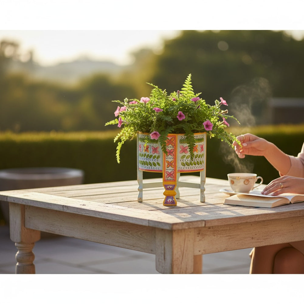 Add a burst of colour and artistic charm to your indoor or outdoor spaces with this Hand-Painted Round Planter Chakki Table. Inspired by traditional Indian grinder tables, this elevated planter stand brings a joyful fusion of culture and nature into any home. Whether placed in the living room, balcony, patio, garden, or sun room, it instantly brightens the ambience with its floral motifs and handcrafted detailing. Perfect for plant lovers, decor enthusiasts, and those who enjoy warm, vibrant, globally-inspired home styling.