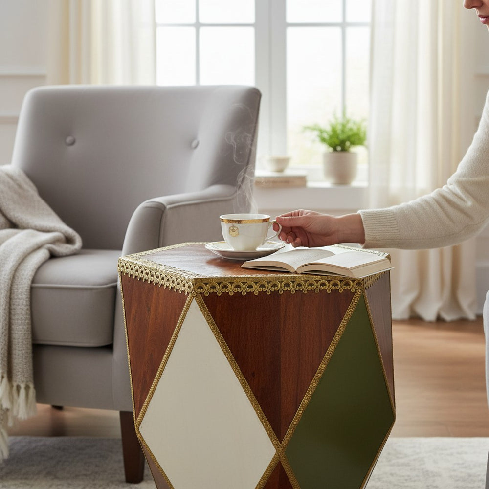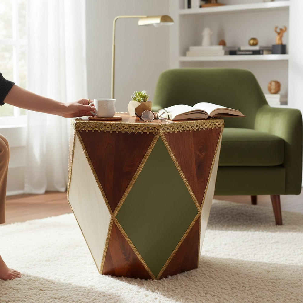 Add a bold artistic touch to your living room with this handcrafted geometric coffee table, designed to stand out as a statement décor piece. Its unique multi-faceted shape, rich wood grains, and colorful diamond panels create a modern yet traditional fusion that enhances any contemporary, boho, or eclectic interior. Perfect as a coffee table, accent table, or decorative center piece, it brings warmth, creativity, and handcrafted charm to your home.