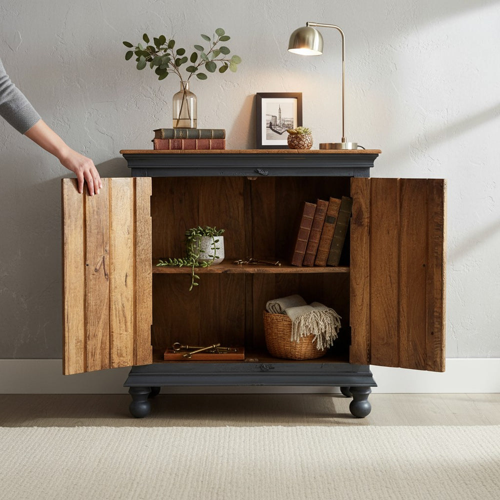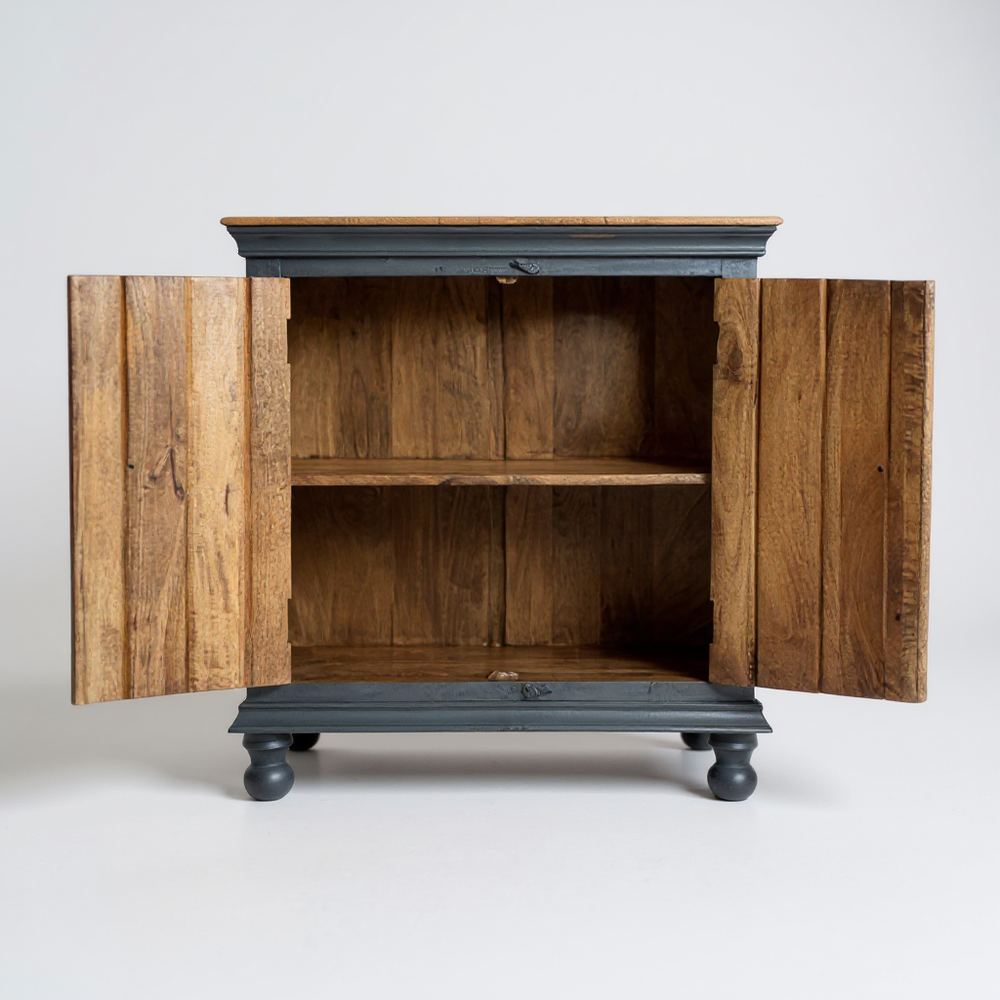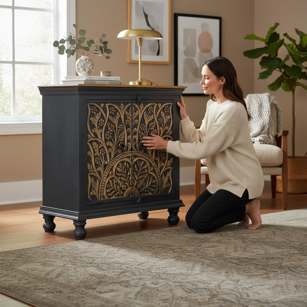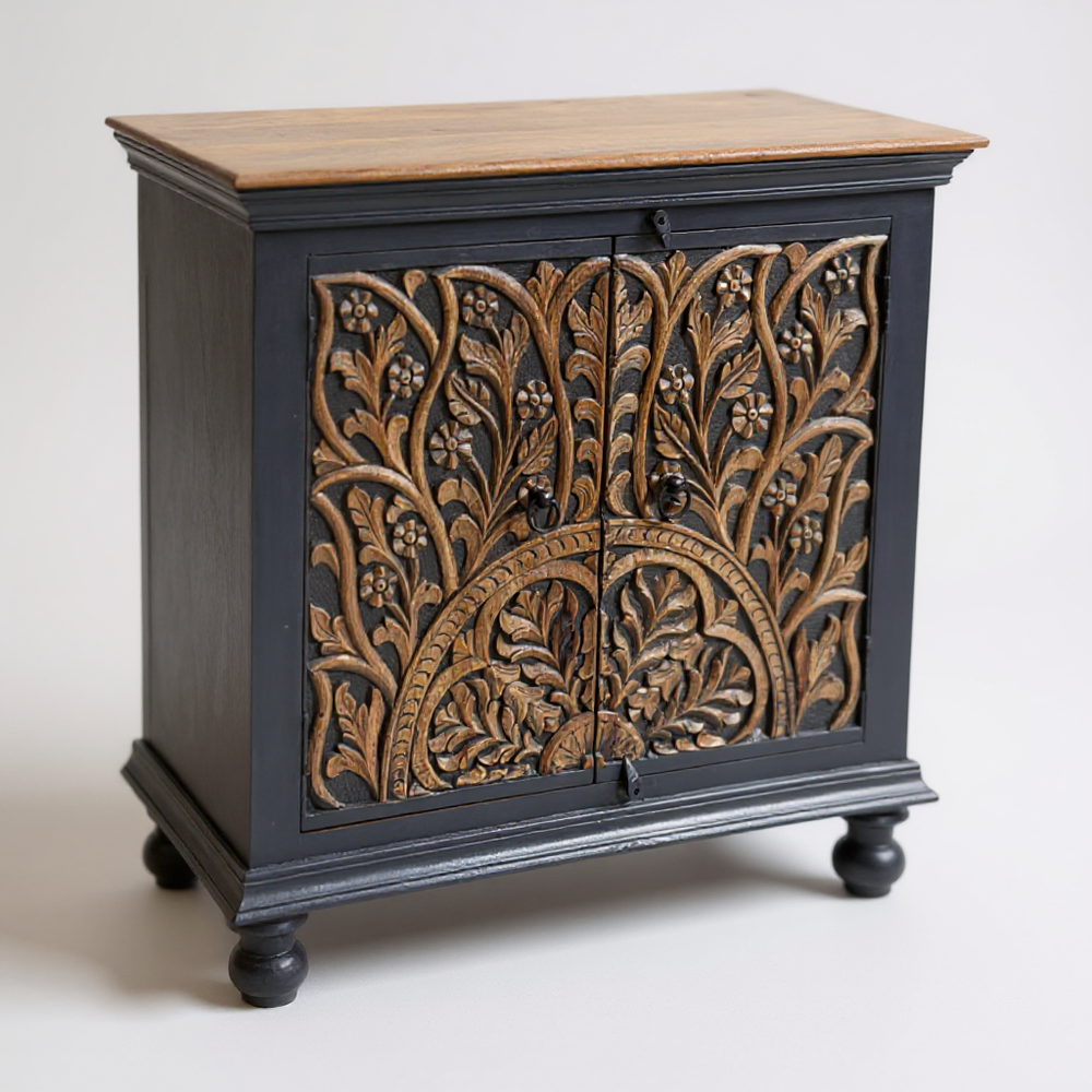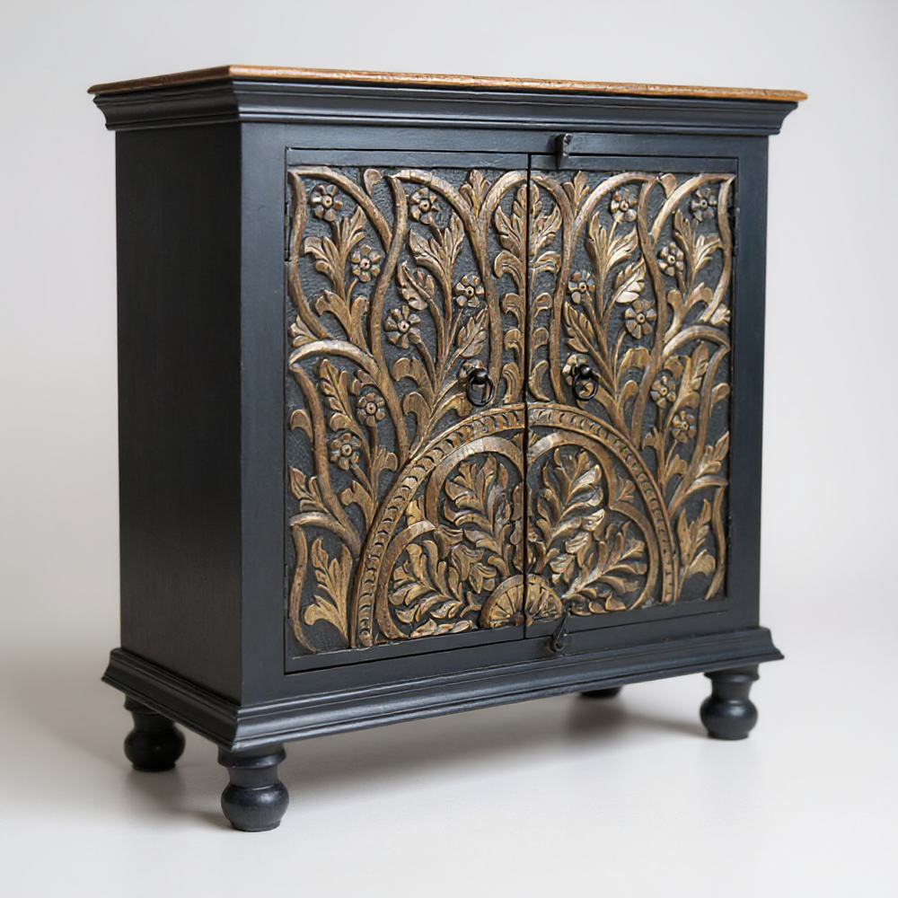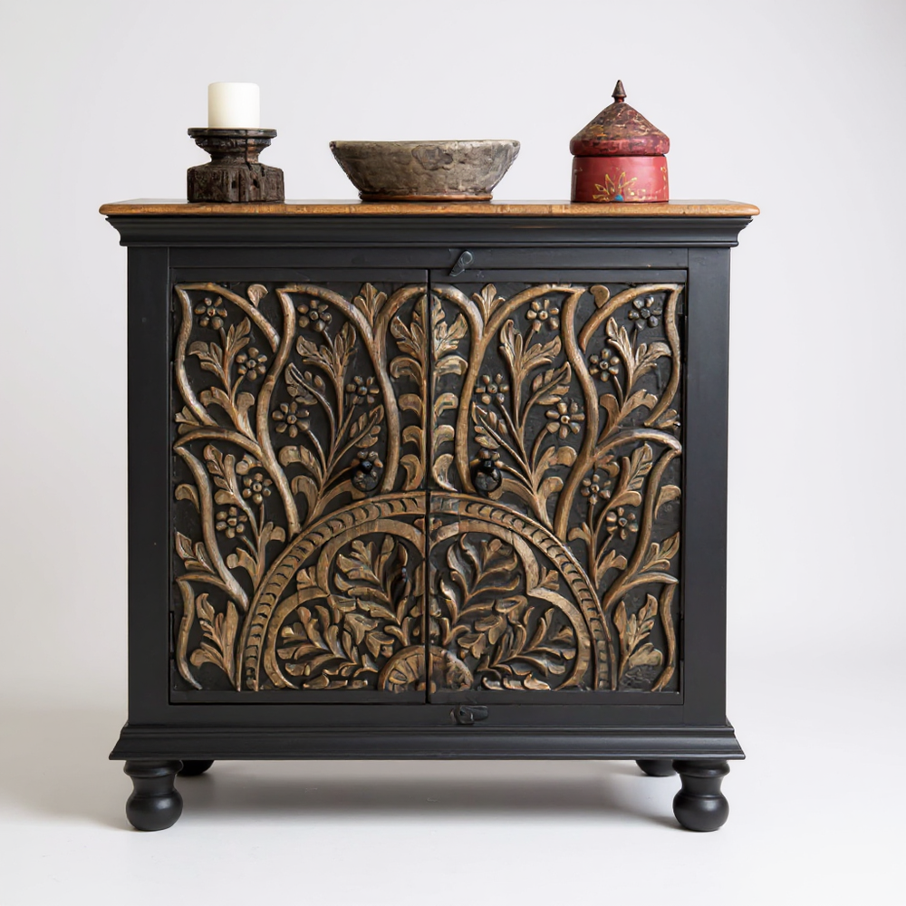 The rich dual-tone finish combines matte black and warm natural wood hues, highlighting the depth and detail of the floral carvings. Standing on turned wooden legs and topped with a smooth wooden surface, this sideboard is both visually striking and highly functional. It features two large cabinet doors with interior shelving, perfect for organizing tableware, books, or personal décor items.