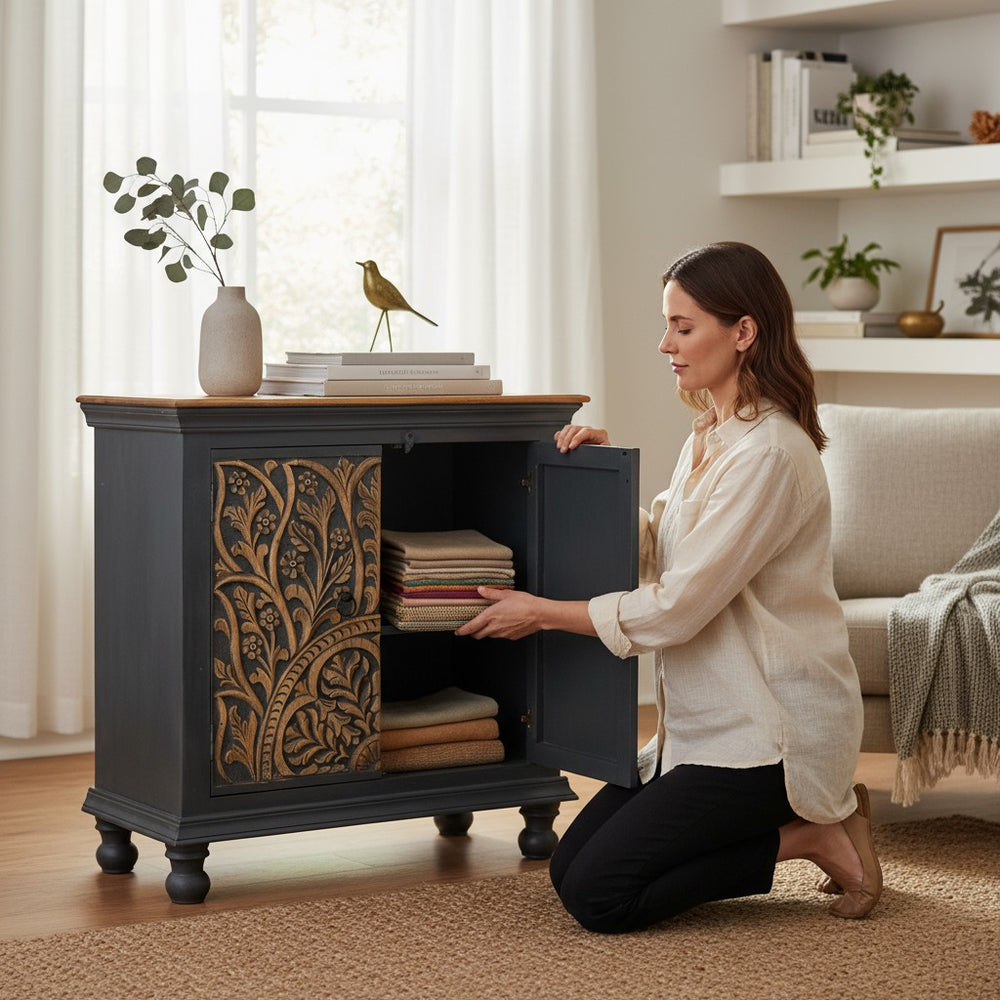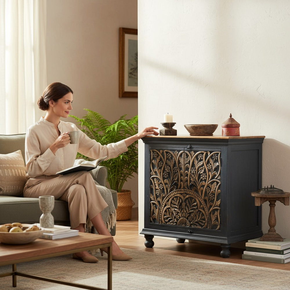 Enhance your home with the natural elegance of this Black Lotus Hand-Carved Wooden Sideboard, a masterpiece that embodies timeless Indian craftsmanship and modern rustic charm. Handcrafted from solid mango wood, this cabinet showcases intricate lotus flower carvings on its front panels — a traditional symbol of purity, growth, and beauty.