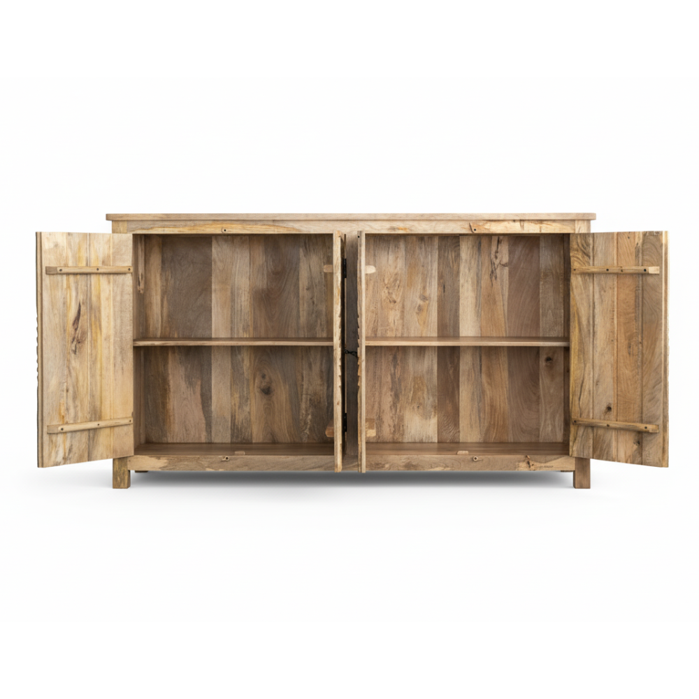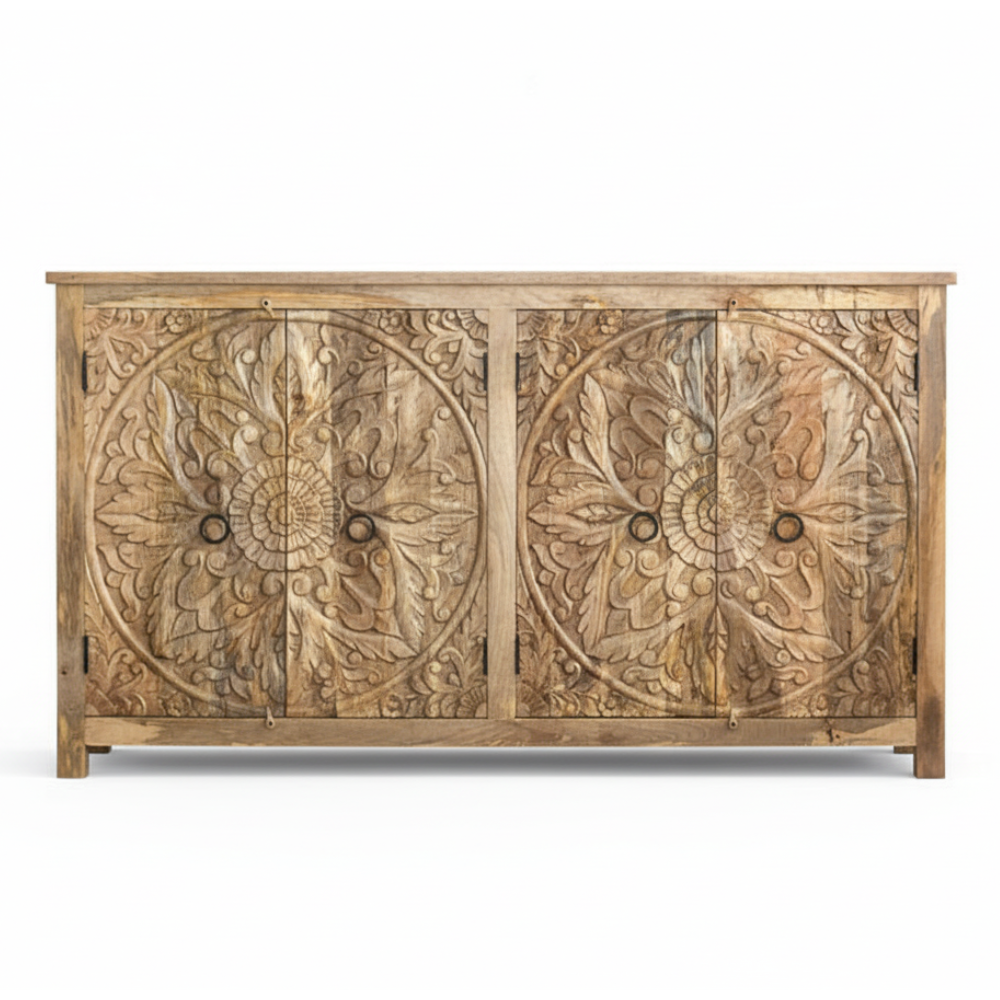 Elevate your home with the natural beauty of this stunning Mandala Carved Sideboard, designed to be the centerpiece of any room. Handcrafted from solid wood, it features two oversized mandala carvings that instantly draw attention with their depth, artistry, and organic detail. The warm natural finish gives the sideboard a grounded, earthy feel—perfect for boho, rustic, modern, or neutral interiors.