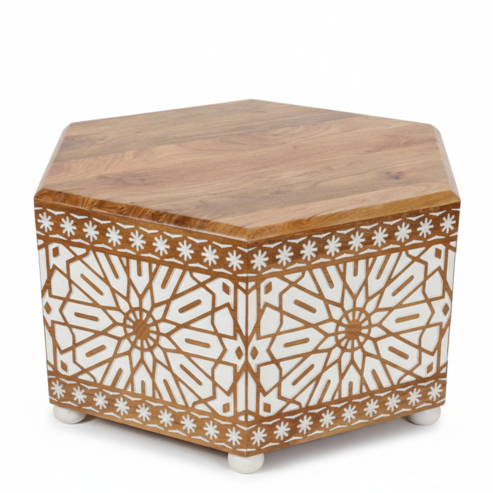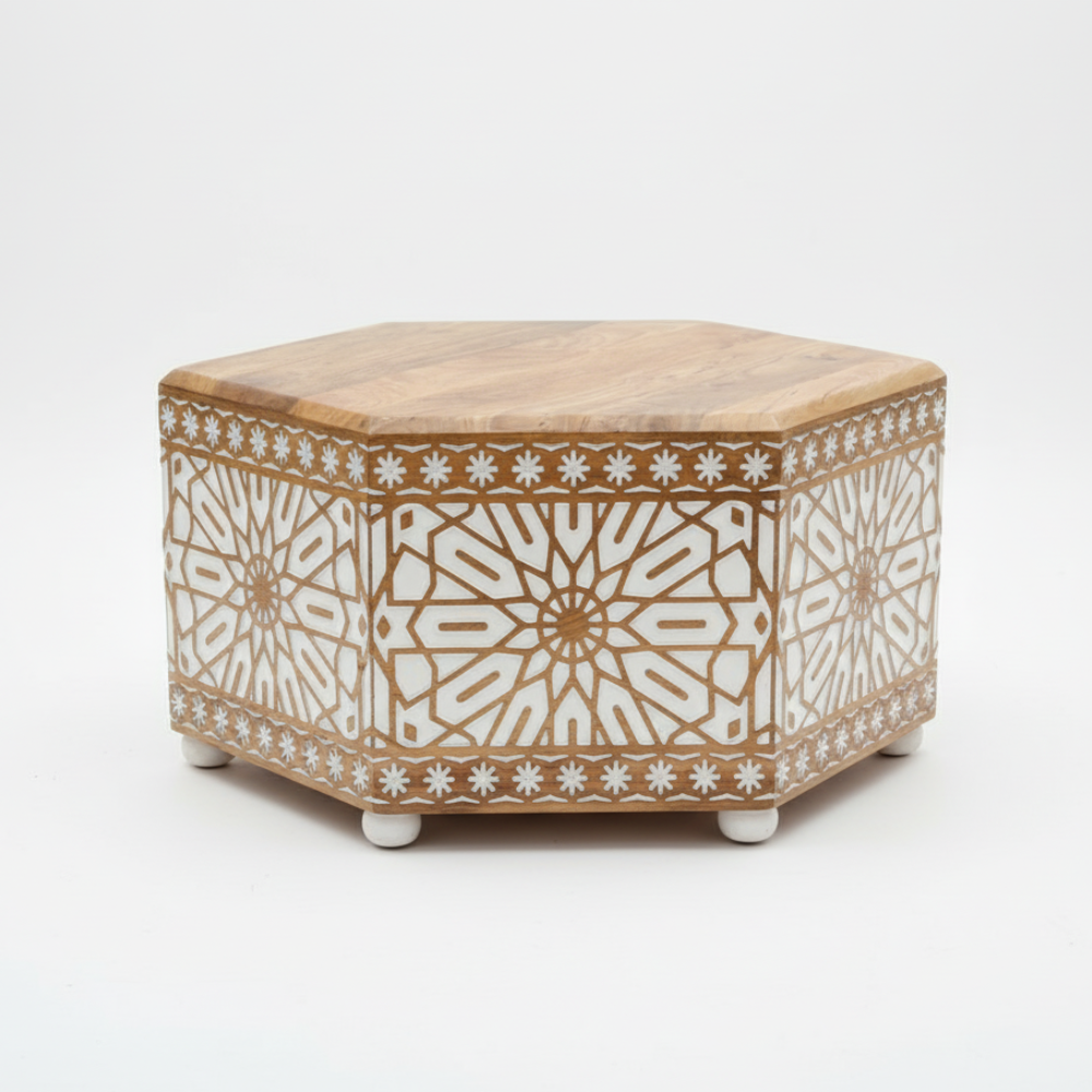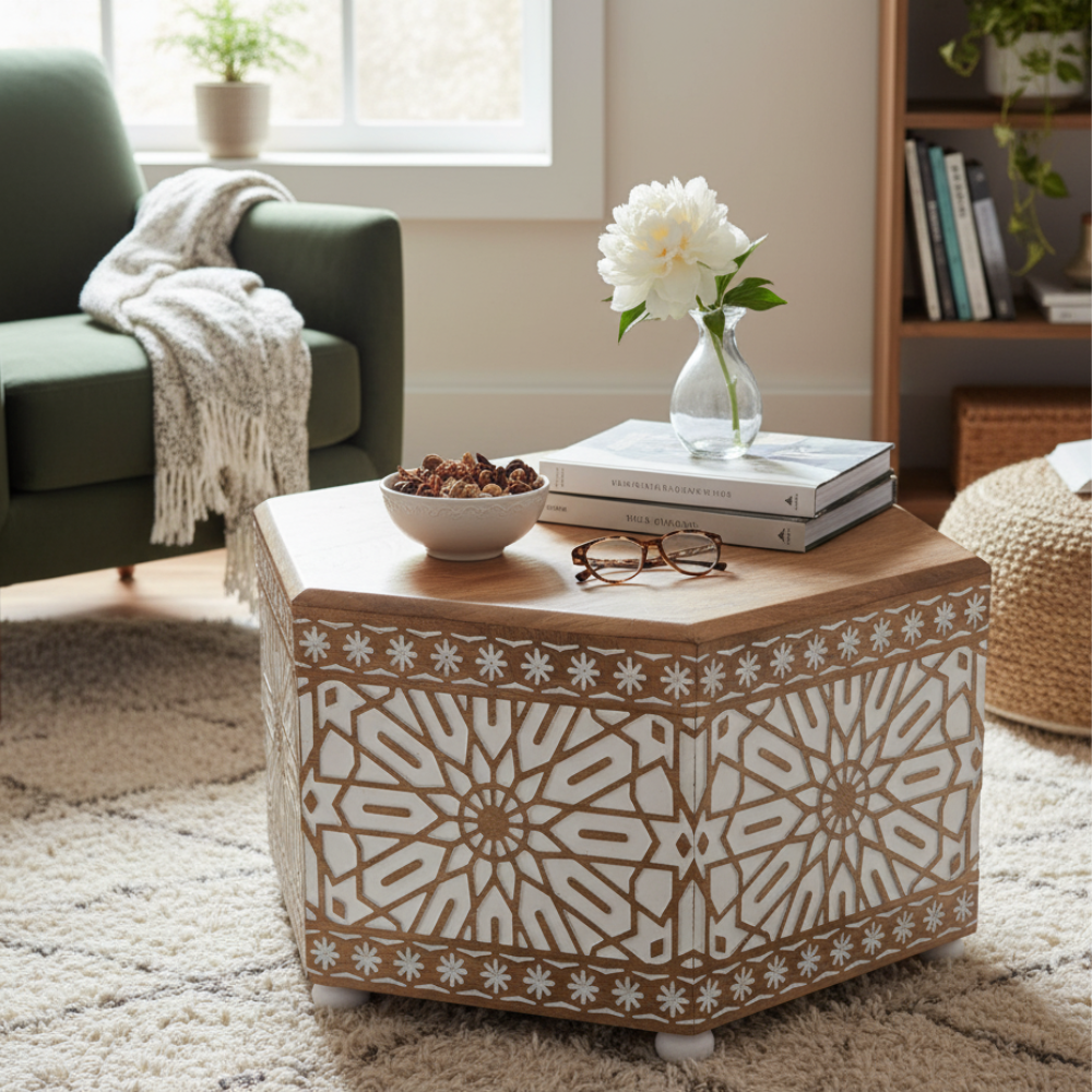 Bring an artistic flair to your living space with this hexagonal handcrafted coffee table by Viratra Art Decor, a stunning blend of Indian craftsmanship and Moroccan-inspired design. Made from premium solid mango wood, this unique table showcases an intricate geometric star motif carved and finished in natural wood with white detailing, creating a striking yet balanced look.