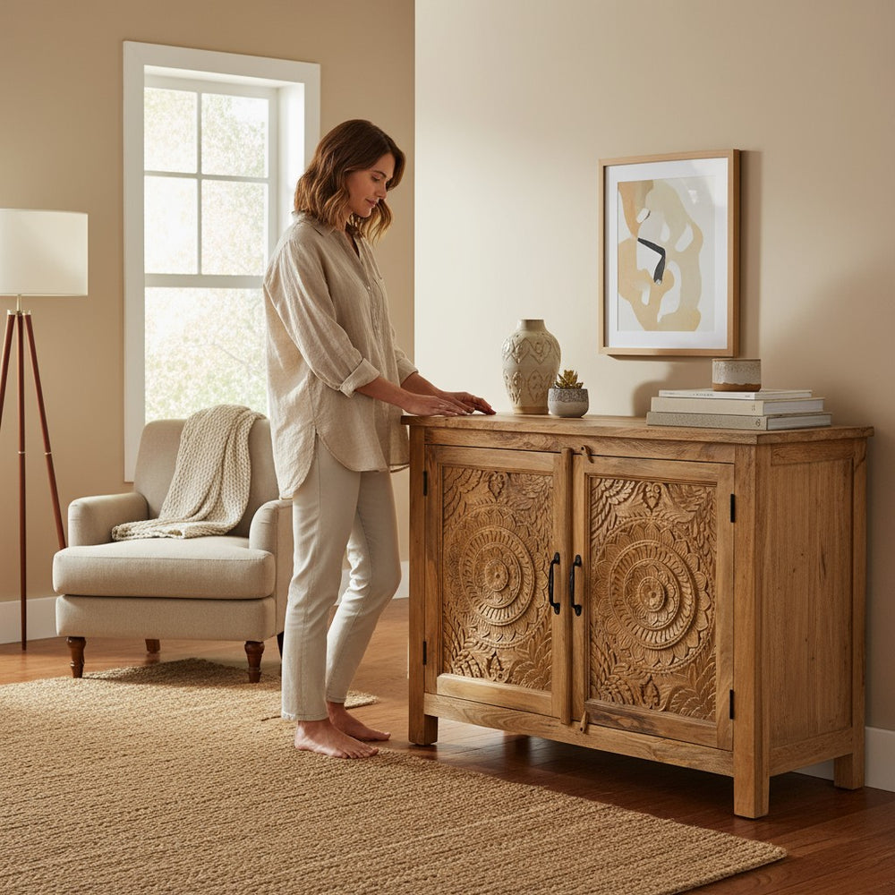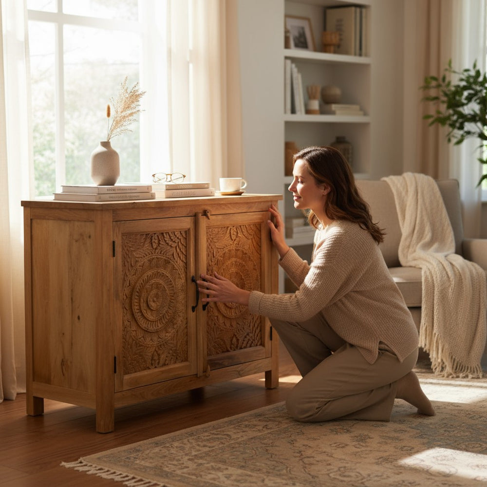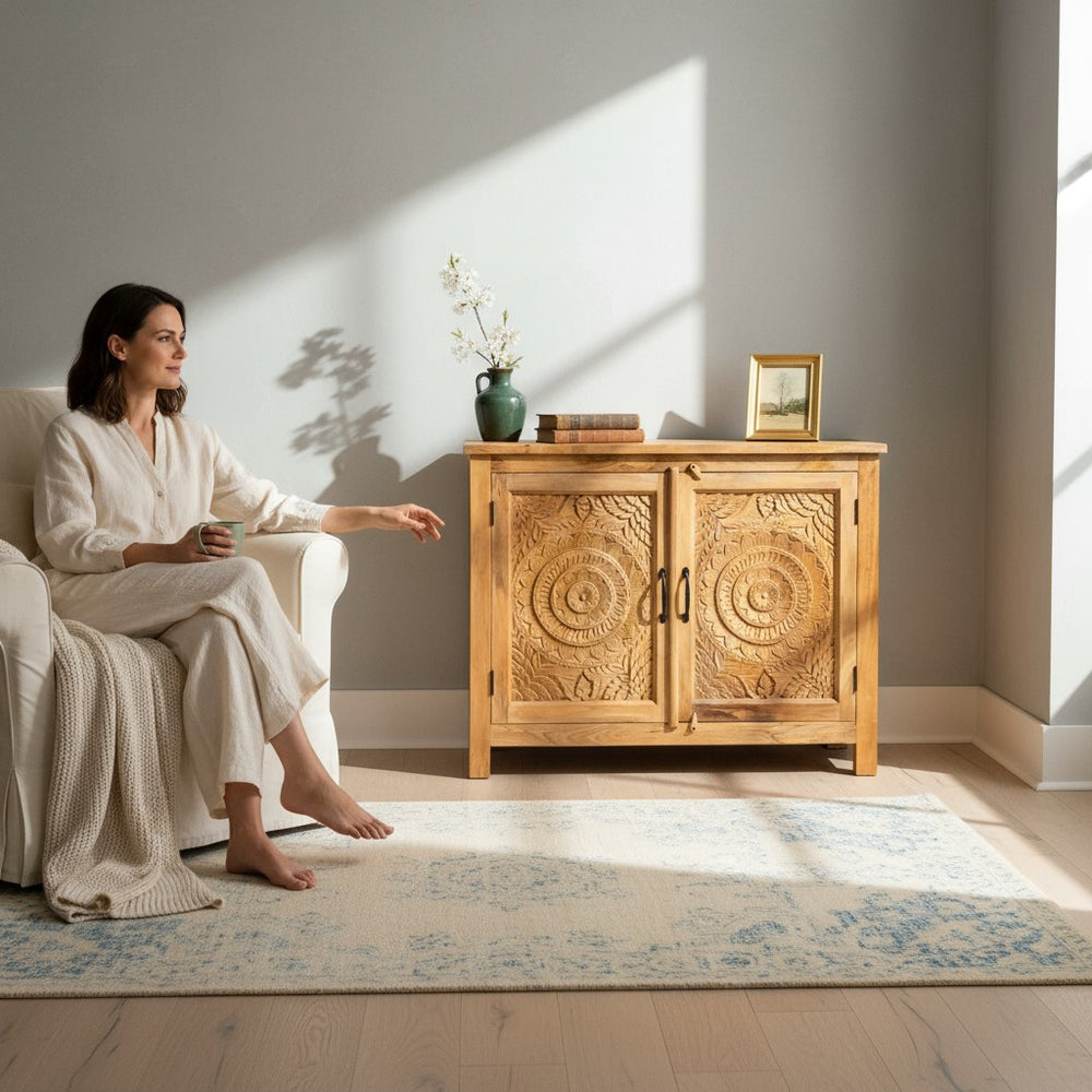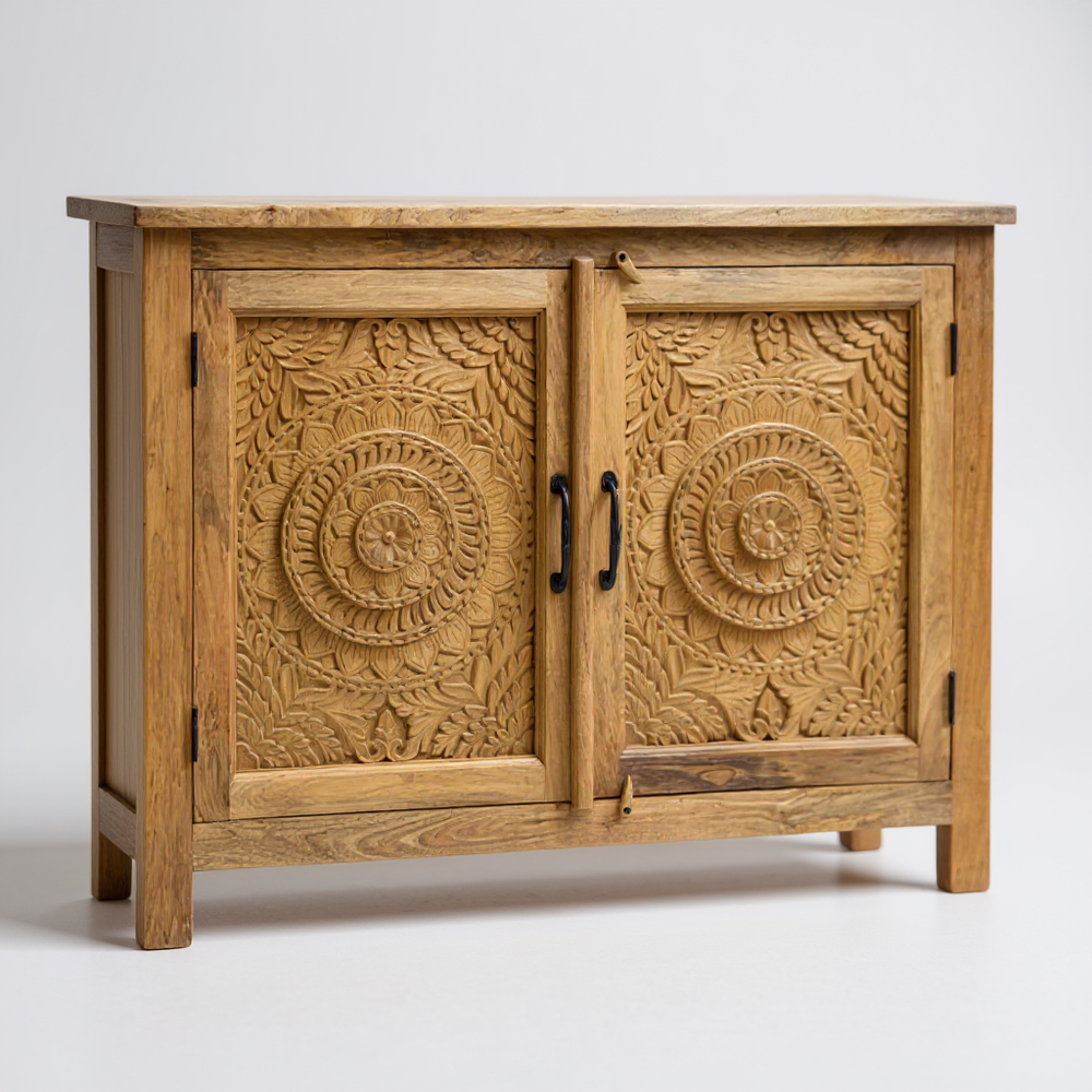 Each door features a mesmerizing mandala-inspired circular carving surrounded by leaf motifs, giving this cabinet a truly bohemian and ethnic touch. The natural wood grain with a light, smooth finish enhances its rustic charm while retaining the authentic beauty of solid wood.