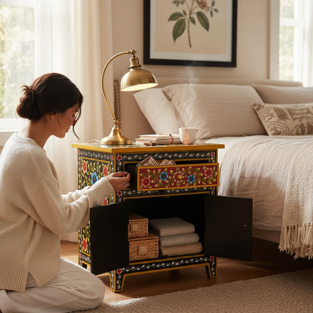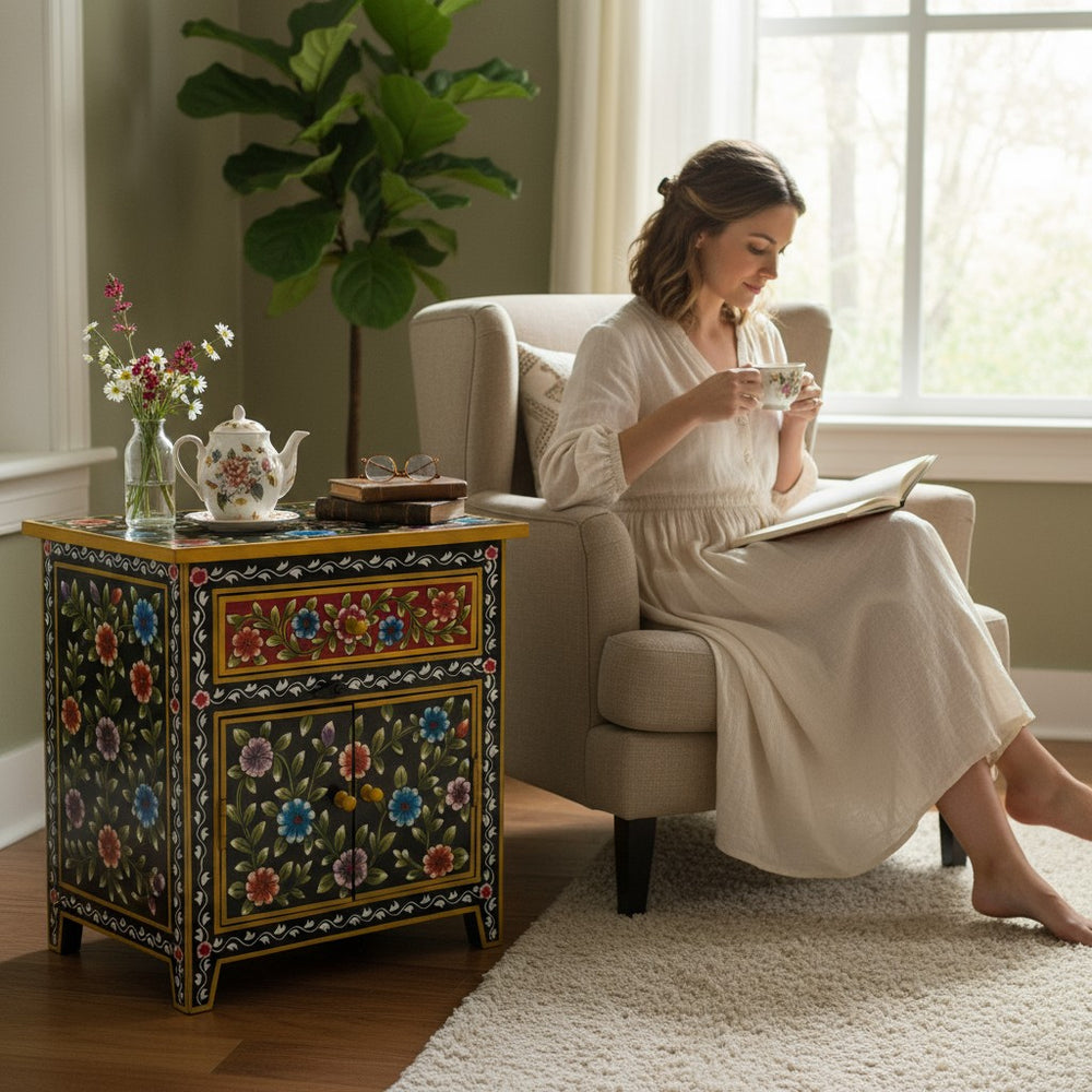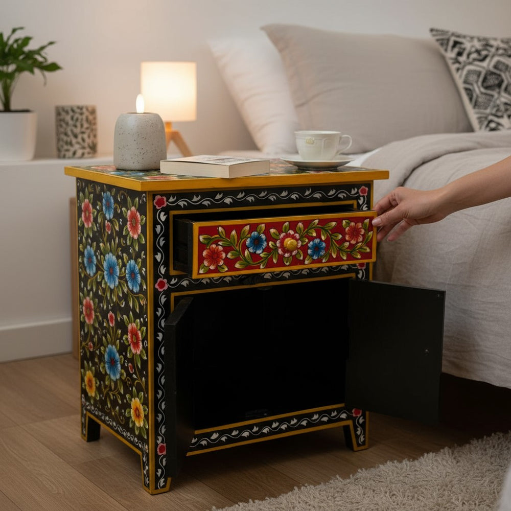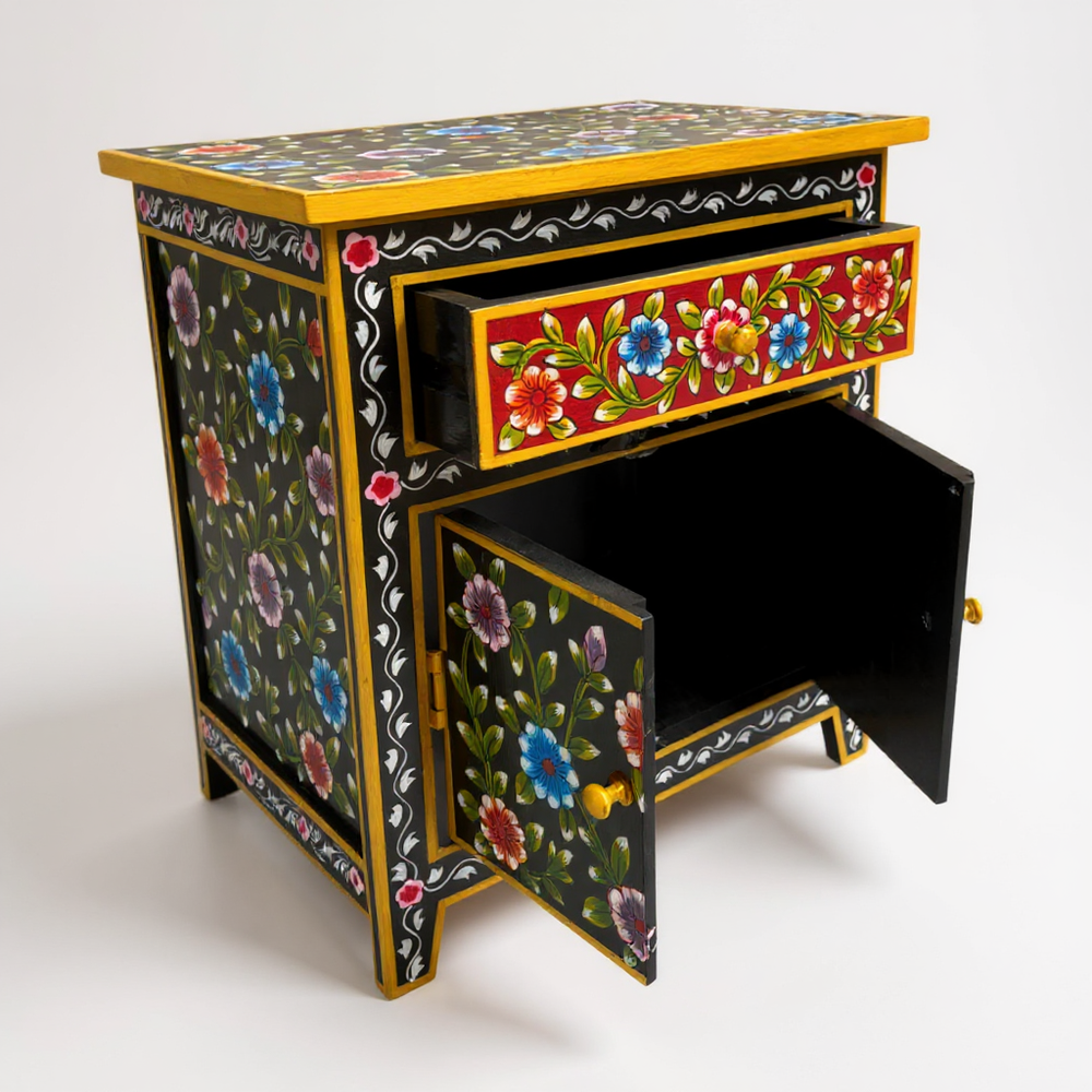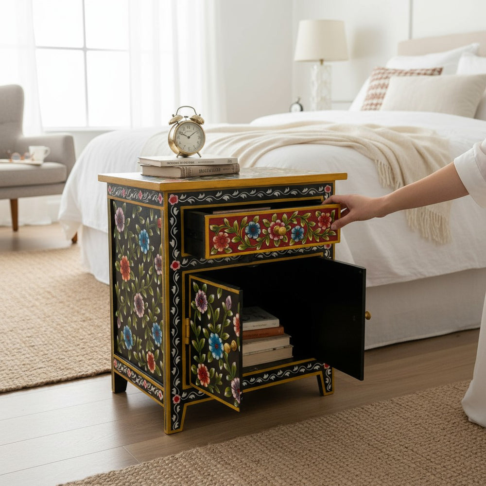 Bring a burst of artistic charm into your living space with this exquisitely hand-painted floral bedside table, a perfect blend of traditional craftsmanship and modern home styling. Whether placed beside a cozy armchair, in a serene reading nook, or next to your bed, this vibrant cabinet adds warmth, color, and character to any room. Its richly detailed floral artwork and elegant black base make it an eye-catching accent piece that enhances boho, eclectic, contemporary, and culturally inspired interiors. Both functional and decorative, it serves as a stylish companion for your morning coffee, nighttime essentials, or treasured keepsakes.