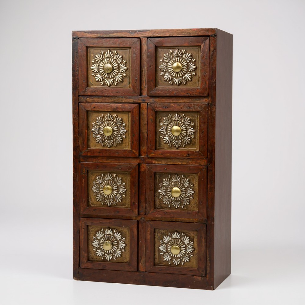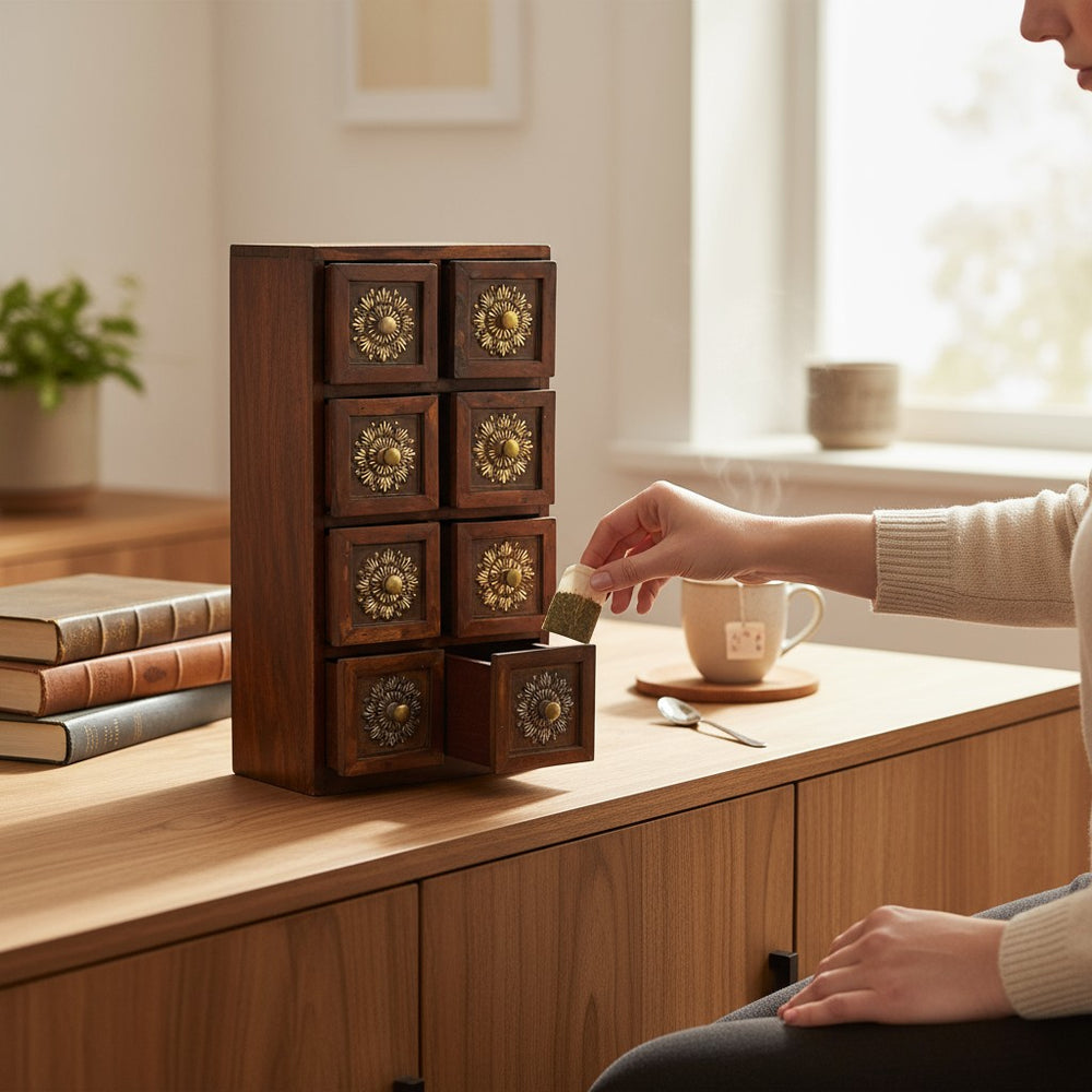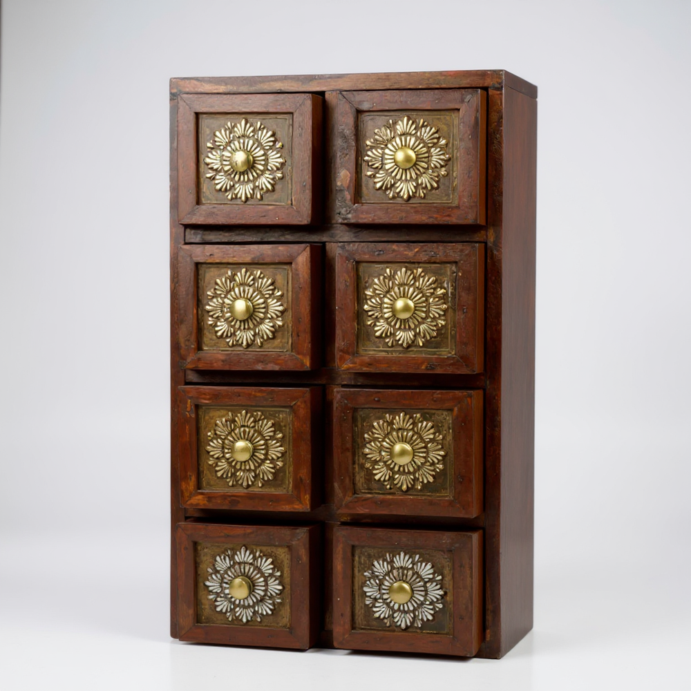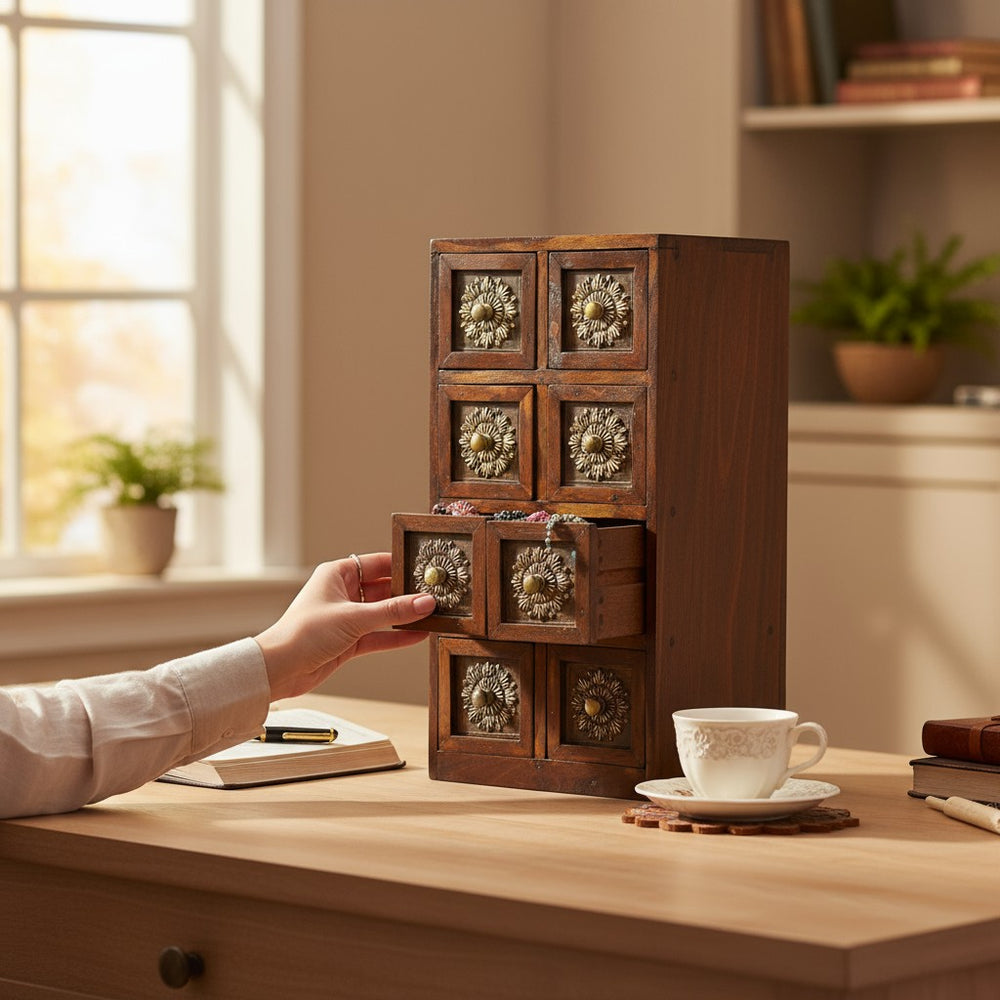 Add charm, organization, and artisan beauty to your home with this handcrafted table drawer chest. Featuring eight compact drawers adorned with ornate brass floral embossing, this piece blends vintage character with modern practicality. Perfect for storing jewelry, keepsakes, stationery, essential oils, or small collectibles, it fits seamlessly on a desk, console, side table, or shelf. Its warm wooden finish and detailed craftsmanship make it a standout decorative accent for living rooms, bedrooms, offices, and creative studios worldwide.